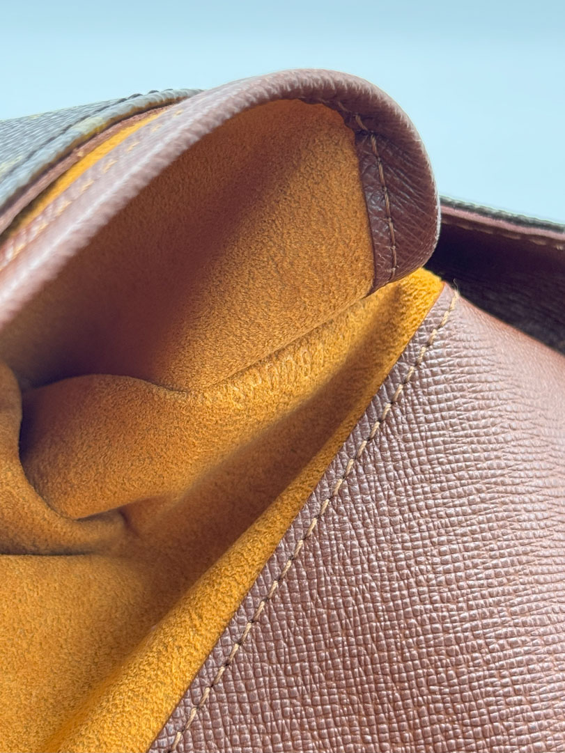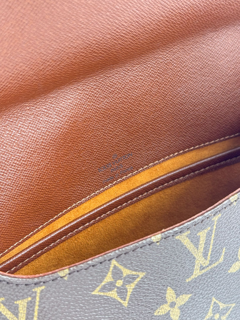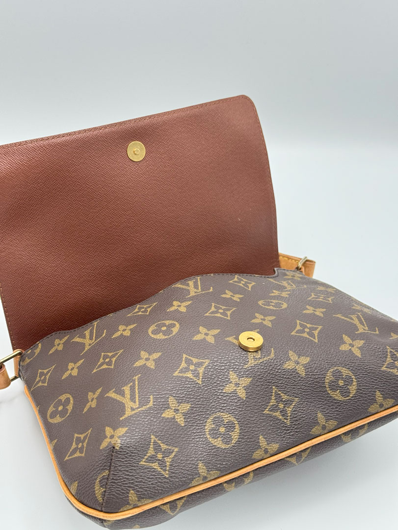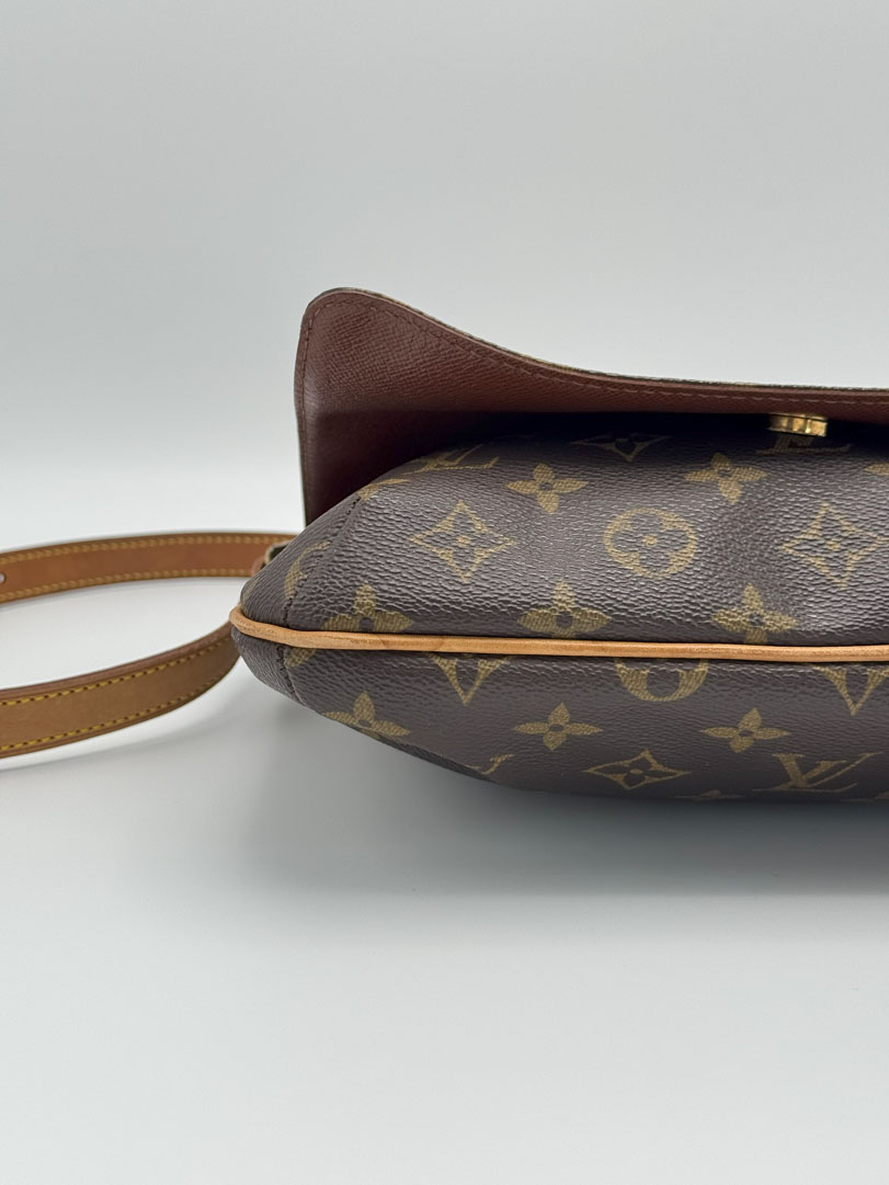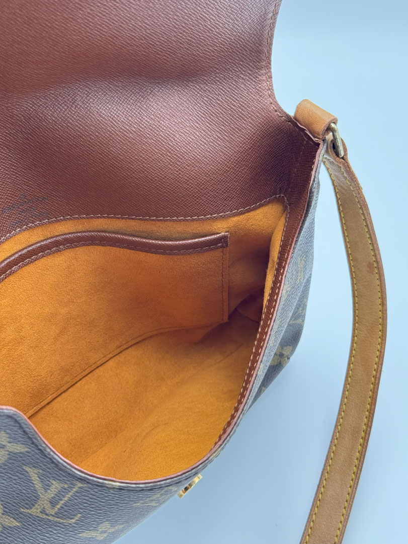 This vintage Louis Vuitton Musette Tango is a shoulder bag crafted from brown Monogram canvas with gold-tone hardware. It is in very good condition, showing some imperfections on the vachetta. The interior is clean with an extra pocket, the strap is adjustable, and the bag cannot be worn crossbody. The datacode is SP0091. Dimensions: 26 x 20 x 3 cm.