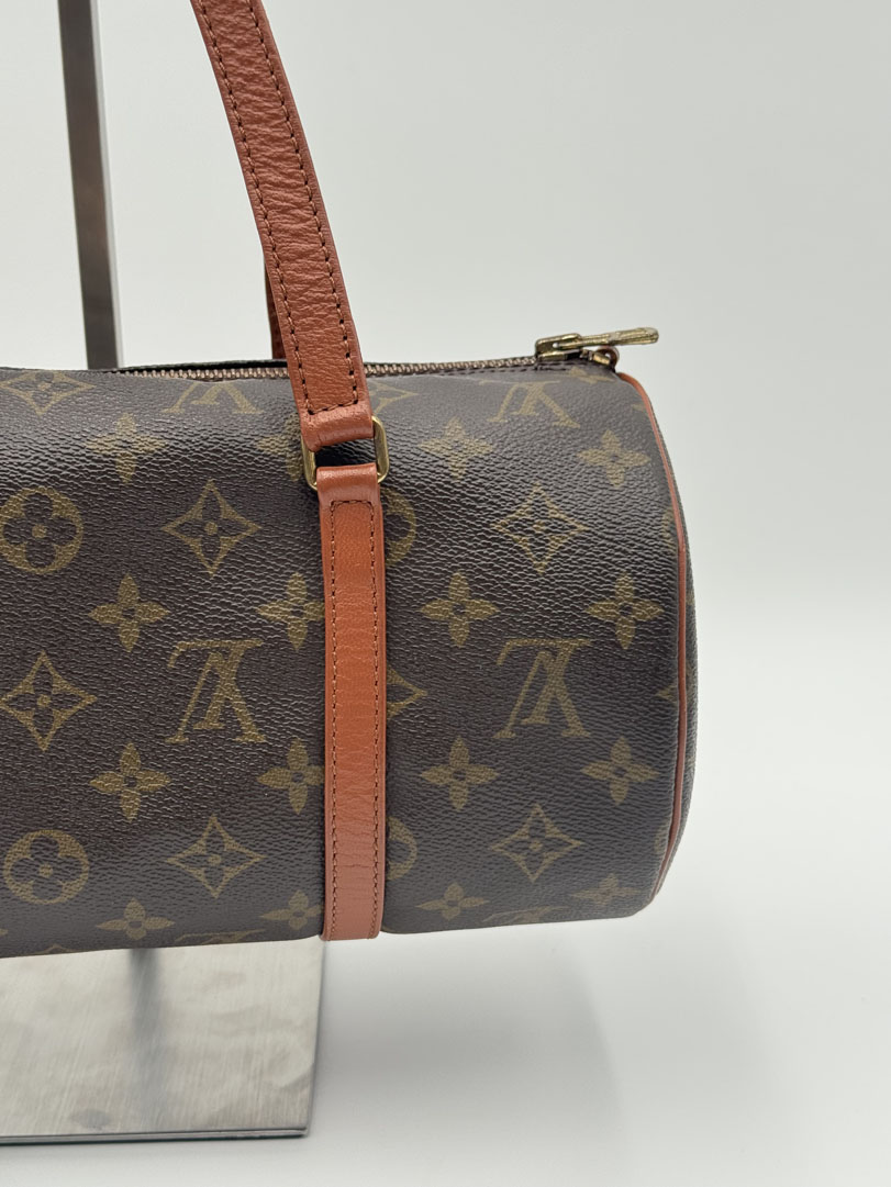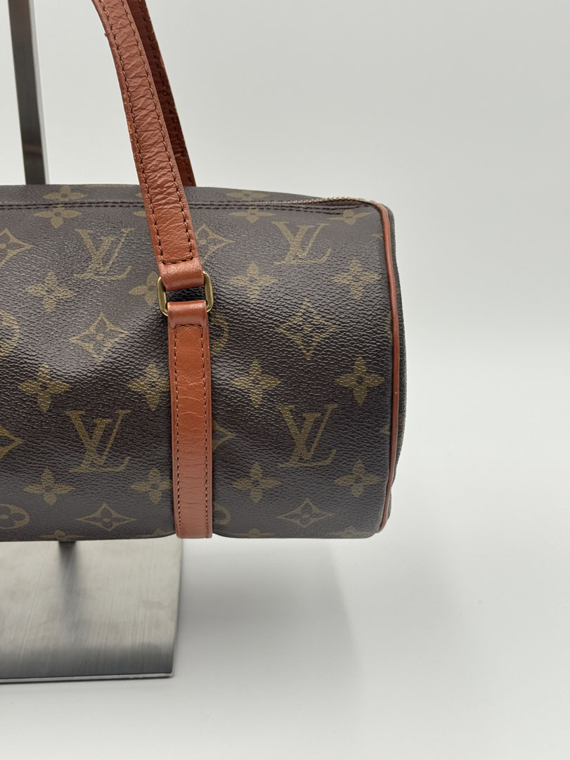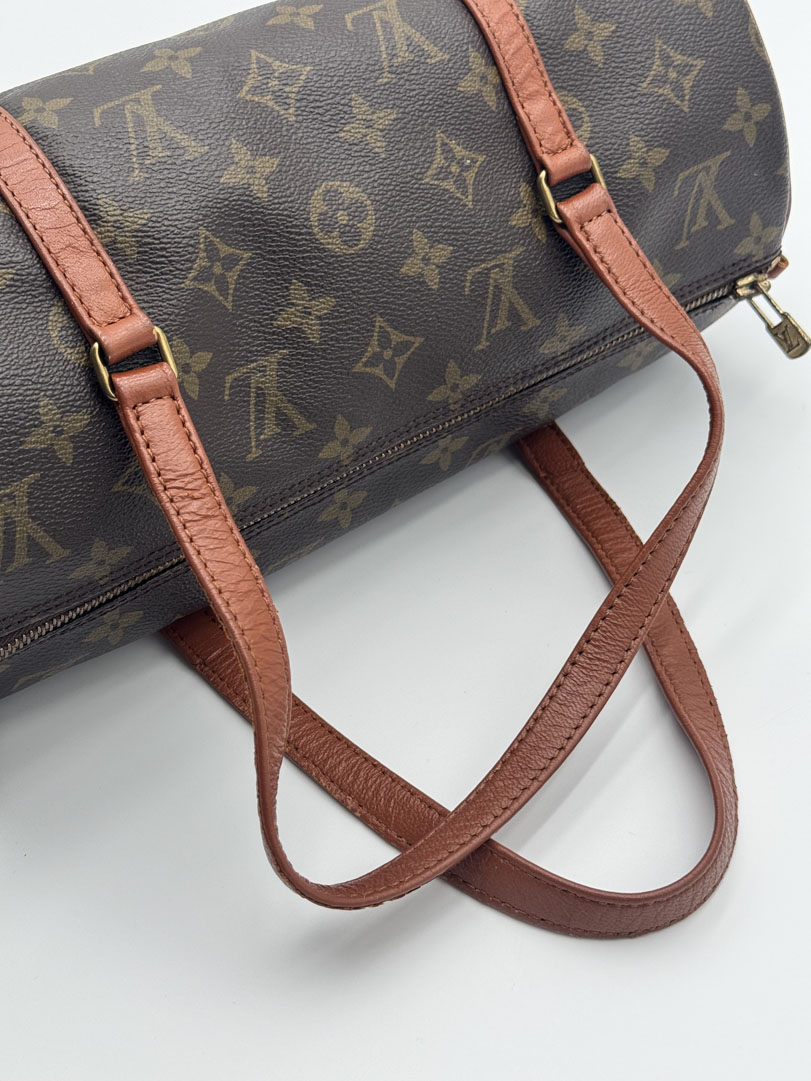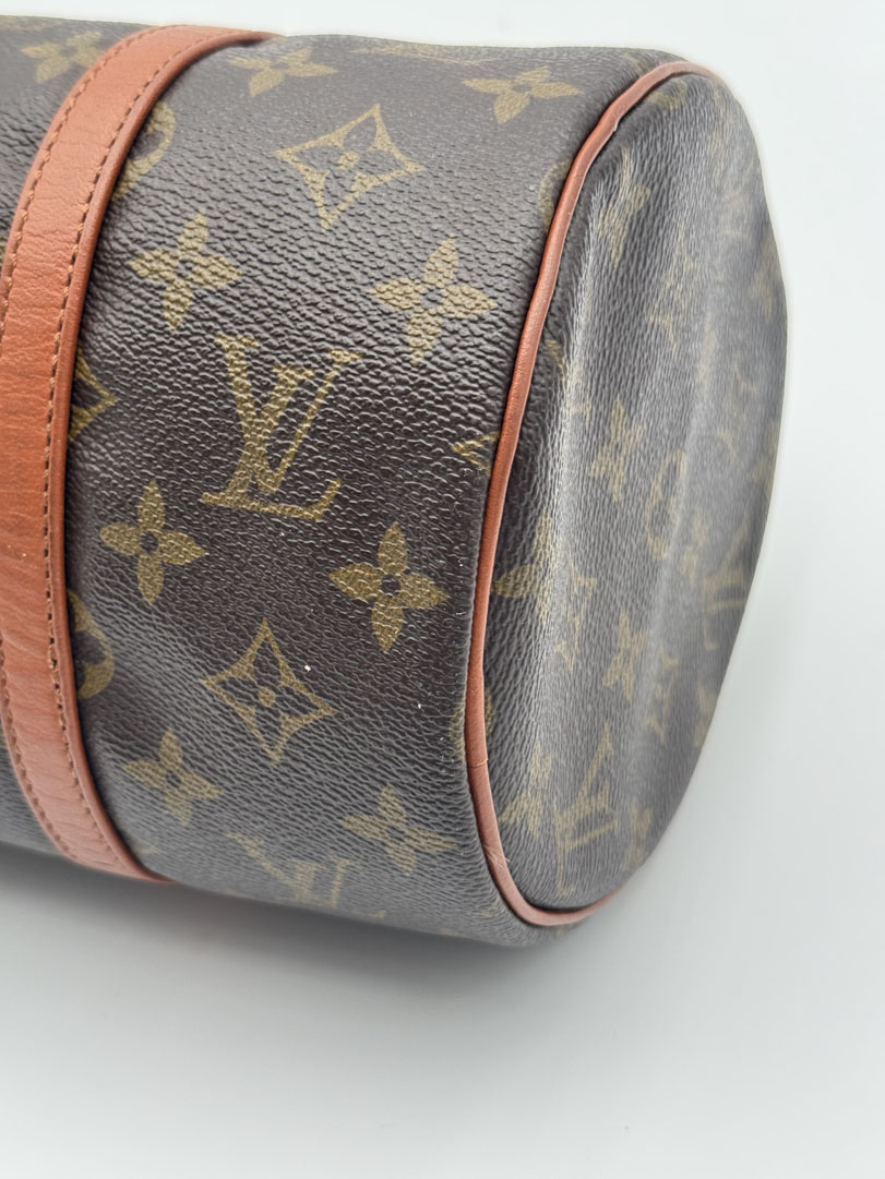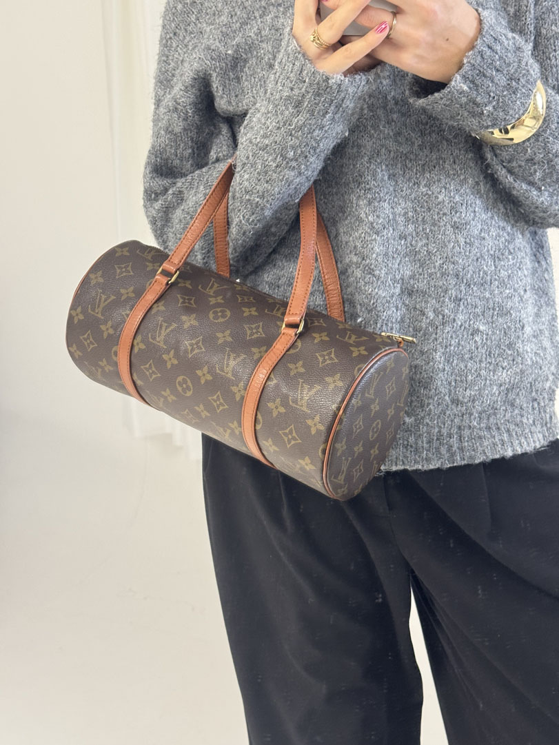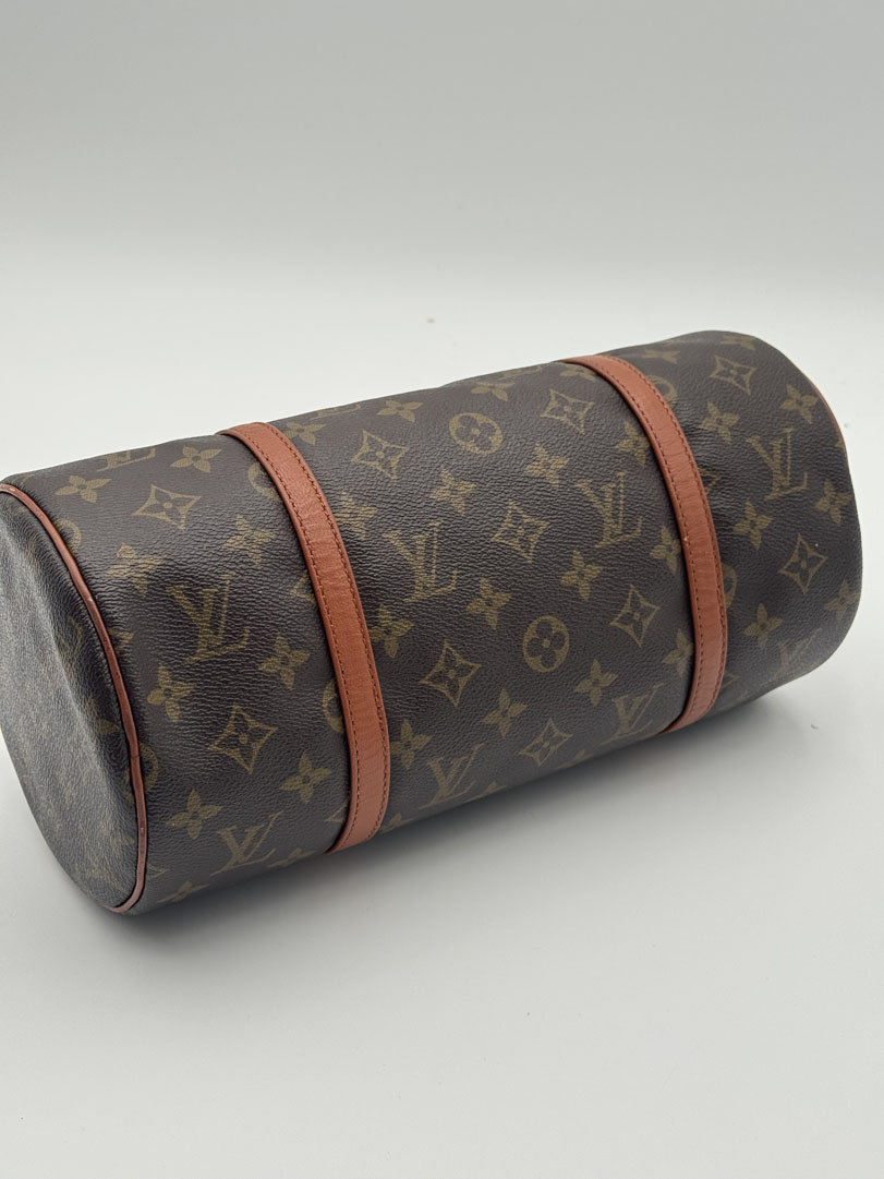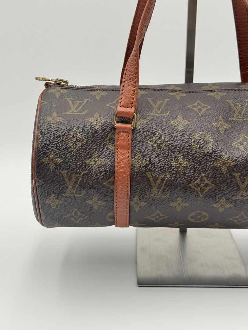 This vintage Louis Vuitton Papillon 30 is a handbag made from brown Monogram Canvas with gold-tone hardware. The item is in very good condition, showing some user signs such as small scratches on the hardware. The interior is clean. Dimensions are 30 x 15 x 15 cm. The datacode is no longer readable.