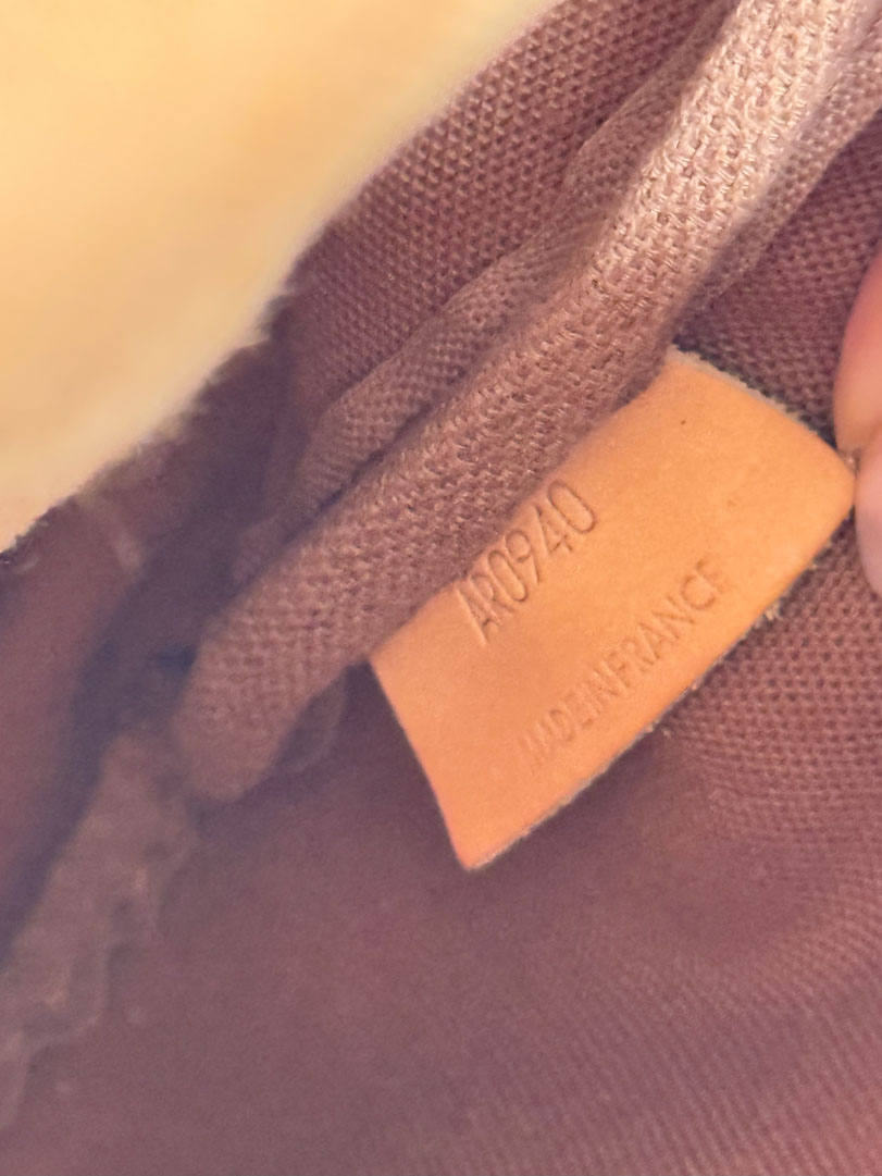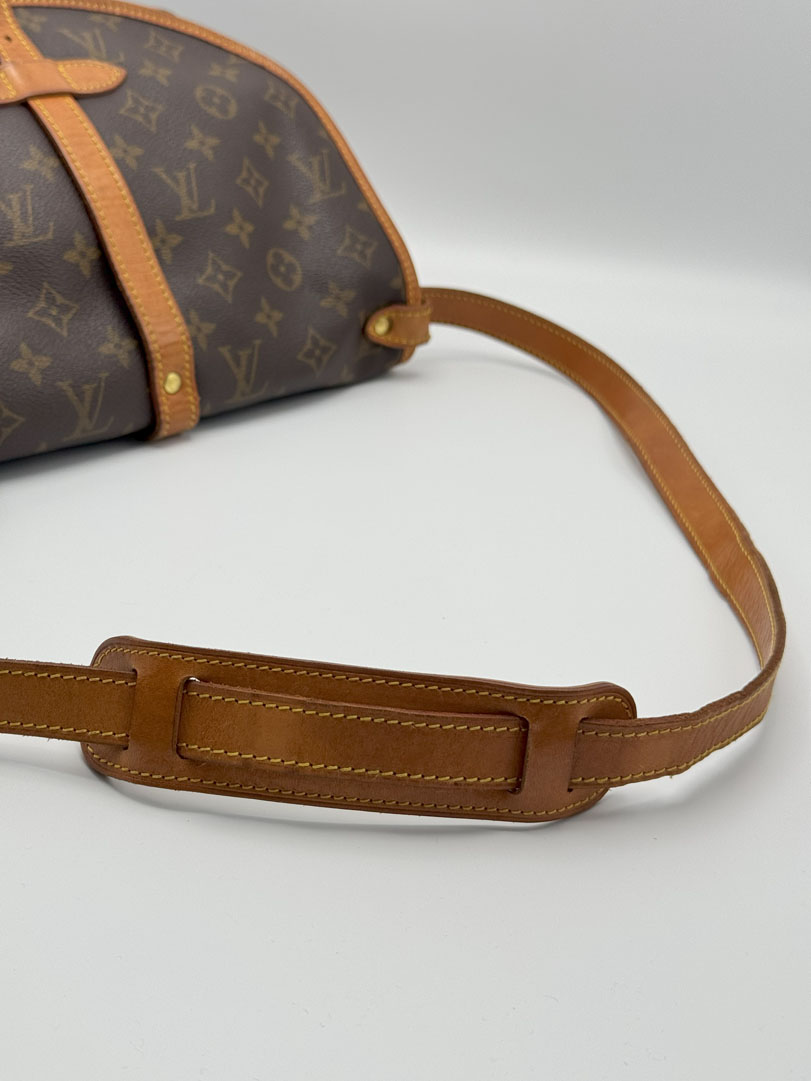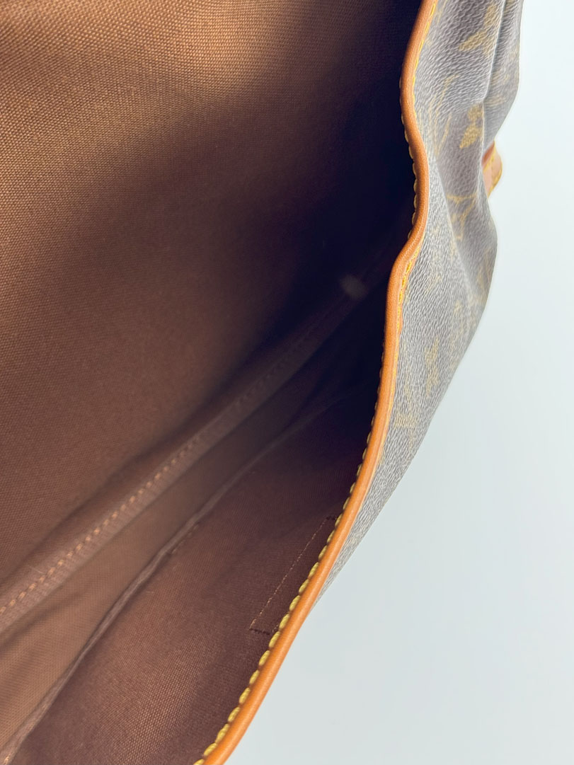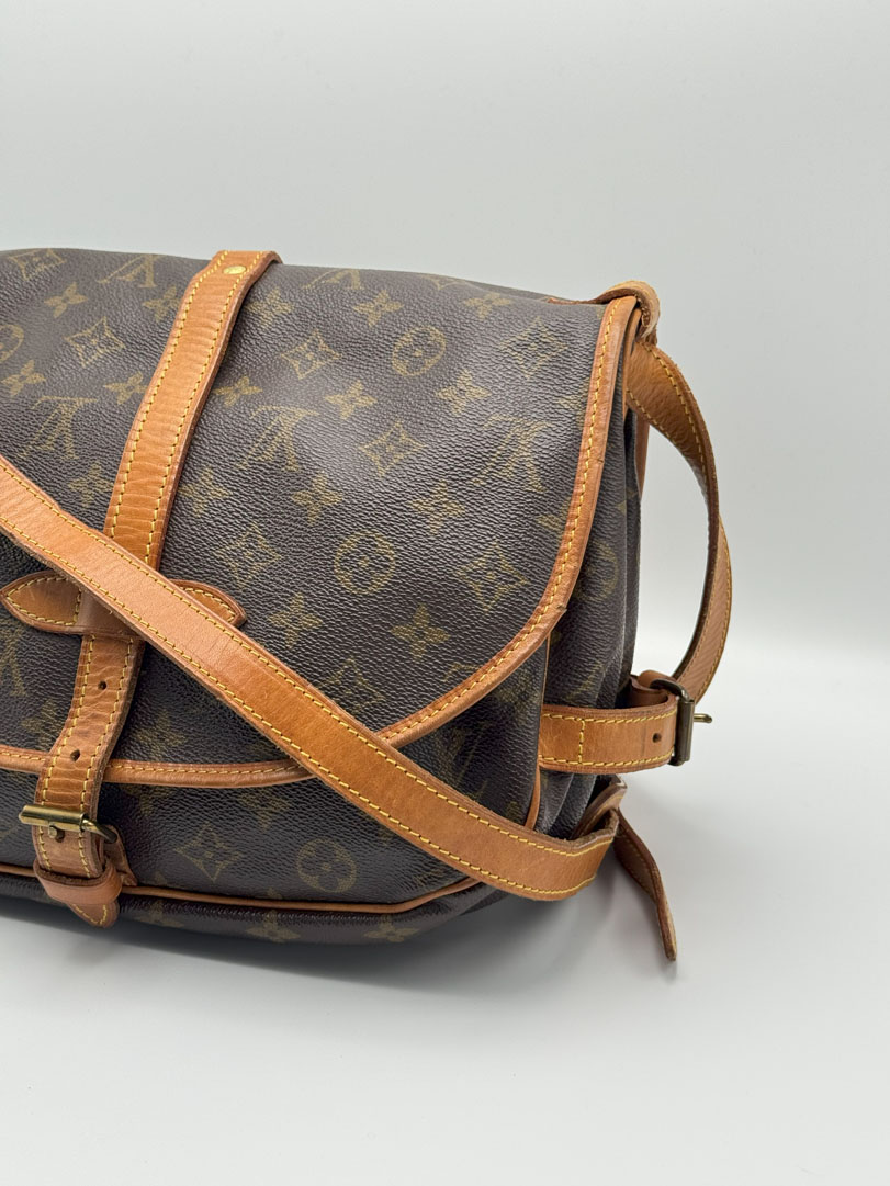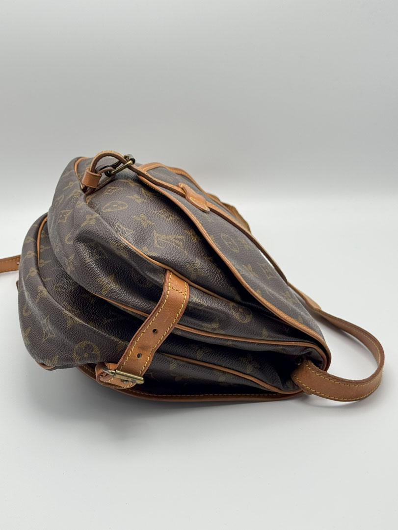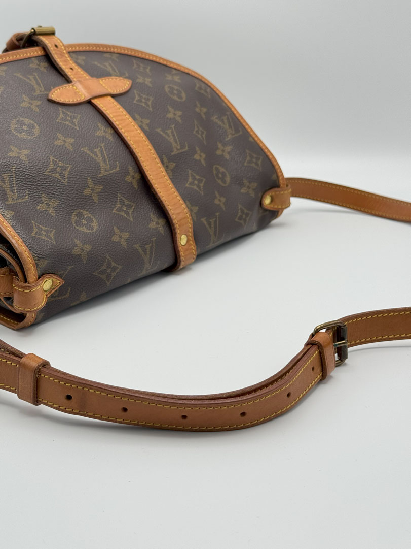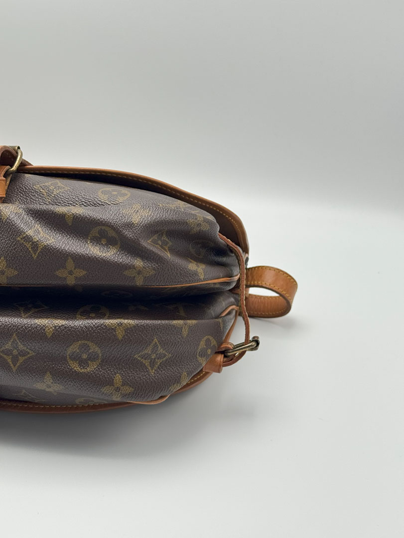 This vintage Louis Vuitton Saumur is a crossbody bag crafted from brown Monogram canvas with gold-tone hardware. It is in very good condition, with a clean interior and minimal imperfections, remaining in a nice vintage state. The bag features a double flap design with double buckles, and the strap is adjustable. The datacode is AR0940. Dimensions: 28 x 20 x 10 cm.
