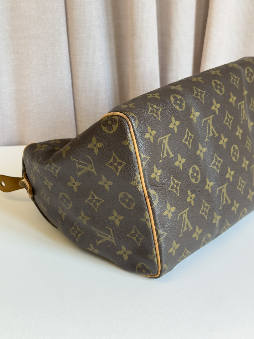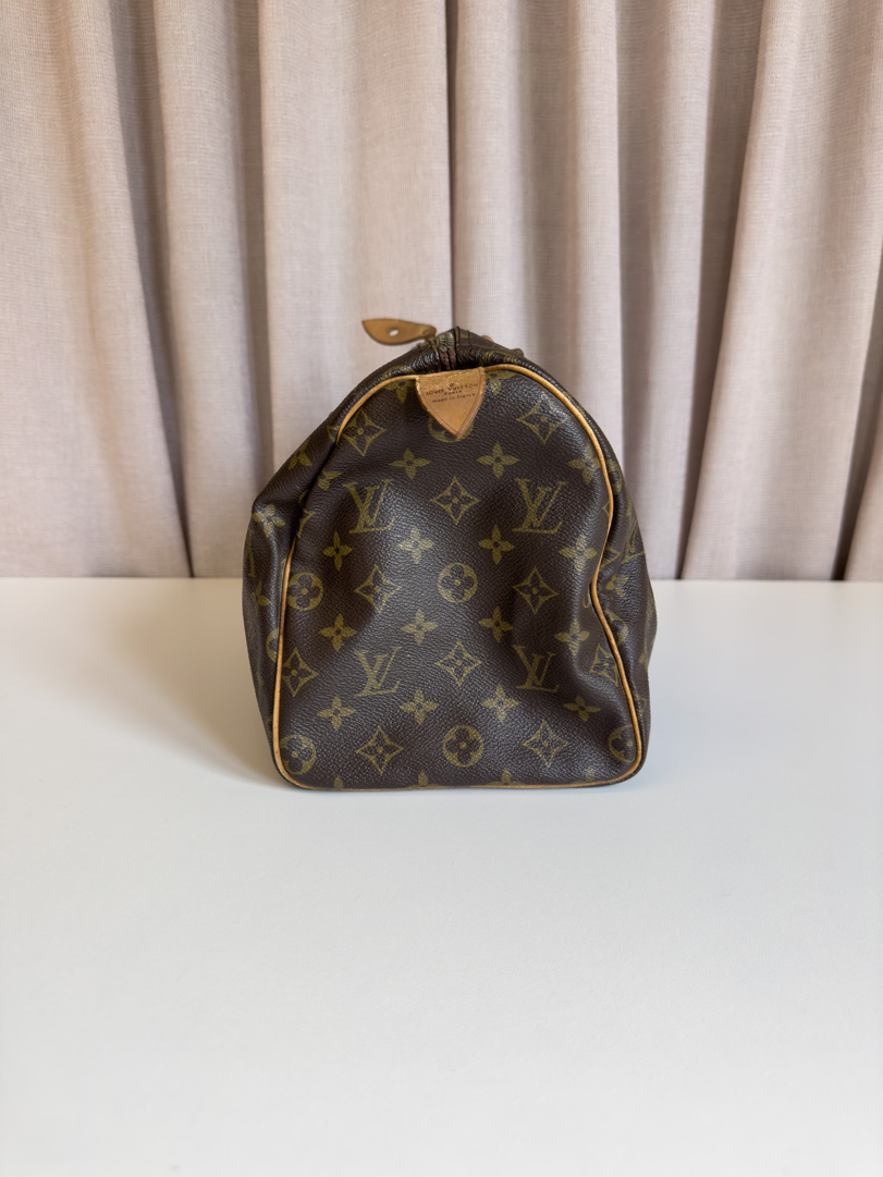 This vintage Louis Vuitton Speedy 30 is a classic handbag crafted from monogram canvas with vachetta leather and gold-tone hardware. It is in very good condition, with minor imperfections throughout and a few pen marks on the interior. Despite that, the bag remains a true vintage gem. The datacode is SA852 and the dimensions are 30 x 21 x 17 cm.