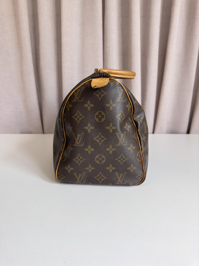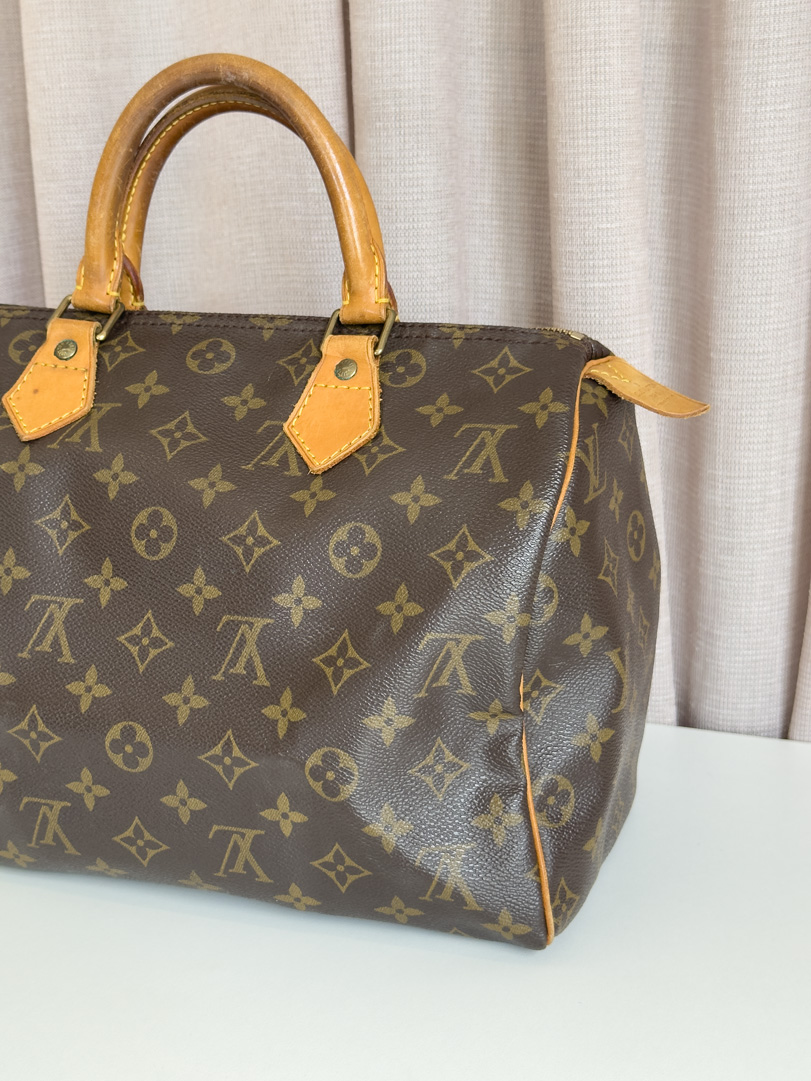 This vintage Louis Vuitton Speedy 30 is a stylish and timeless handbag in monogram canvas with vachetta leather and gold-tone hardware. It is in very good condition, showing light signs of use and a beautifully aged darker vachetta. The interior is completely clean, and the zipper functions well. The datacode is SP0914 and the dimensions are 30 x 21 x 17 cm.