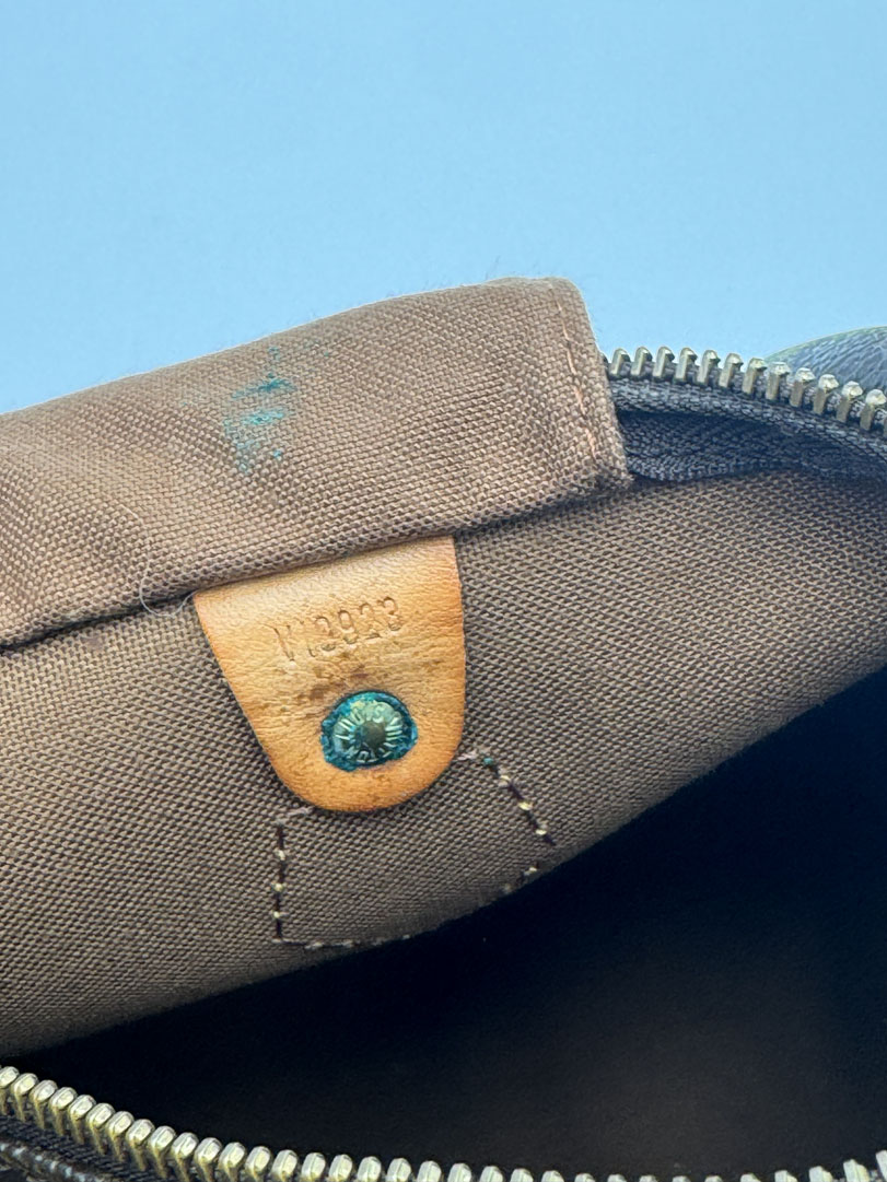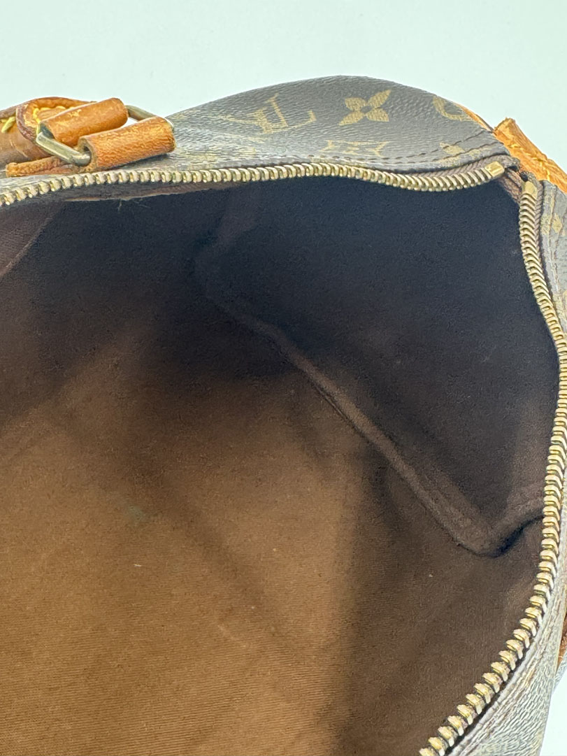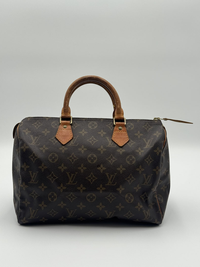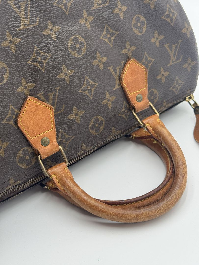 This vintage Louis Vuitton Speedy 30 is a handbag crafted from brown Monogram canvas with gold-tone hardware and vachetta leather details. It is in very good condition, with some light discoloration on the hardware and natural patina and imperfections on the vachetta. The canvas remains sturdy, the zipper functions smoothly with the original pull attached, and the interior is clean with an extra pocket. The datacode is VI0923, dating from 1993. Dimensions: 30 x 21 x 17 cm.