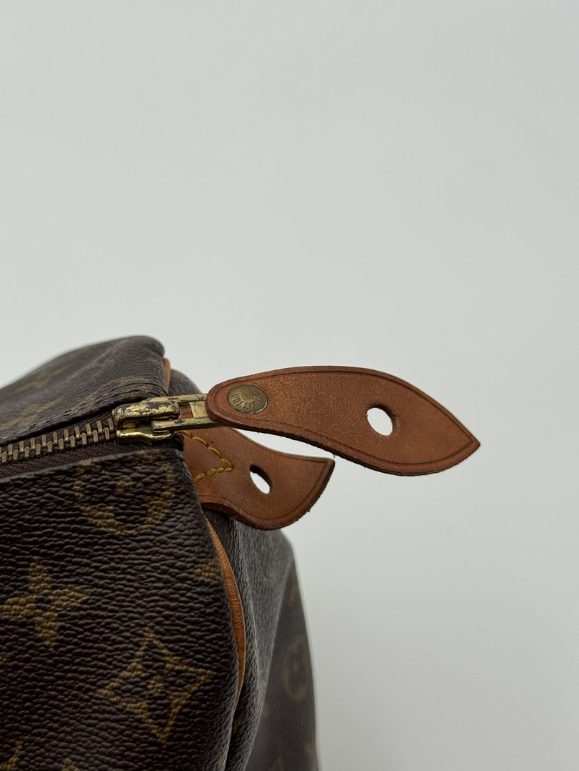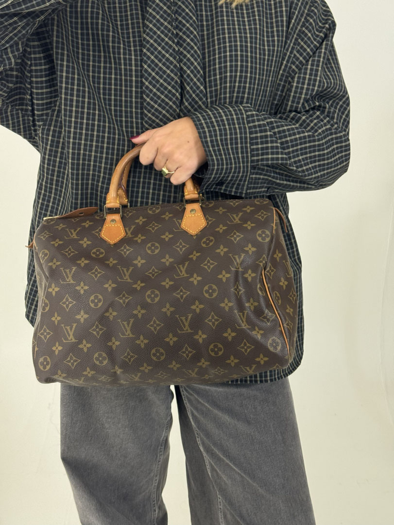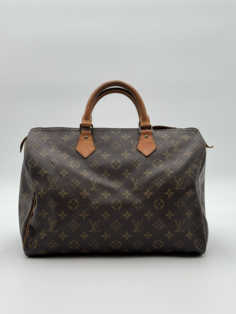This vintage Louis Vuitton Speedy 35 is a handbag crafted from brown Monogram canvas with gold-tone hardware. It is in very good condition, with hardly any signs of use. The zipper functions well, and the vachetta leather has darkened slightly. The interior is clean with an extra pocket. Dimensions: 35 x 23 x 18 cm. The datacode is VI882, from 1982.
