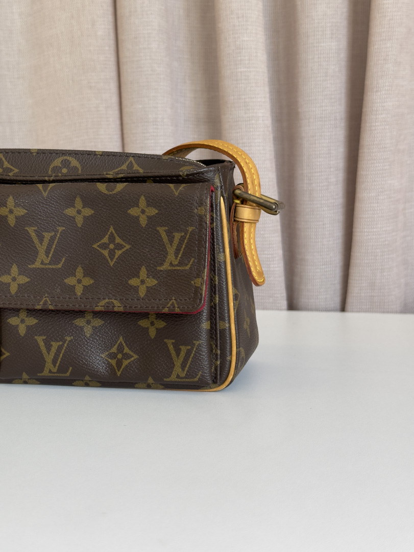 This vintage Louis Vuitton Viva Cite is a stylish shoulder bag in monogram canvas with vachetta leather and gold-tone hardware. It is in excellent condition with only minimal wear on the corners. The interior is completely clean, and the bag remains in fantastic vintage shape. Dimensions: 30 x 13 x 9 cm.