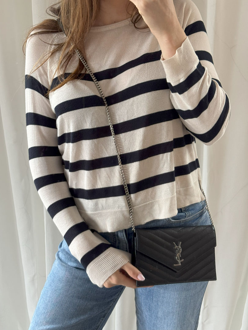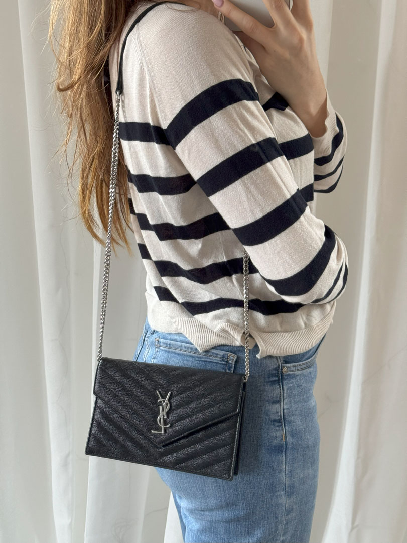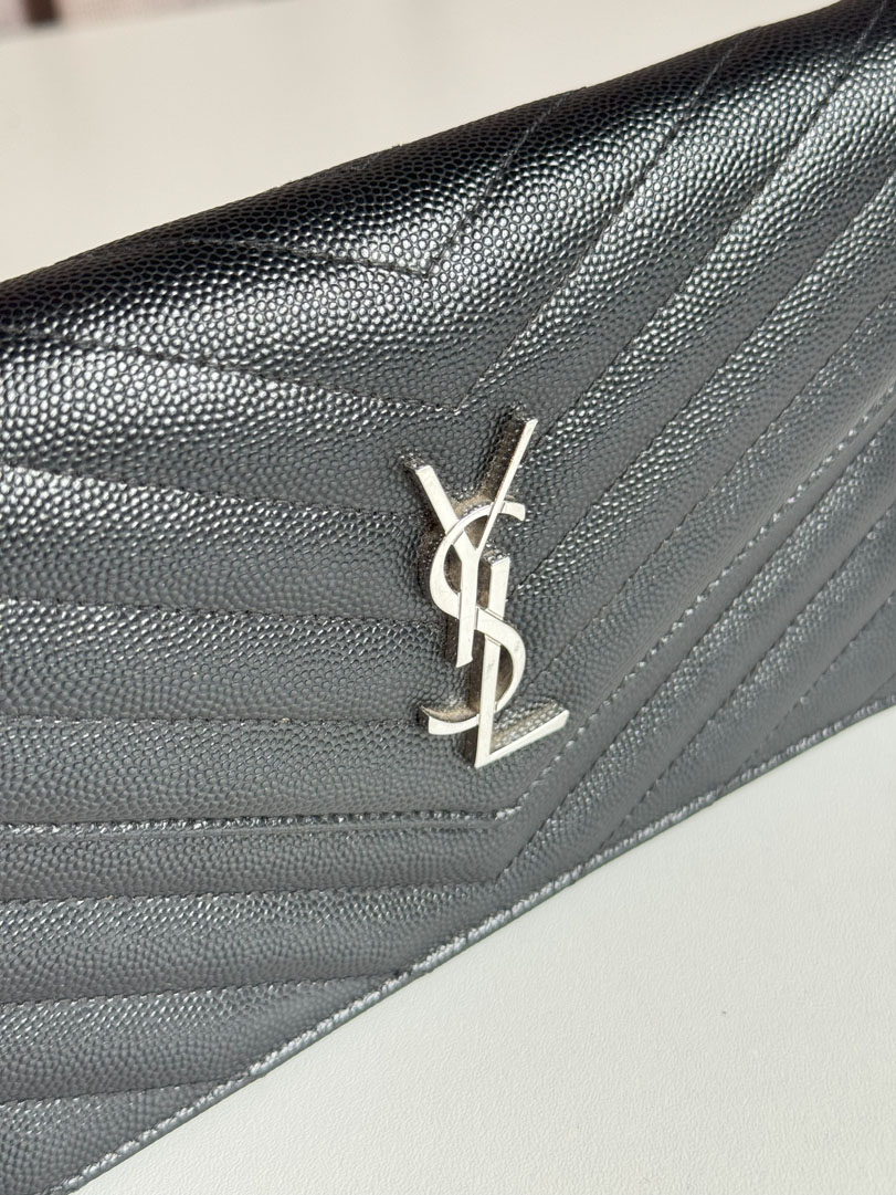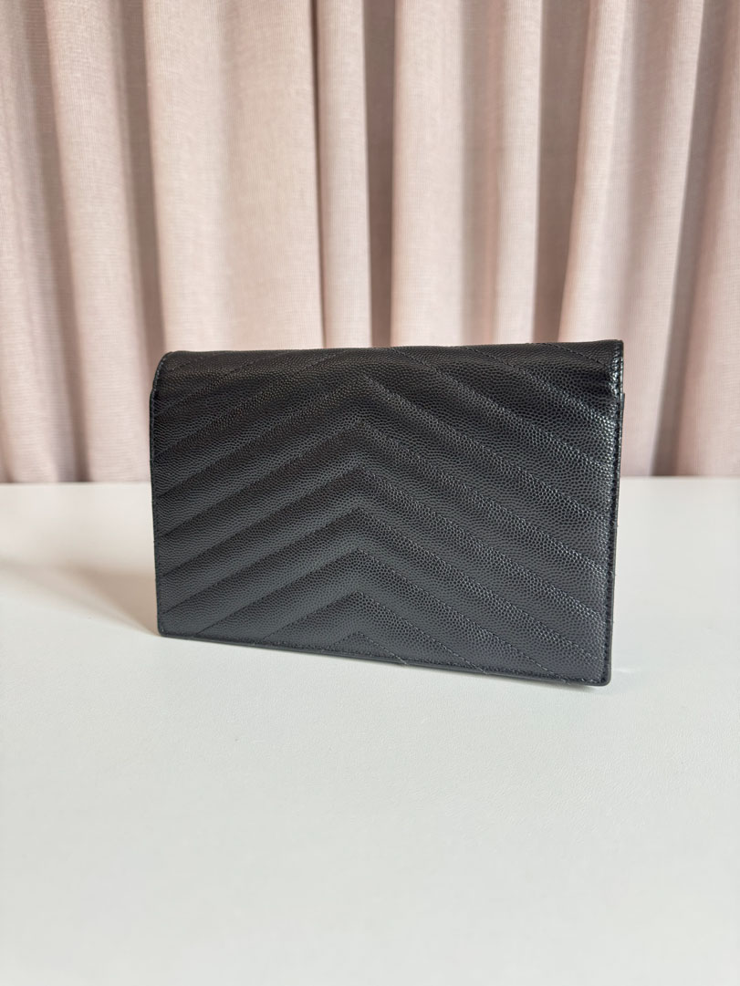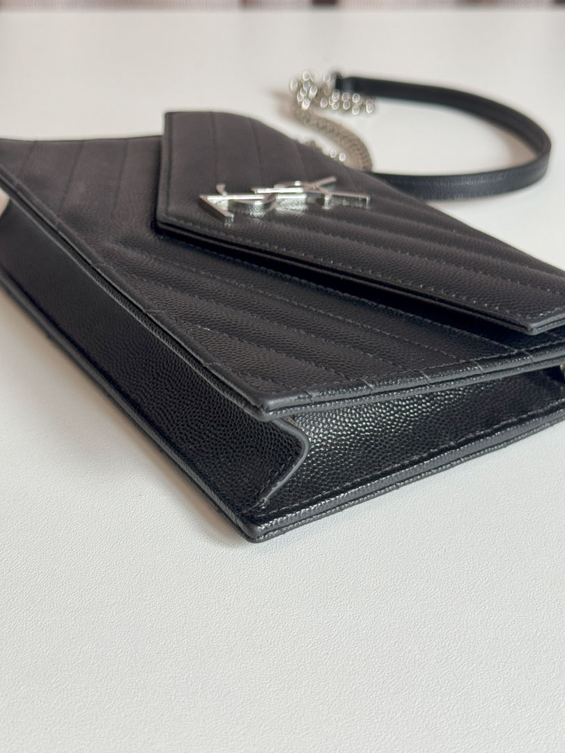 This preloved Saint Laurent Envelope Chain Wallet is a crossbody bag crafted from black leather with silver-tone hardware. It is in excellent condition, clean with an extra zippered pocket inside, showing only minimal wear on the corners. It comes with a dustbag, receipt, and box. Dimensions: 19 x 13 x 4.5 cm.