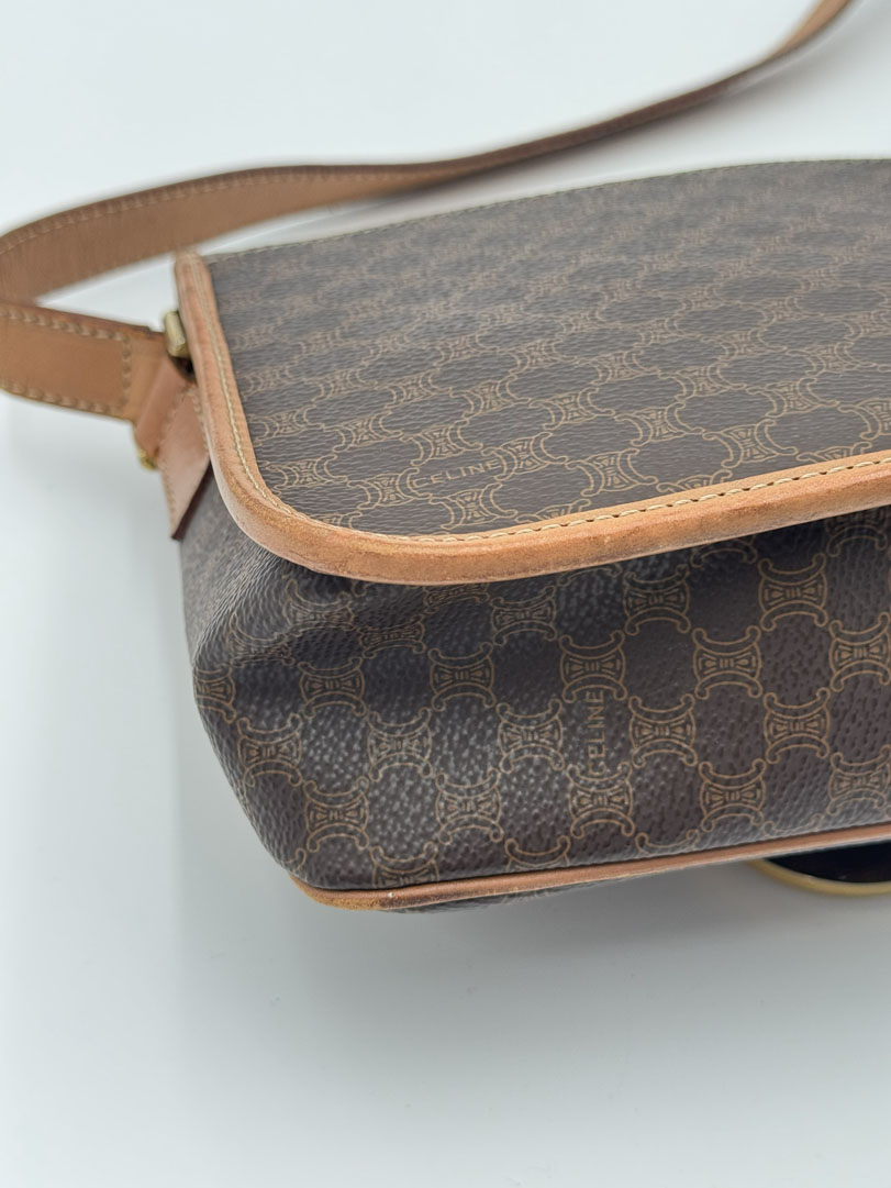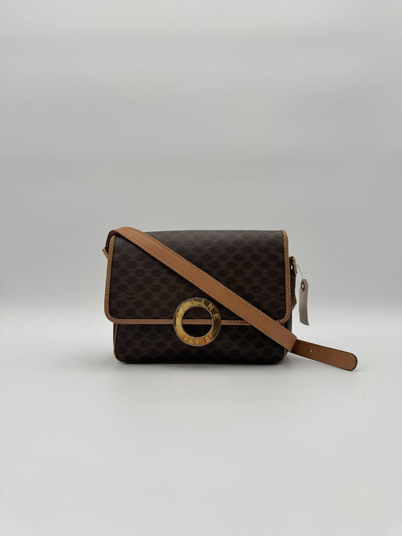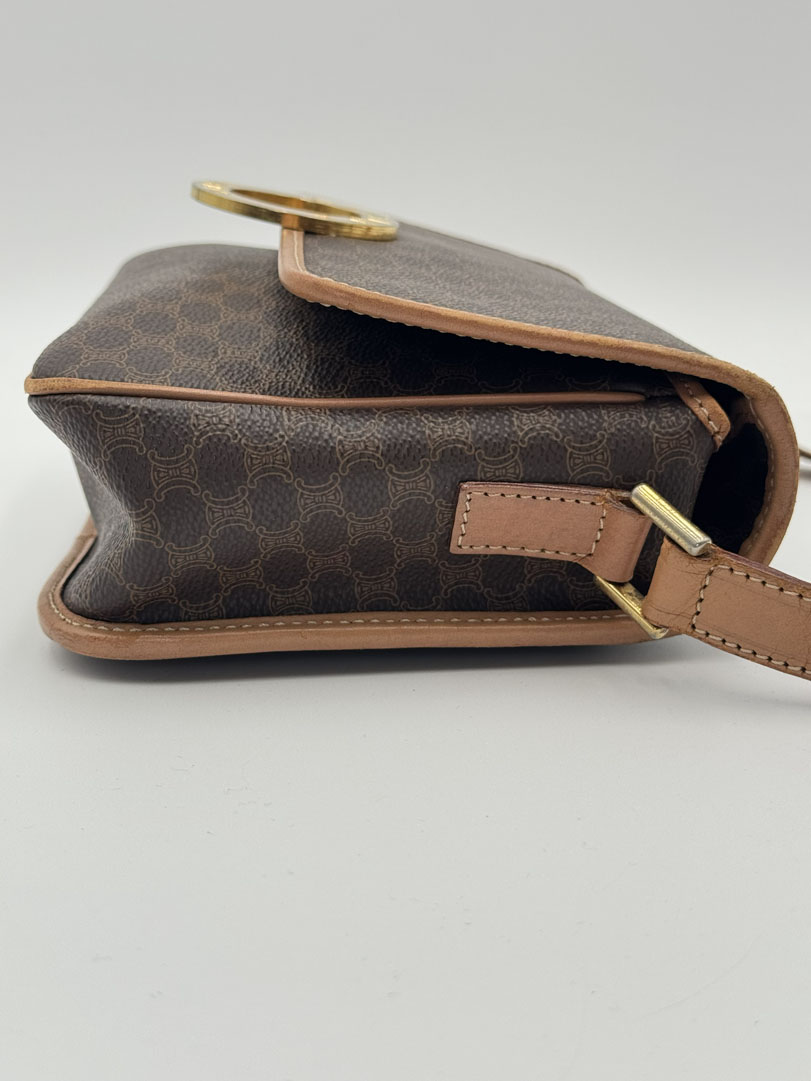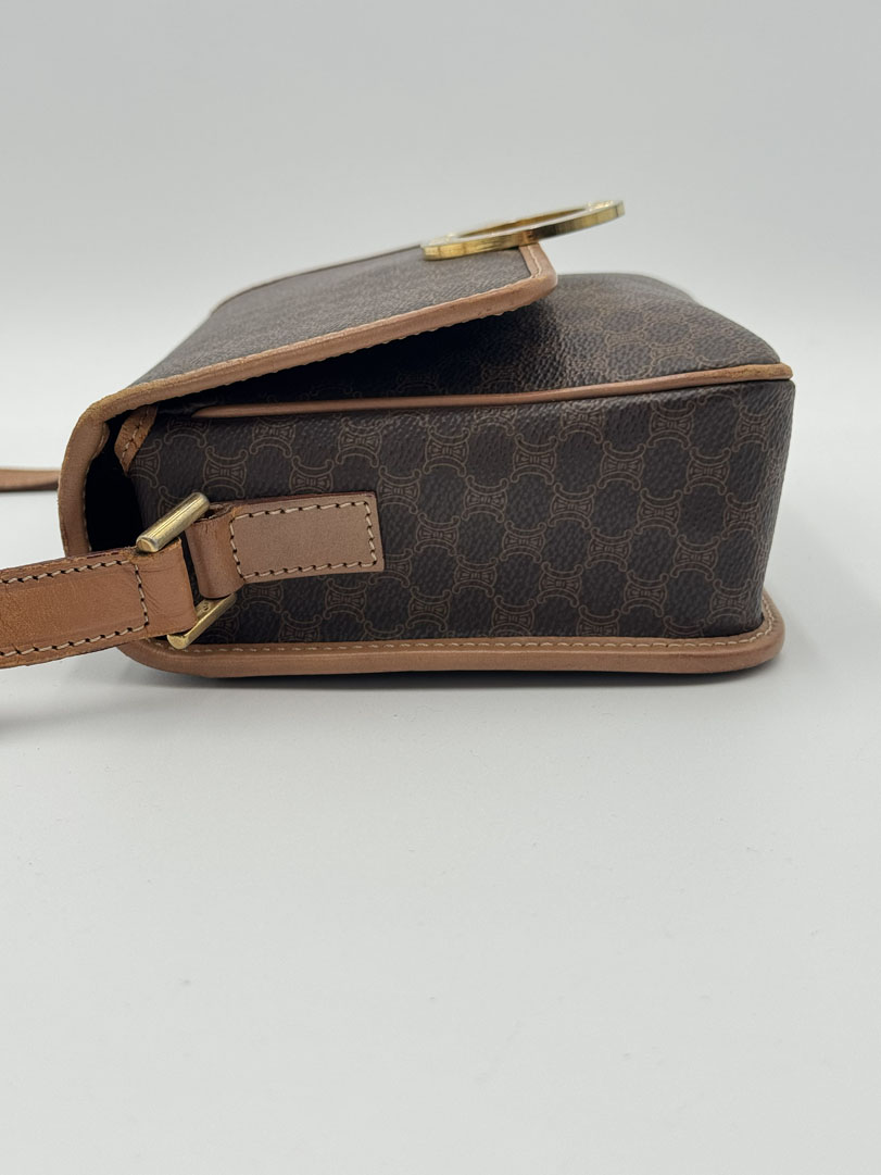 This vintage Celine Macadam Canvas Crossbody Bag is a crossbody bag made from dark brown PVC leather with gold-tone hardware. The item is in very good condition, showing some user signs such as discoloration of the hardware. The interior is clean with an extra pocket, and the bag closes with a magnetic button. The dimensions are 22 x 18 x 7 cm.