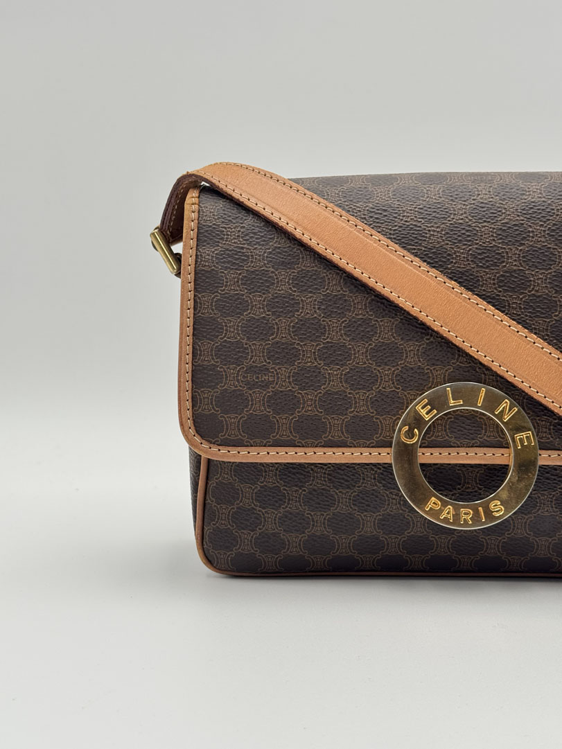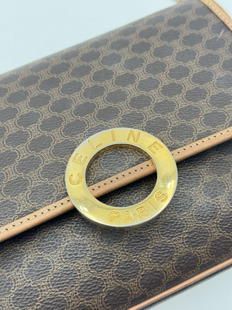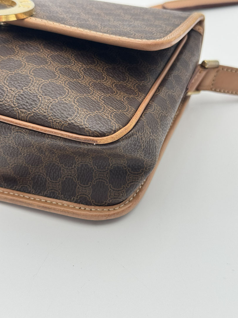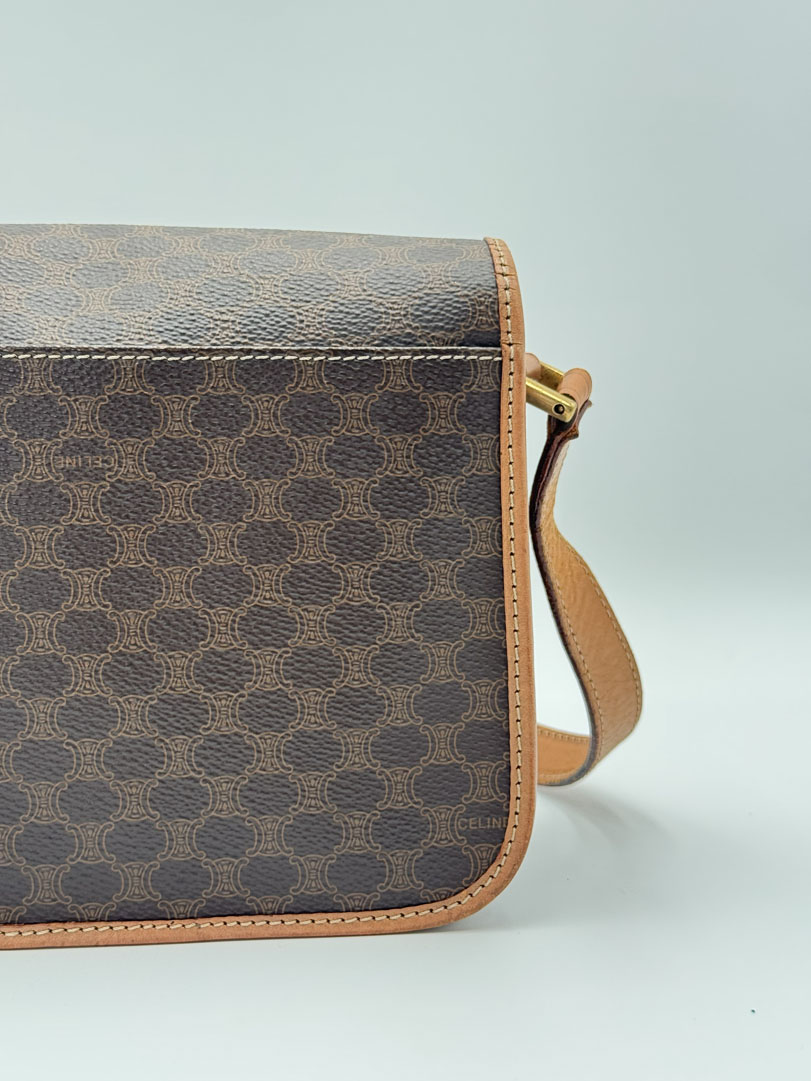 This vintage Celine Macadam Canvas Crossbody Bag is a crossbody bag made from dark brown PVC leather with gold-tone hardware. The item is in very good condition, showing some user signs such as discoloration of the hardware. The interior is clean with an extra pocket, and the bag closes with a magnetic button. The dimensions are 22 x 18 x 7 cm.