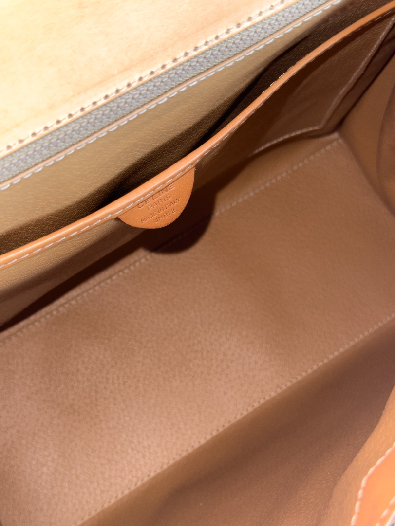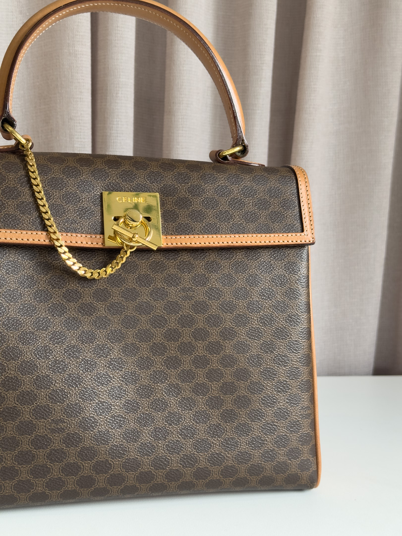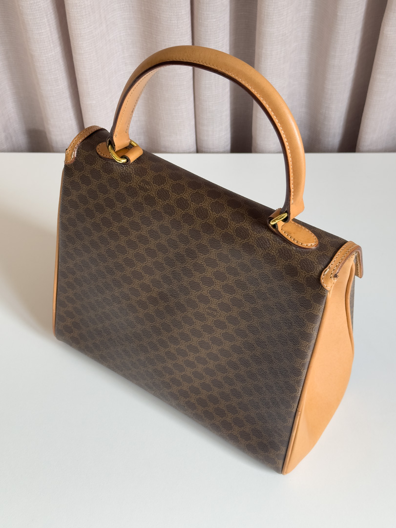 This vintage Celine Macadam Canvas Hand Bag is a timeless piece crafted from brown Macadam canvas with gold-tone hardware. It is in excellent condition, showing only minimal imperfections on the leather. The hardware shines beautifully, and the interior is clean. A classic and elegant handbag. Dimensions: 28 x 24 x 12 cm.
