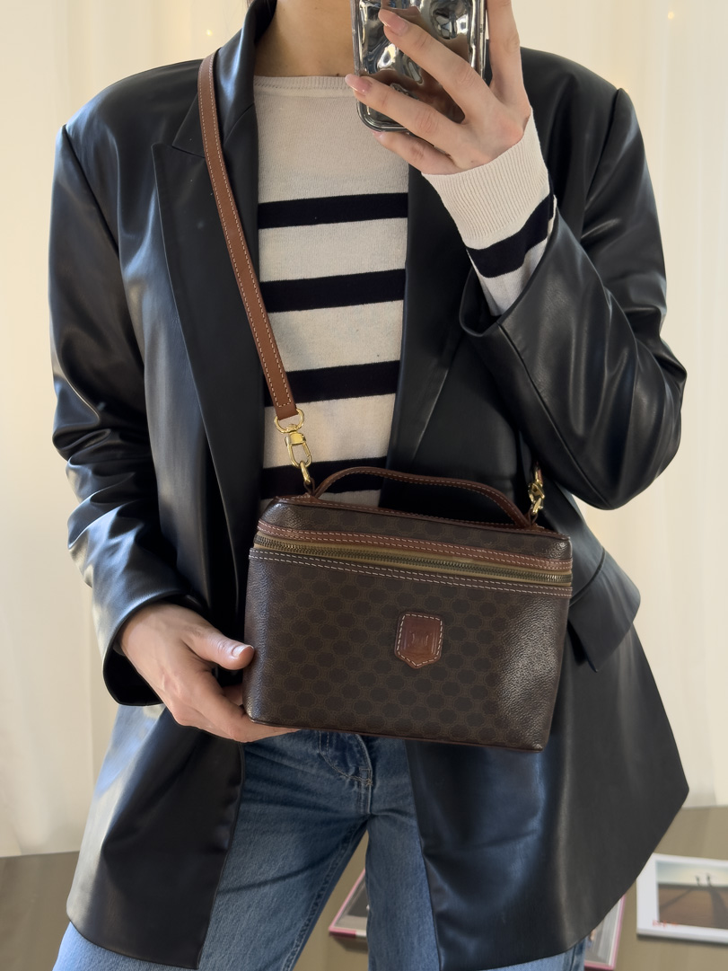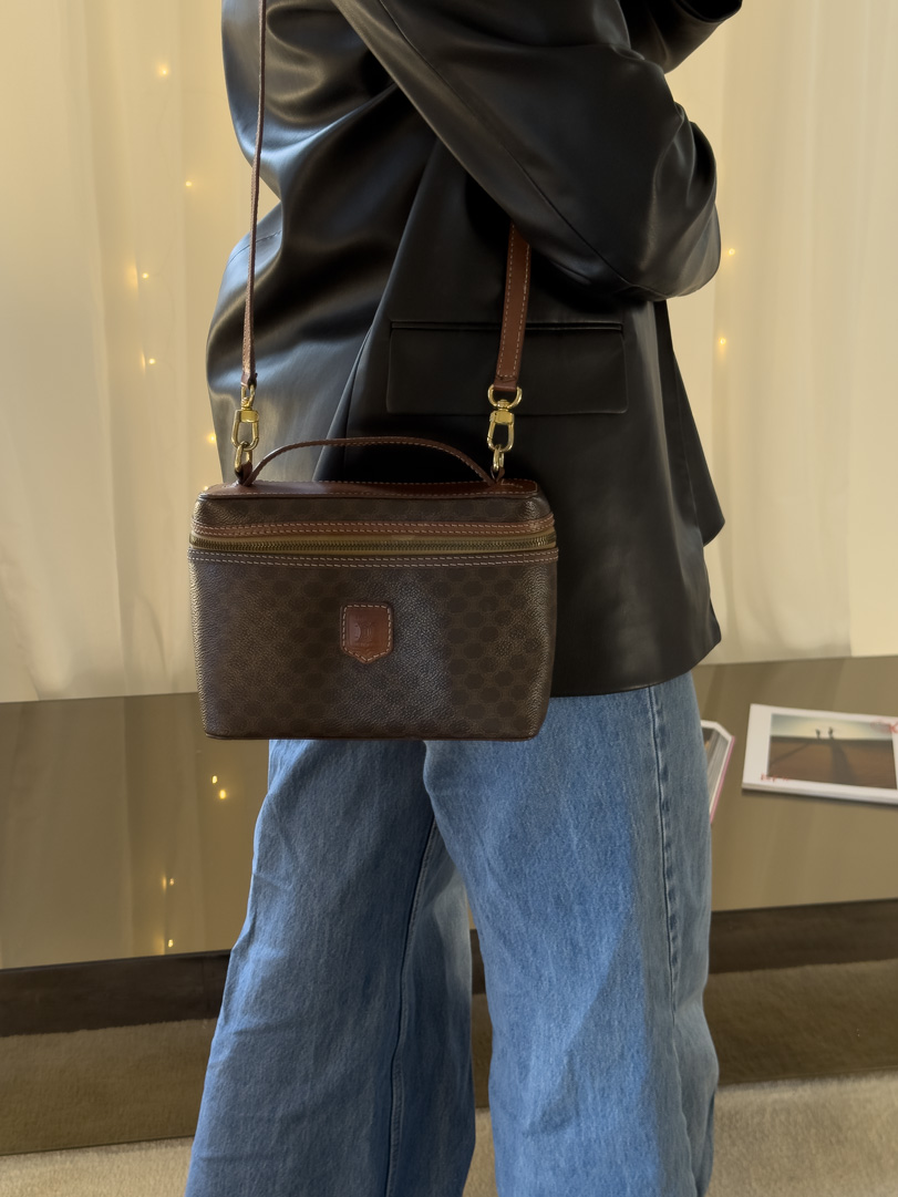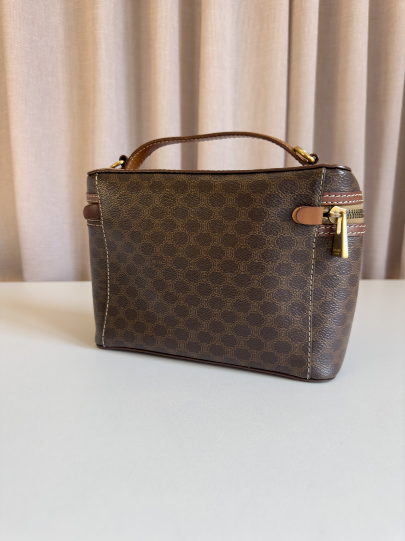 This vintage Celine Macadam Crossbody Bag is a sophisticated vintage piece, featuring classic brown Macadam leather with gold-tone hardware. Designed with a long strap for crossbody wear or as a handbag when the strap is removed, it offers versatile styling options. It is in very good condition, showing only light imperfections. The zipper works perfectly, and the interior is clean. The strap measures 100 cm in length. The serial number is DM95, and the dimensions are 21 x 15 x 7 cm.