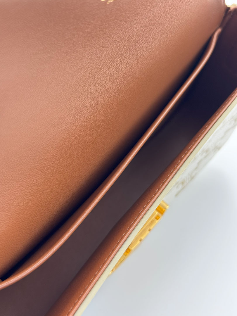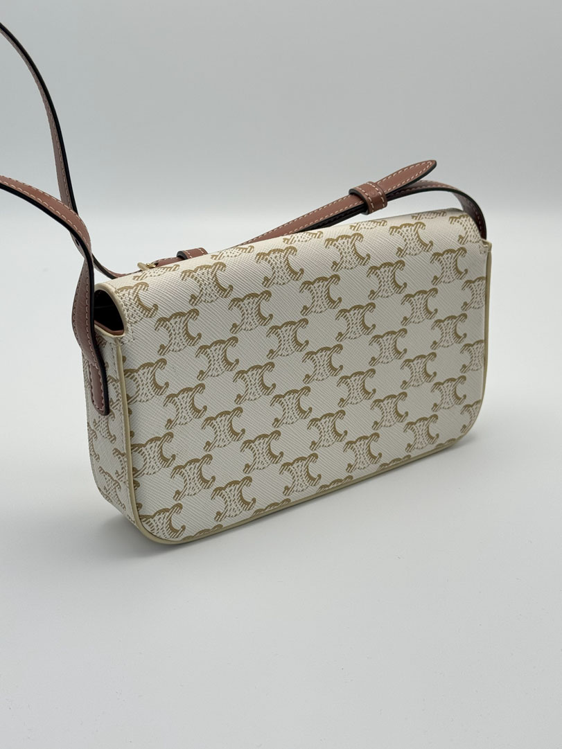 This stunning Celine Triomphe Shoulder Bag is in excellent condition and shows little to no signs of use. The protective sticker is still intact on the hardware, highlighting its pristine condition. Although it can only be worn over the shoulder, the strap is adjustable for added convenience. The interior is clean and free from any odors. It also comes with its original store tags. The dimensions are 21 x 12 x 4.5 cm.
