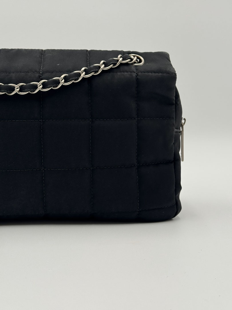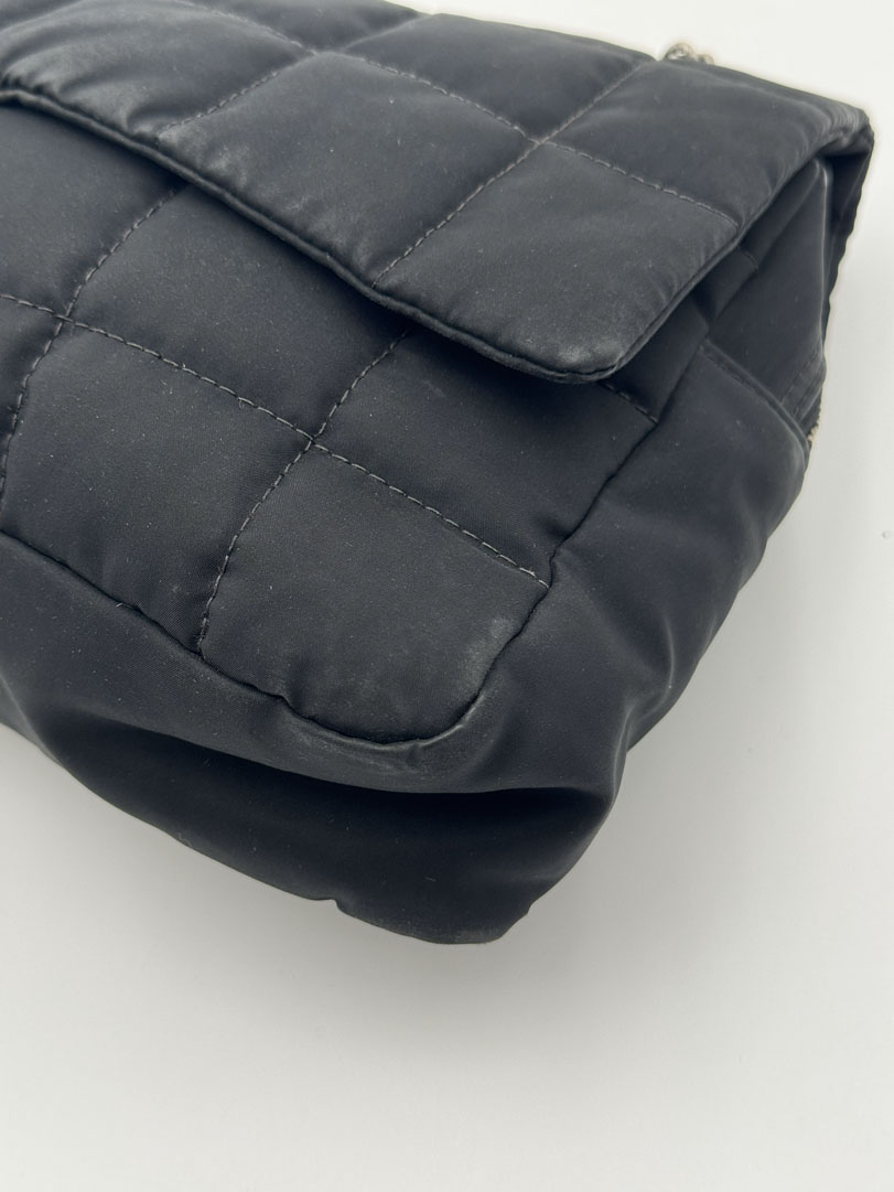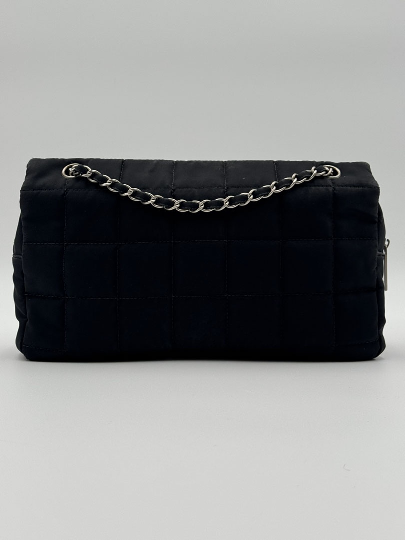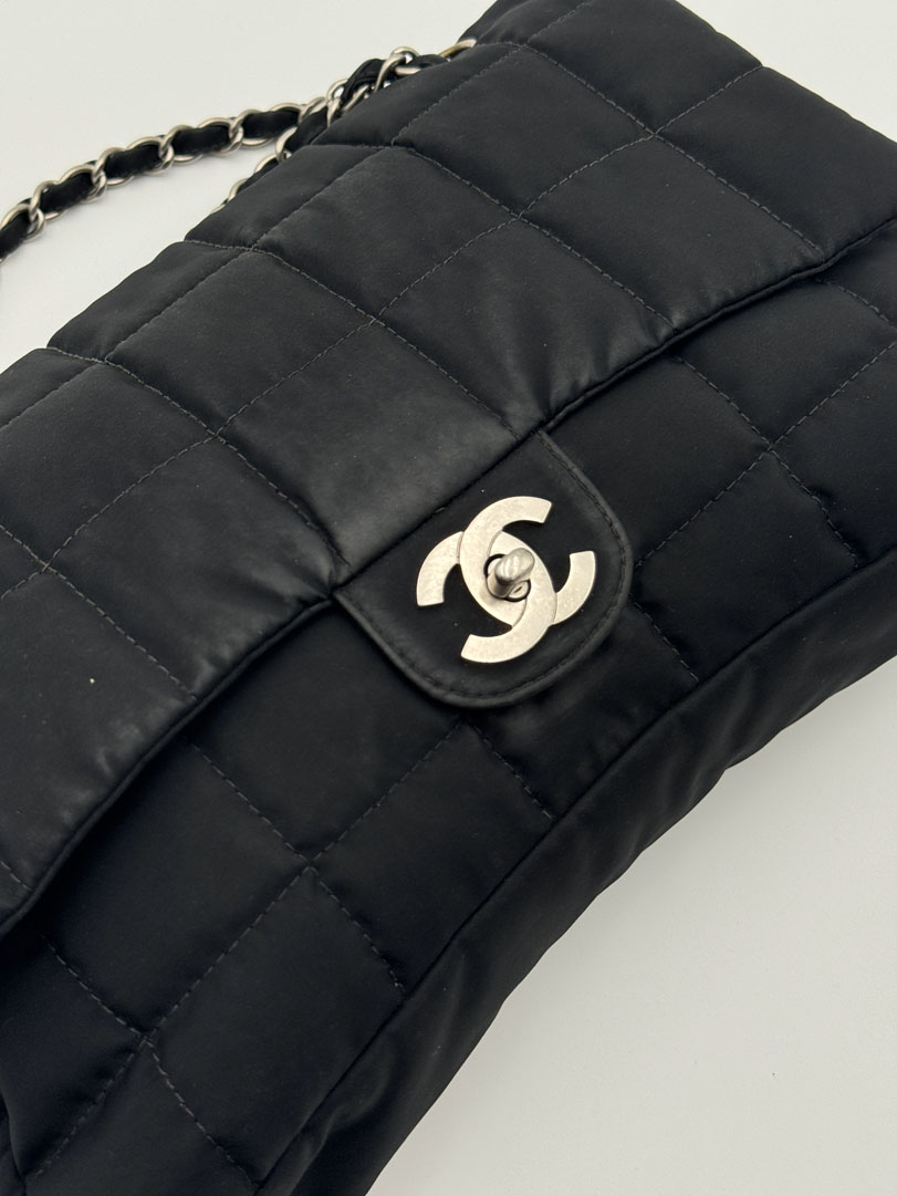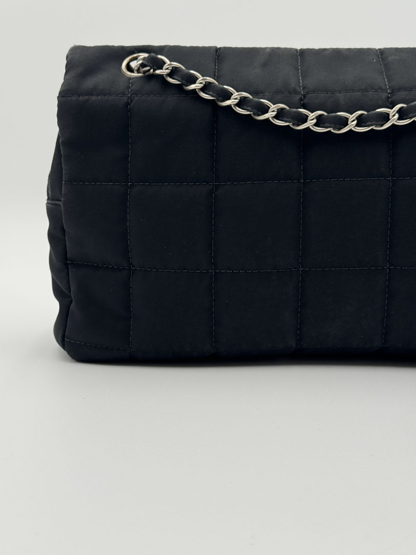This vintage Chanel Chocolate Bar Flap Bag is a gorgeous puffy crossbody bag made from black nylon with silver-tone hardware. The item is in very good condition, showing some imperfections such as small discoloration on the bag. The inside has multiple pockets and a zipper. The serial number is 7818584, from the year 2003, and the dimensions are 30 x 19 x 6 cm. The chaindrop is 40 cm.