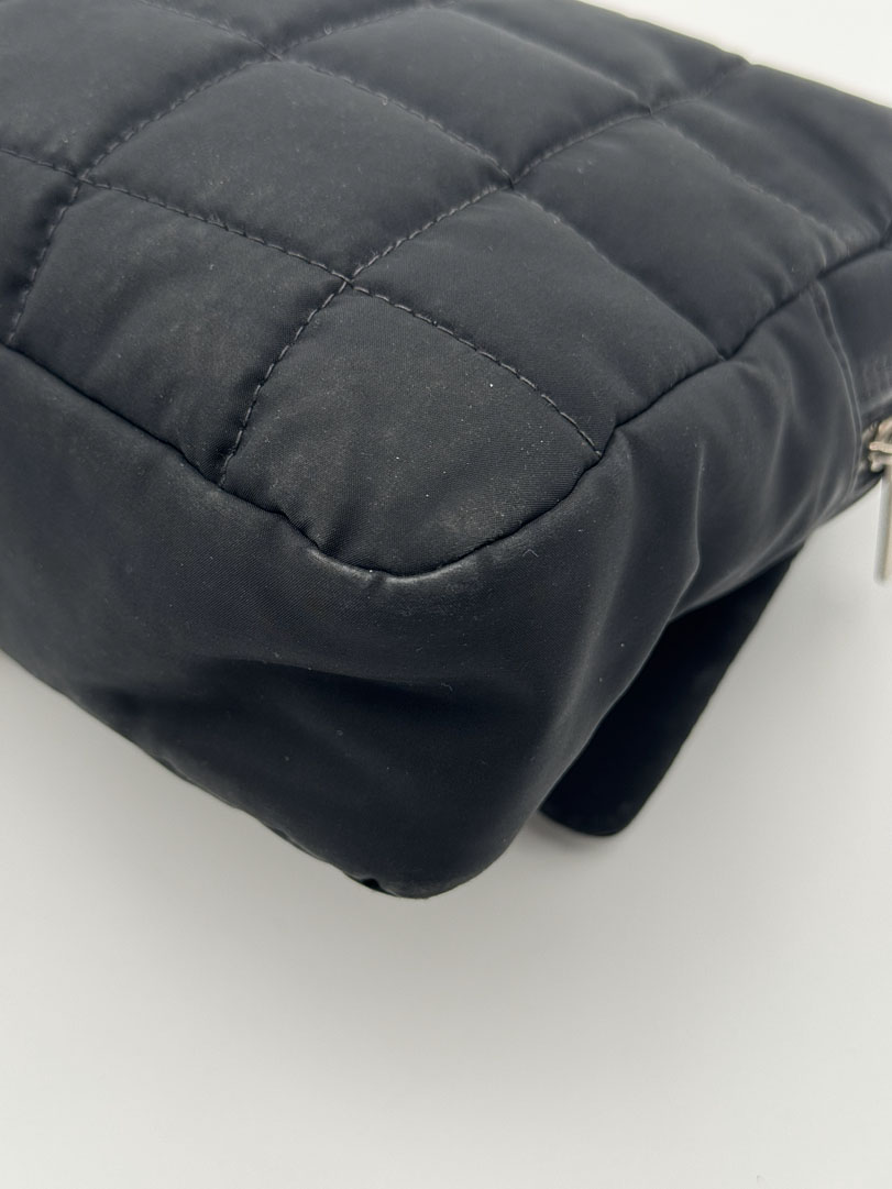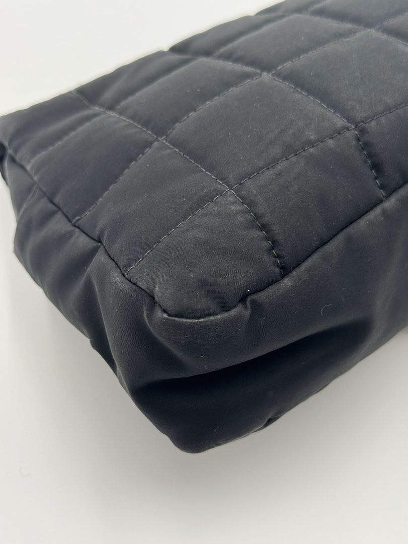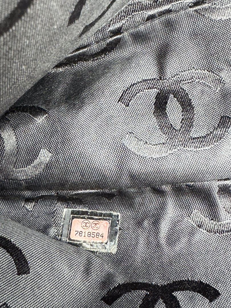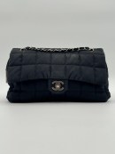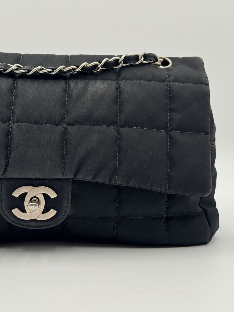 This vintage Chanel Chocolate Bar Flap Bag is a gorgeous puffy crossbody bag made from black nylon with silver-tone hardware. The item is in very good condition, showing some imperfections such as small discoloration on the bag. The inside has multiple pockets and a zipper. The serial number is 7818584, from the year 2003, and the dimensions are 30 x 19 x 6 cm. The chaindrop is 40 cm.