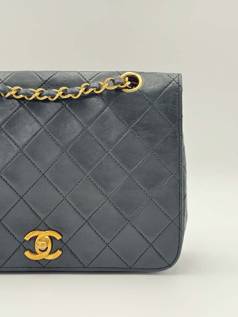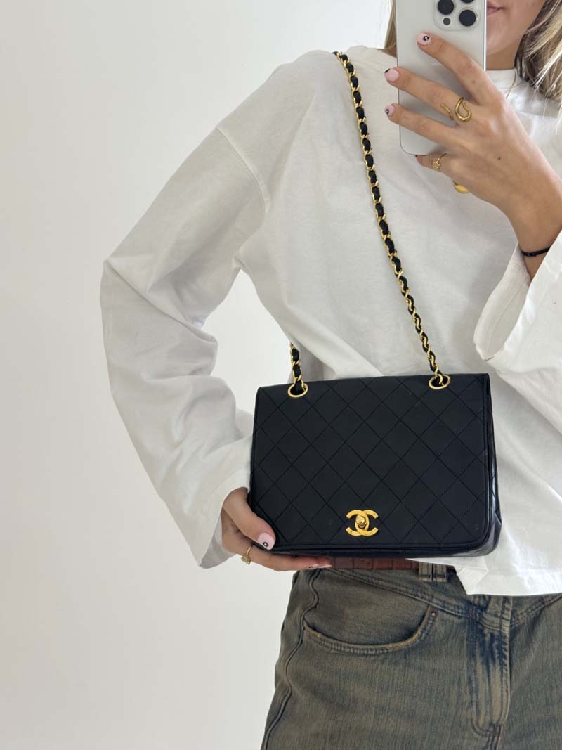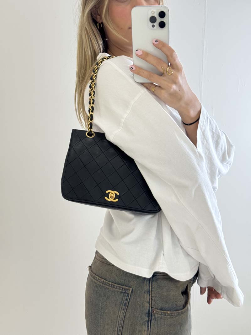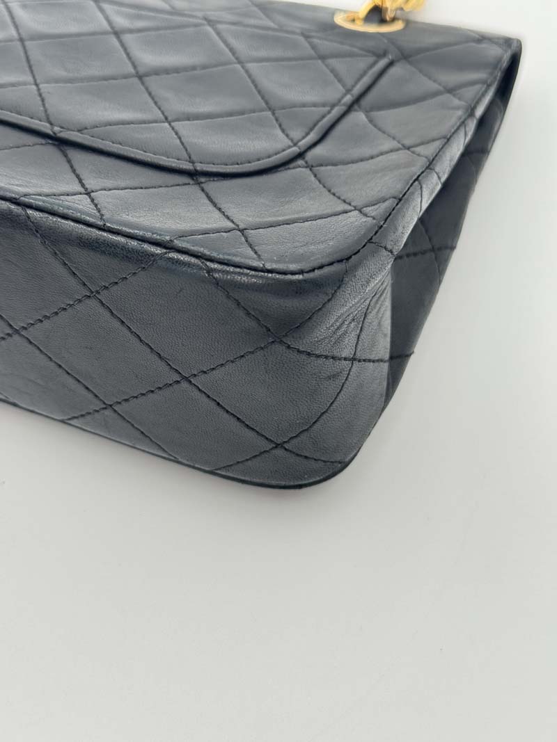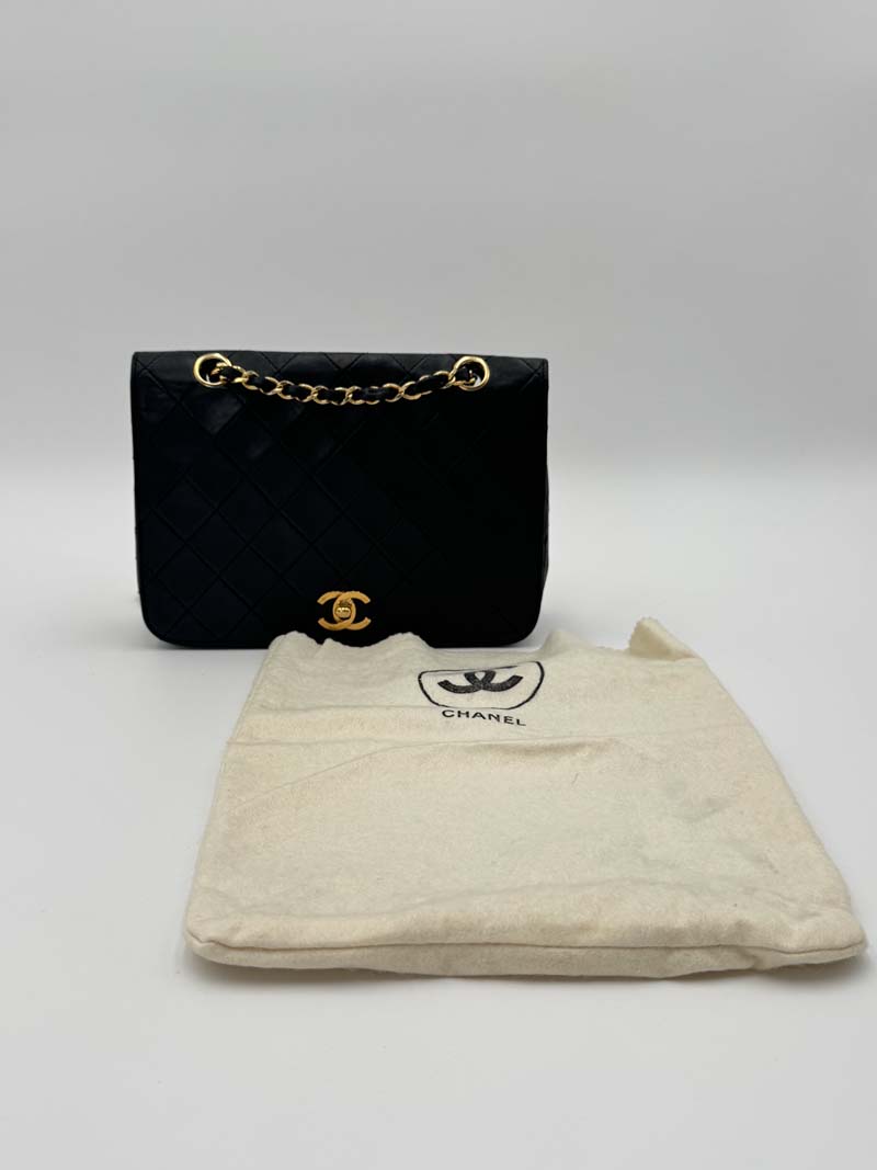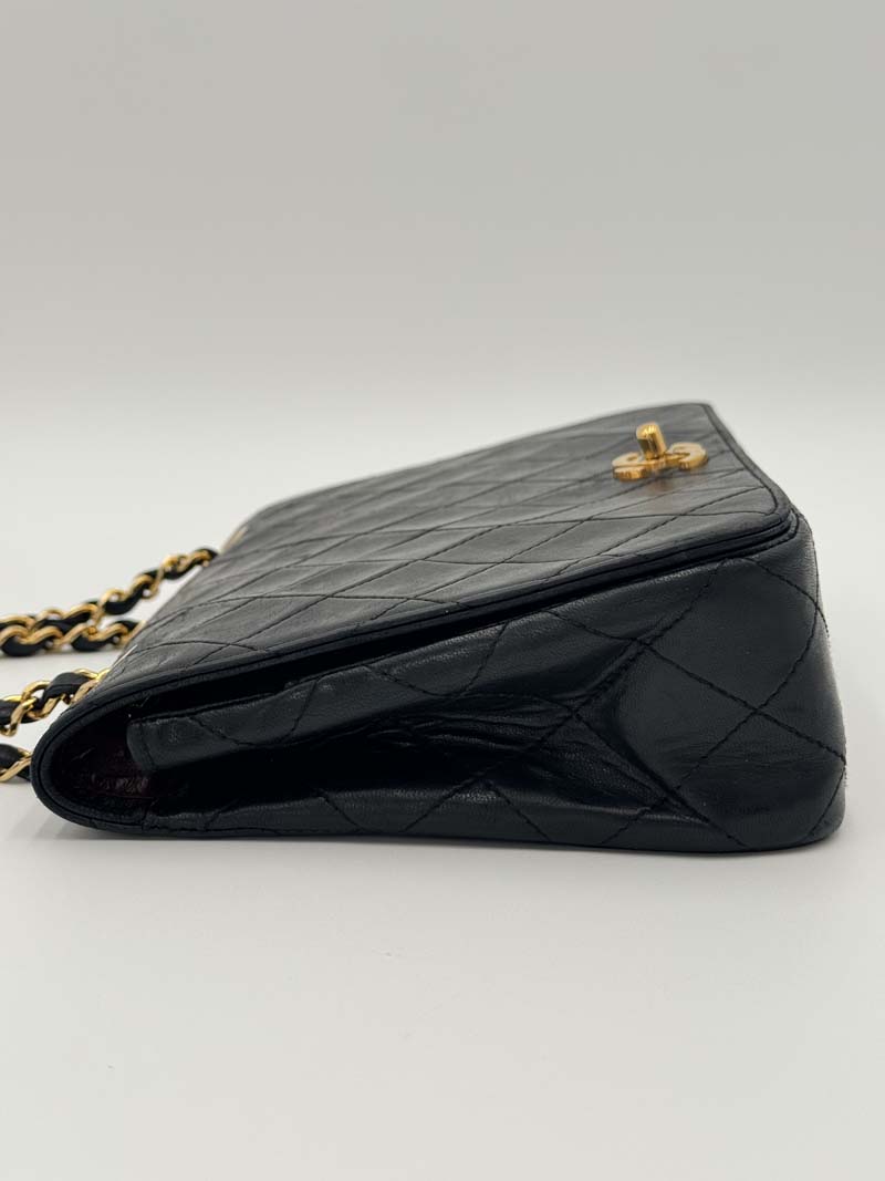This vintage Chanel Classic Single Flap Bag is a shoulder bag made from black lambskin leather with 24k gold-plated hardware. The item shows some user signs but is still in a very good condition, with minimal wear on the corners. The interior is clean and features two extra clean compartments with a twist lock closure. Dimensions: 22.5 x 16.5 x 6.5 cm. The shoulder strap drop is 40 cm. There is no sticker. It comes with a dustbag.