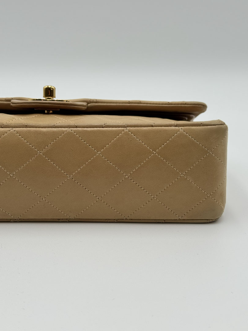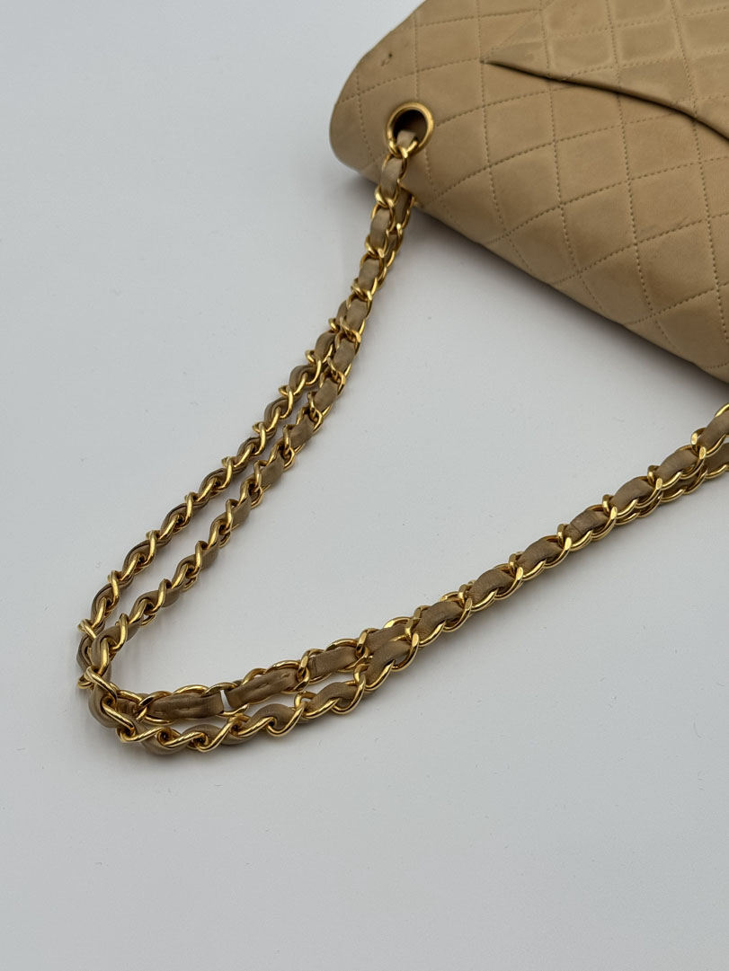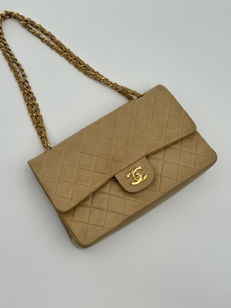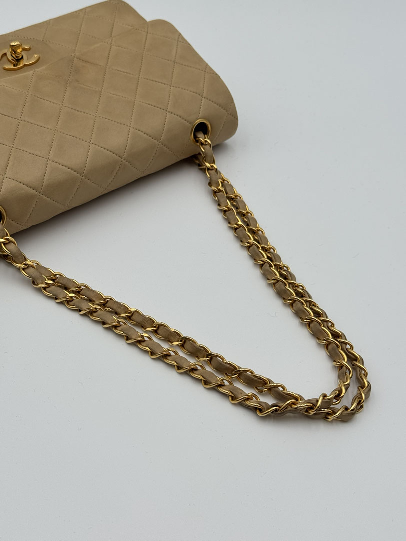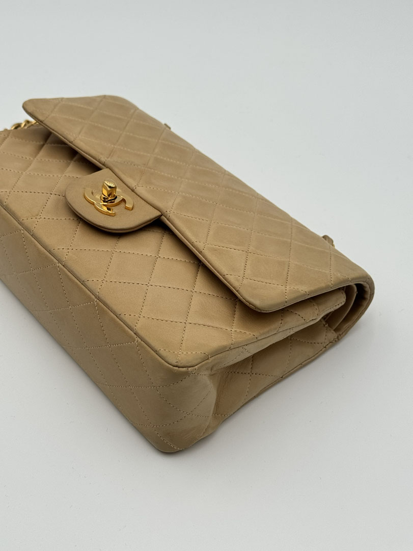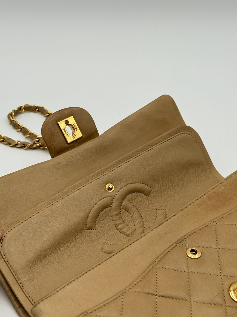 This vintage Chanel Double Flap Bag Medium is a shoulder bag crafted from beige lambskin leather with 24k gold-plated hardware. It is in very good condition, showing minimal imperfections on the leather. The interior is clean with extra compartments. The chain drop is 43 cm, allowing the bag to be worn crossbody (depending on height) or over the shoulder. Dimensions: 25.5 x 16 x 6.5 cm. The serial number is 4727712, dating from 1996–1997.