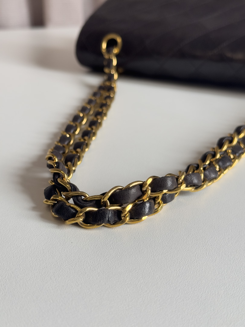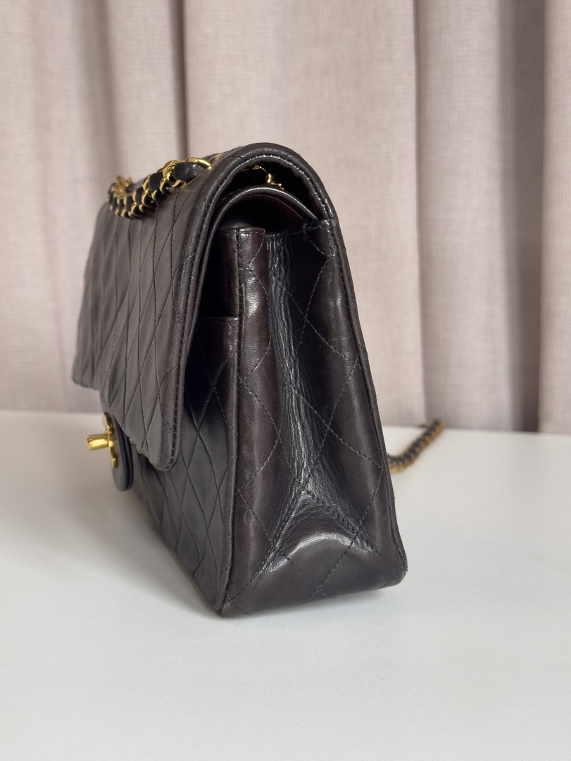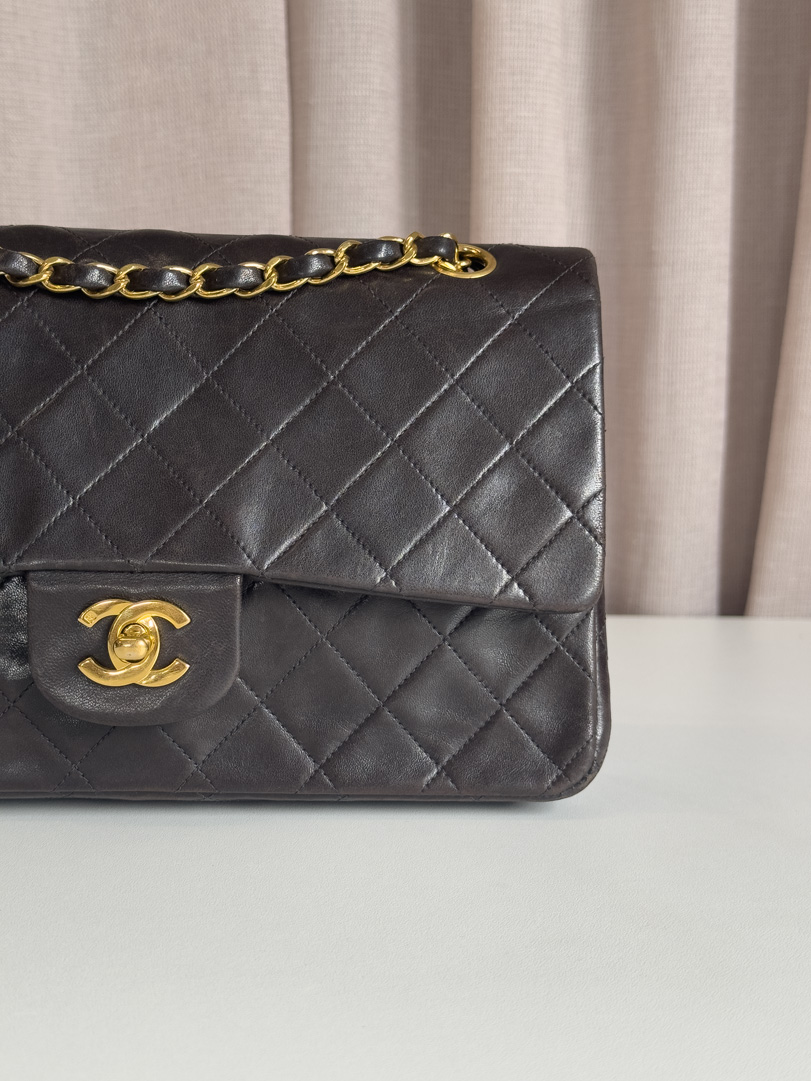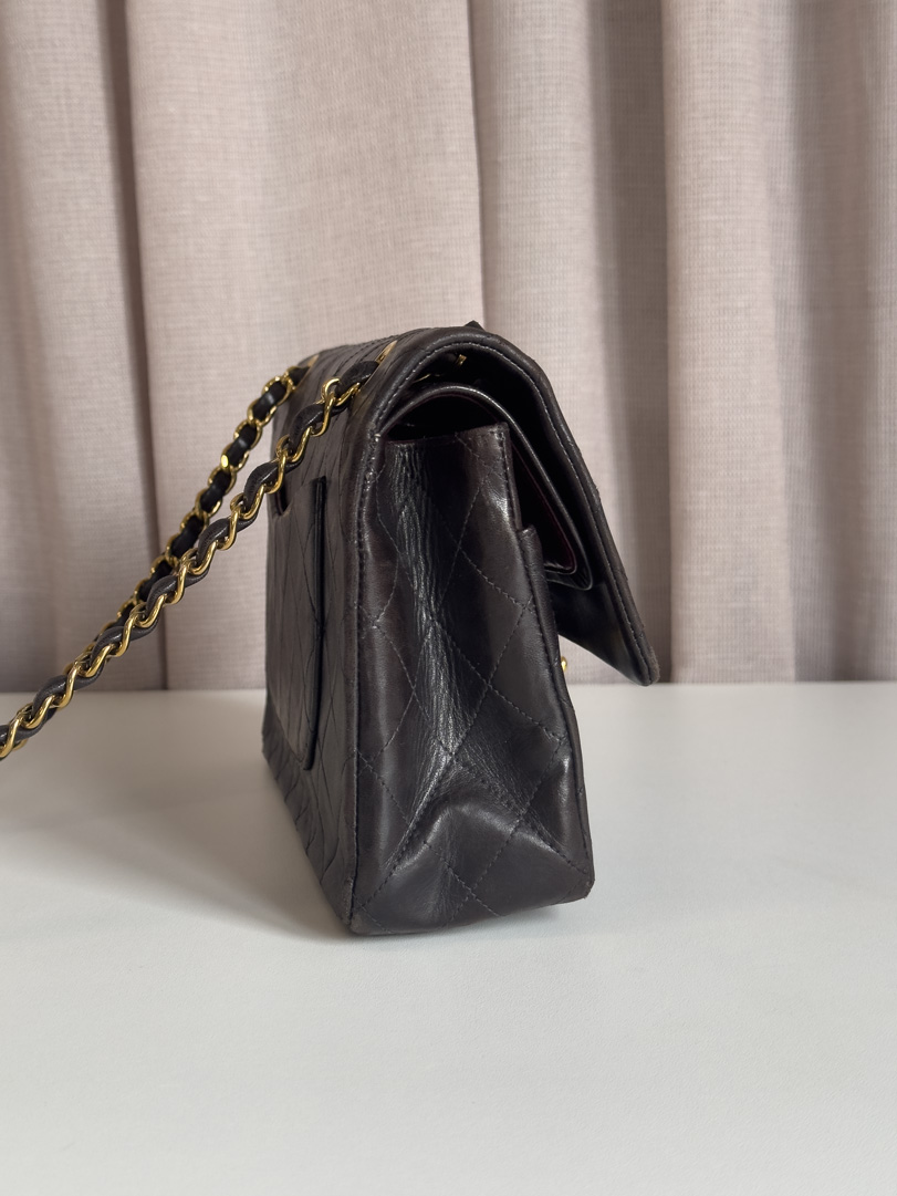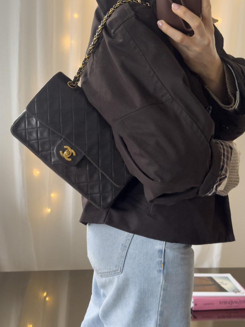 This vintage Chanel Double Flap Bag Medium is a true classic crafted from black lambskin leather with 24k gold plated hardware. It is in good condition, showing visible signs of use such as wear on the corners. Despite these traces of use, the hardware remains beautifully shiny. This iconic piece comes with the original box and dustbag. The serial number is 3754042 (1994–1996). Dimensions: 25.5 x 15.5 x 6 cm.