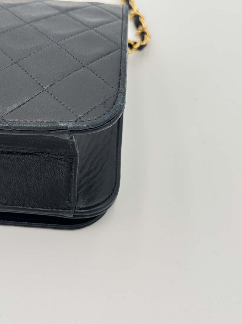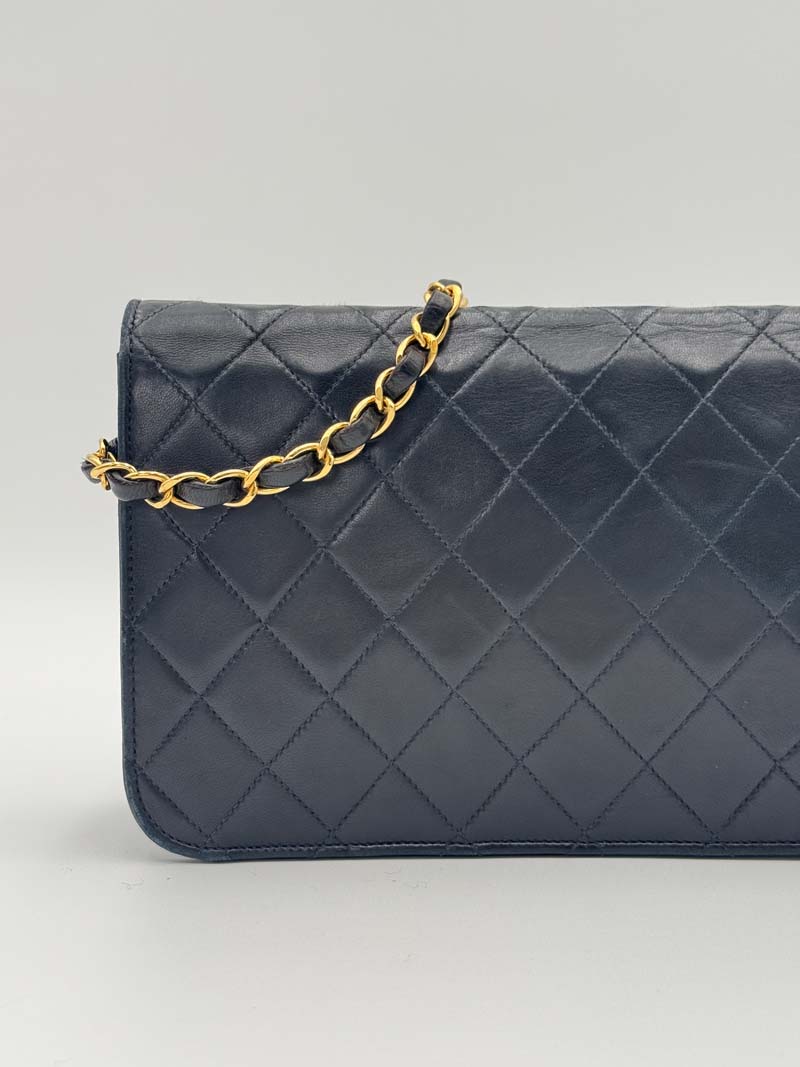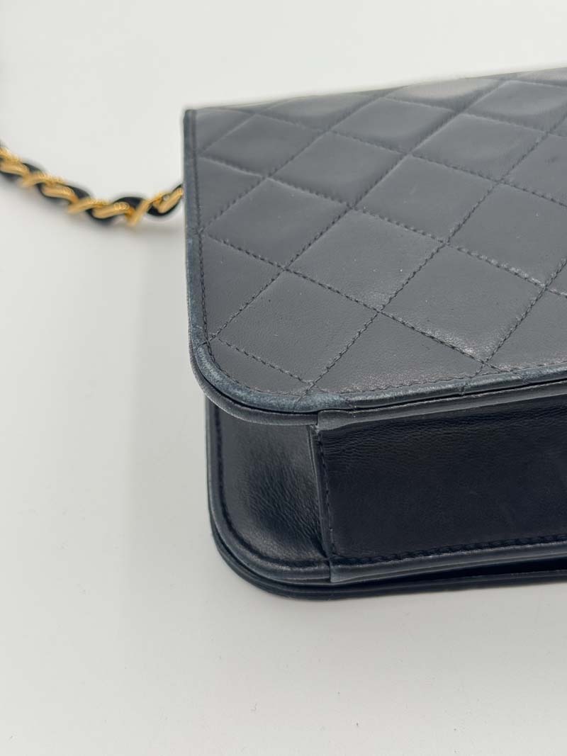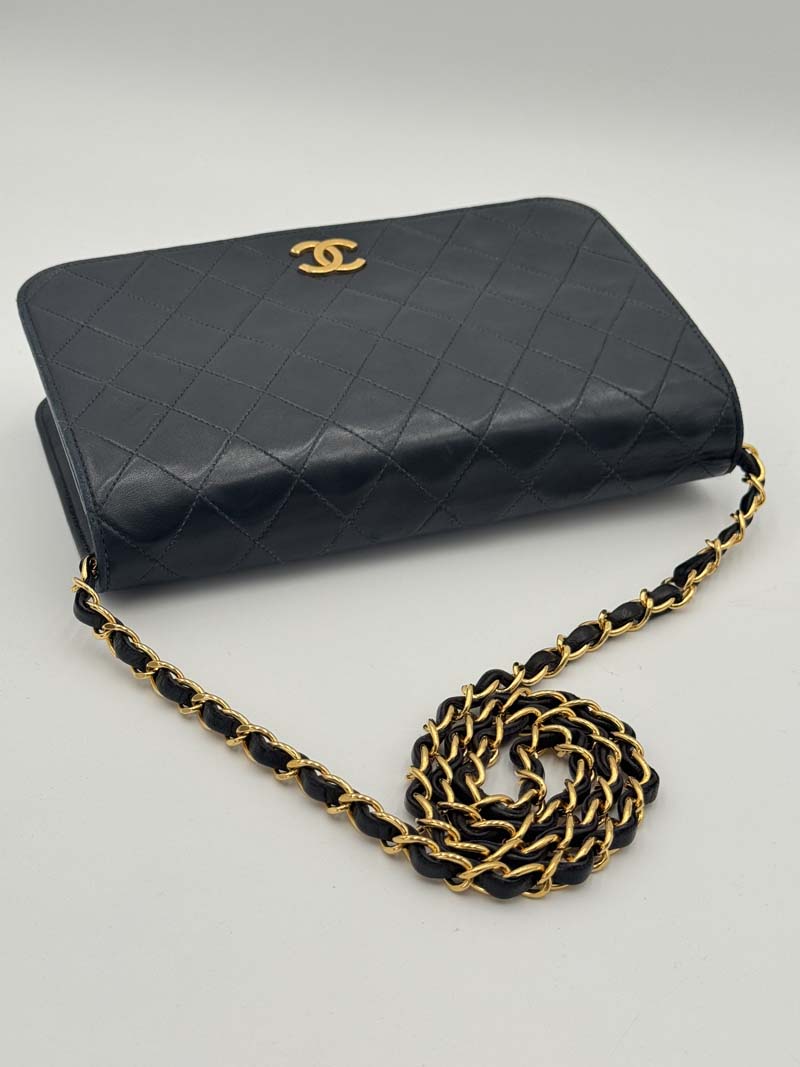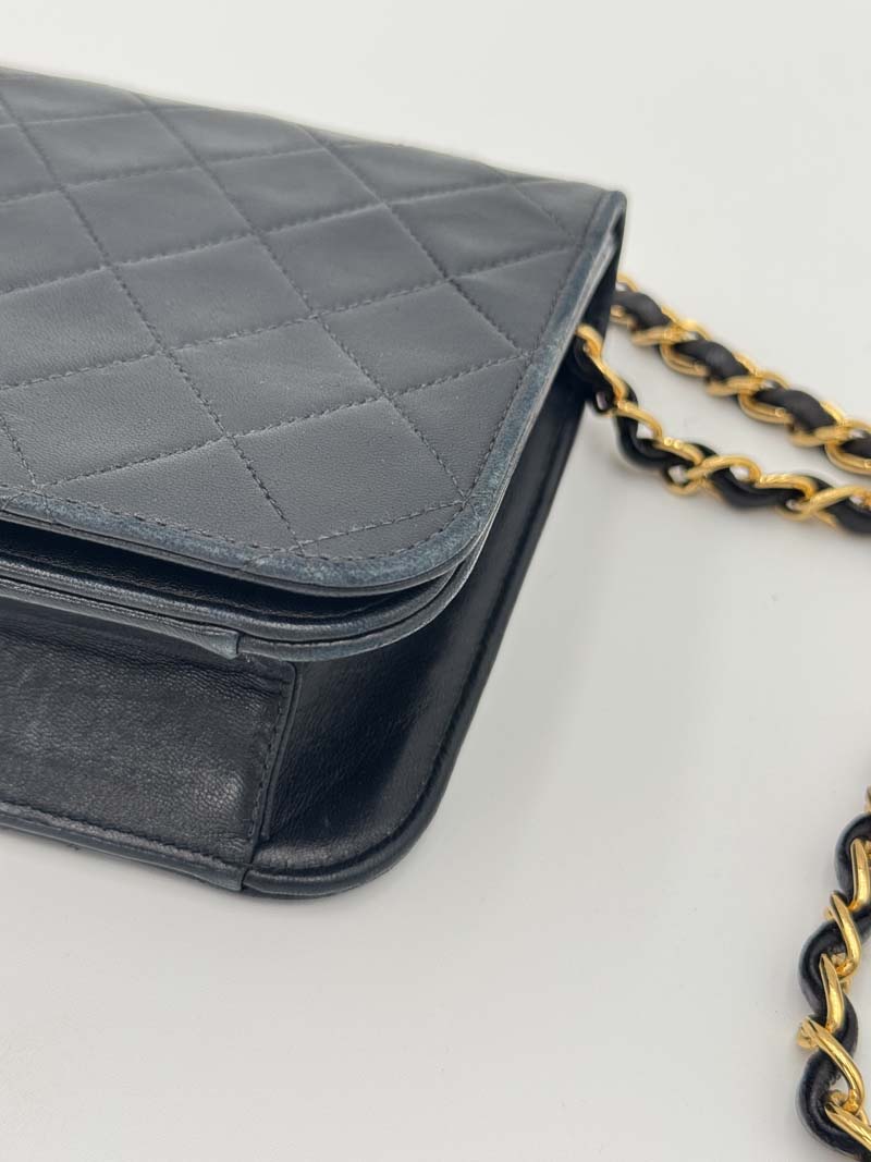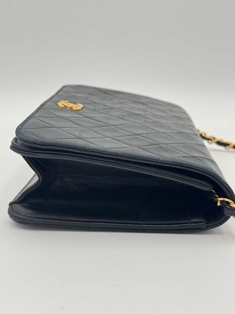 This vintage Chanel Single Flap Bag is a shoulder bag made from black lambskin leather with 24k gold-plated hardware. The item shows some user signs but is still in a very good condition, with minimal wear on the corners and small dents on the leather at the back. The interior is clean and features one extra clean compartment with a snap button closure. Dimensions: 23.5 x 14 x 6 cm. The shoulder strap drop is 42 cm. The serial number is 4843779 from 1996-1997. It comes with booklets.