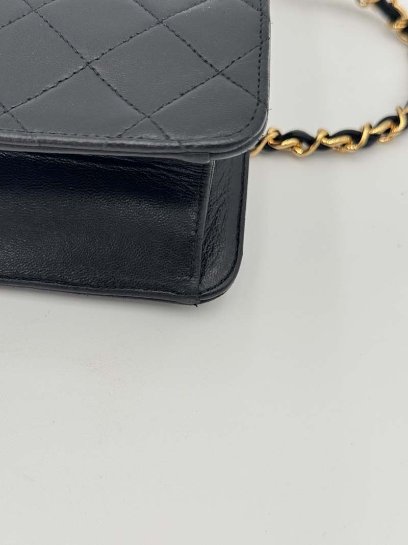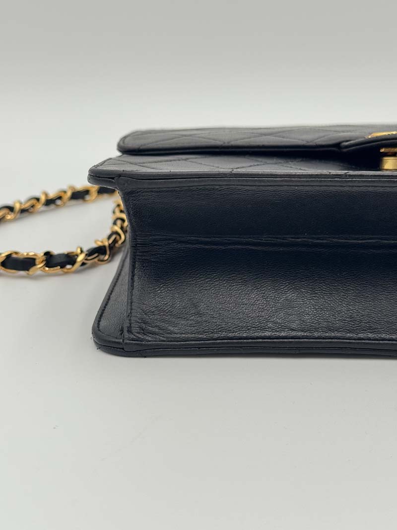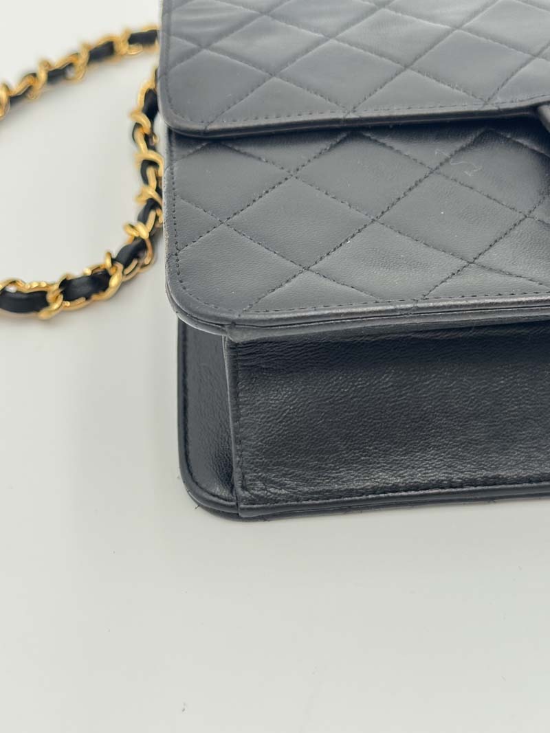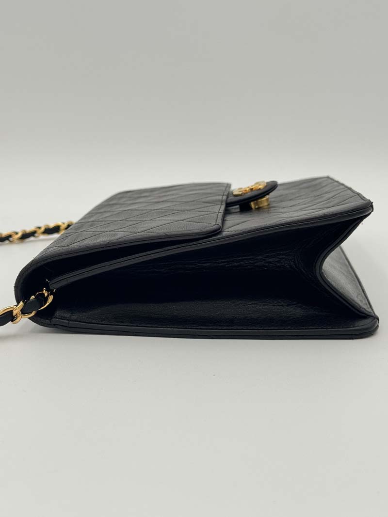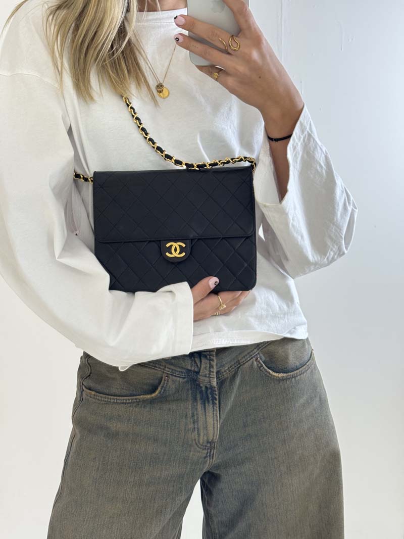 This vintage Chanel Single Flap Bag is a shoulder bag made from black lambskin leather with 24k gold-plated hardware. The item shows some user signs but is still in a very good condition, with minimal dents on the leather at the back. The interior is clean and features one extra clean compartment with a snap button closure. Dimensions: 22 x 17 x 6 cm. The shoulder strap drop is 42 cm. The serial number is 3785281 from 1994-1996.