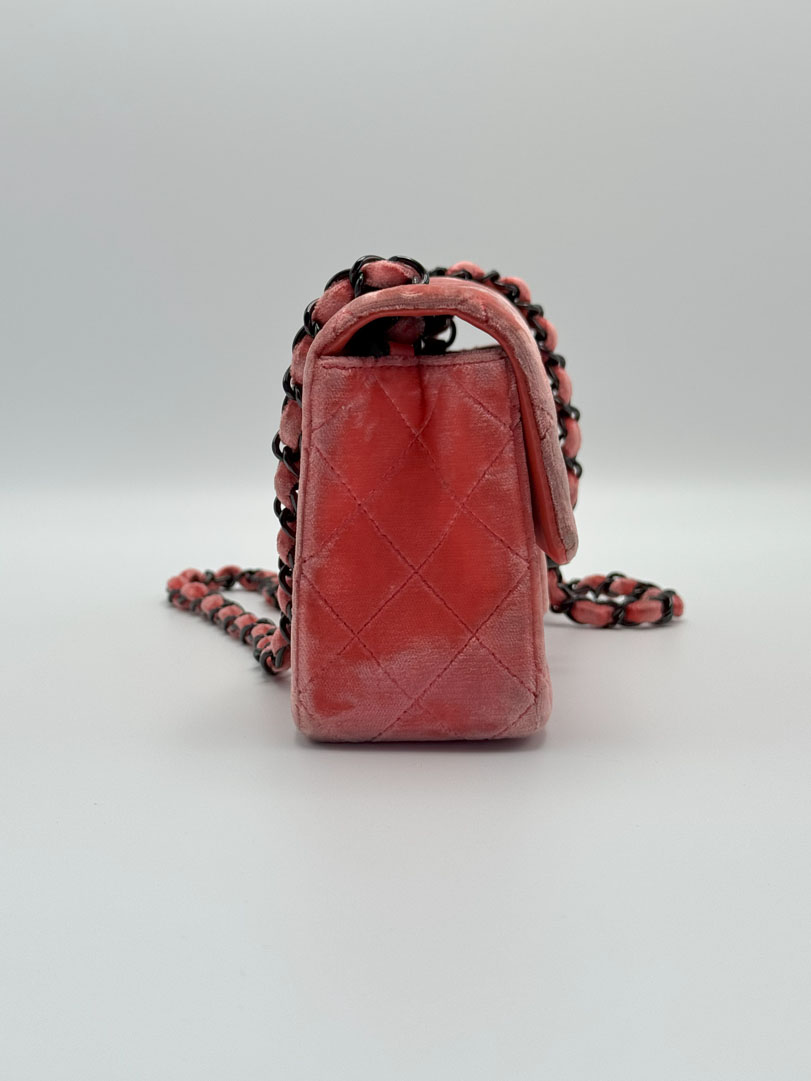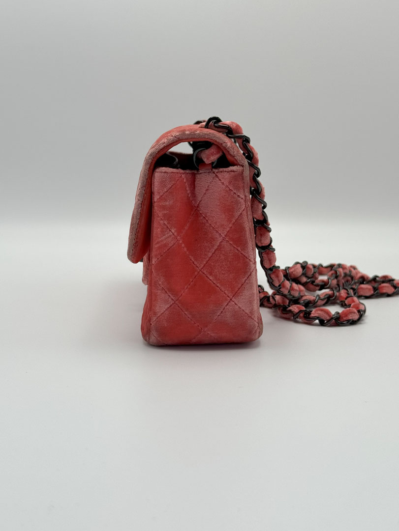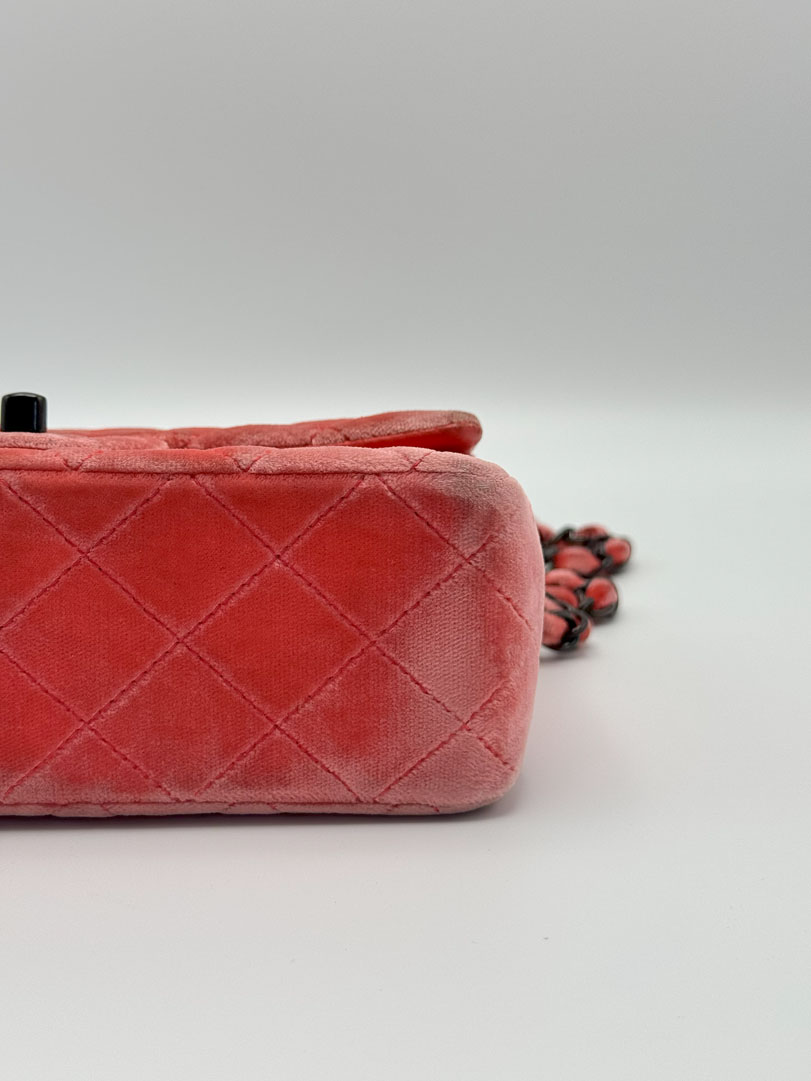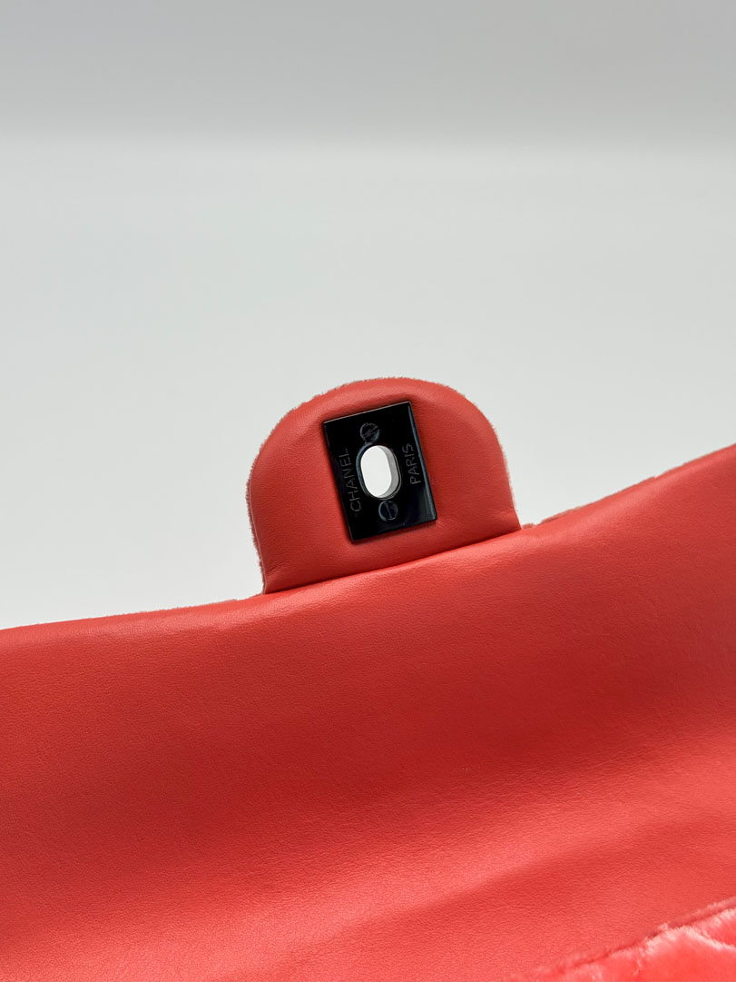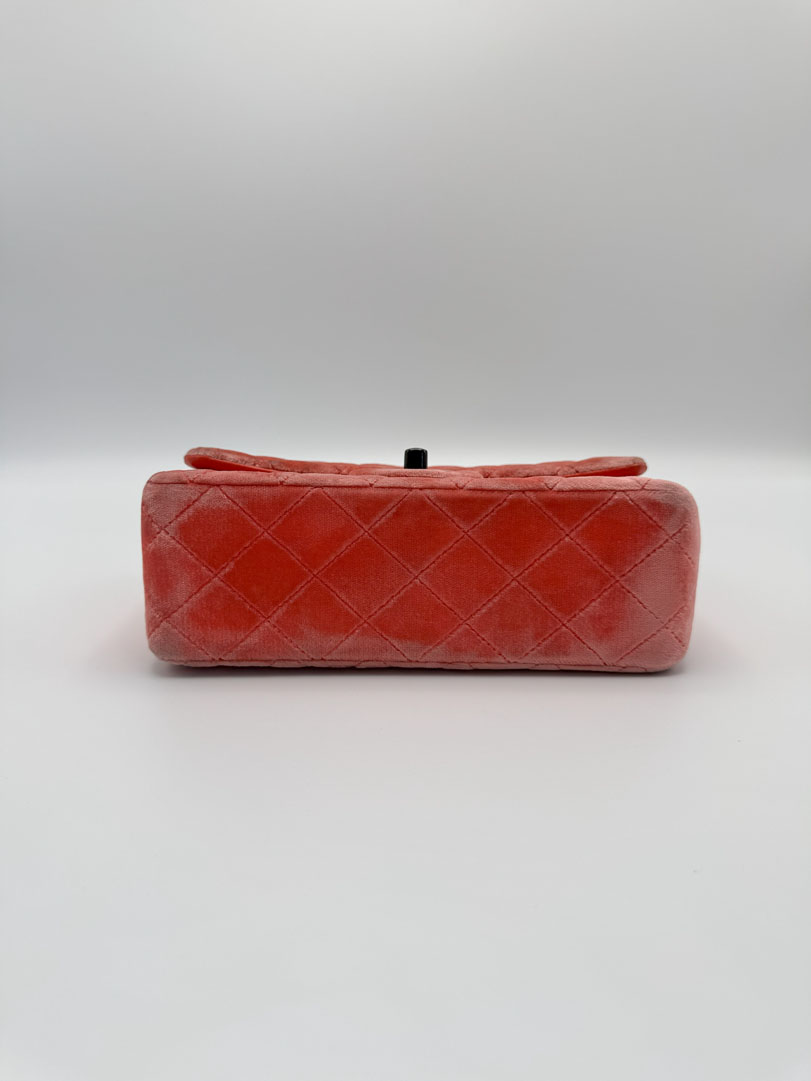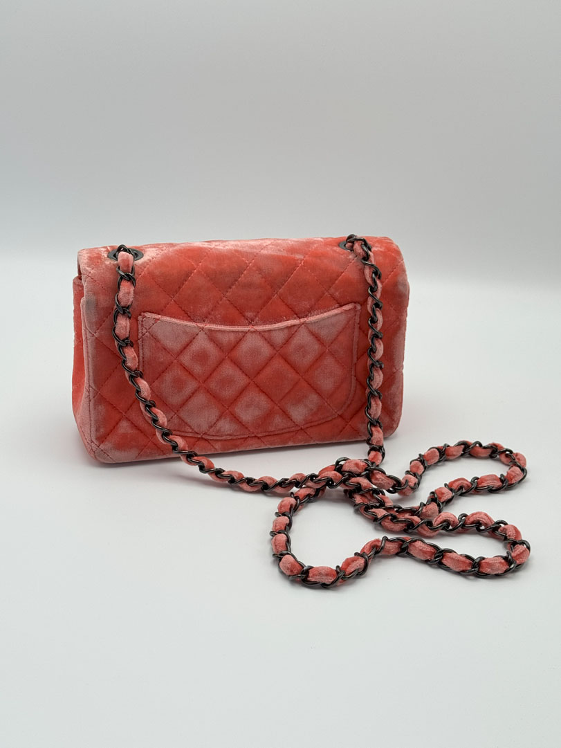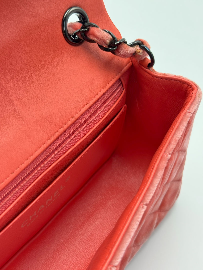 This stunning Chanel Single Flap Bag in coral velvet is a true eye-catcher. It is in very good condition with only minor imperfections. With dimensions of 20 x 12 x 7 cm, it is compact yet spacious enough for essentials. The chain strap has a 56 cm drop, allowing it to be worn both crossbody and over the shoulder. A stylish and striking accessory for any occasion. The serial code is 20273308.
