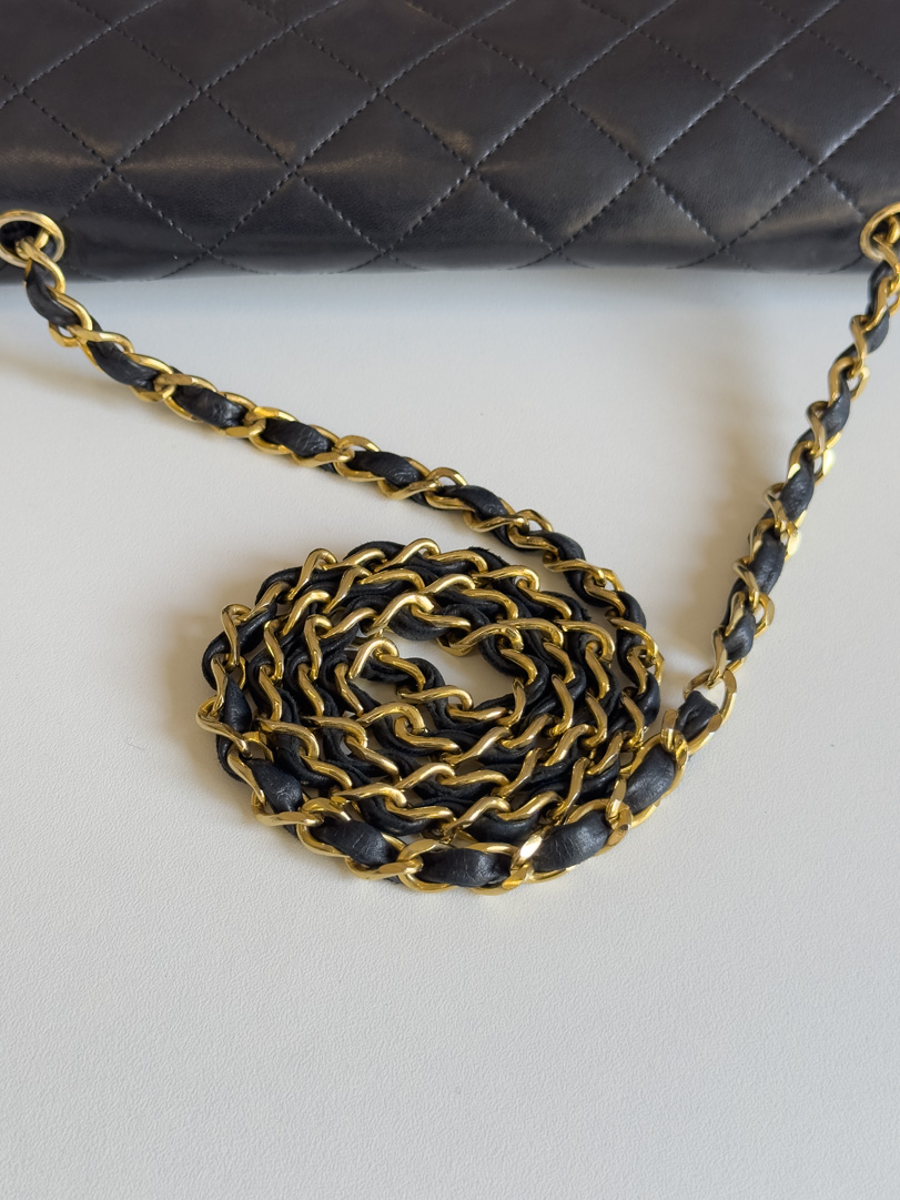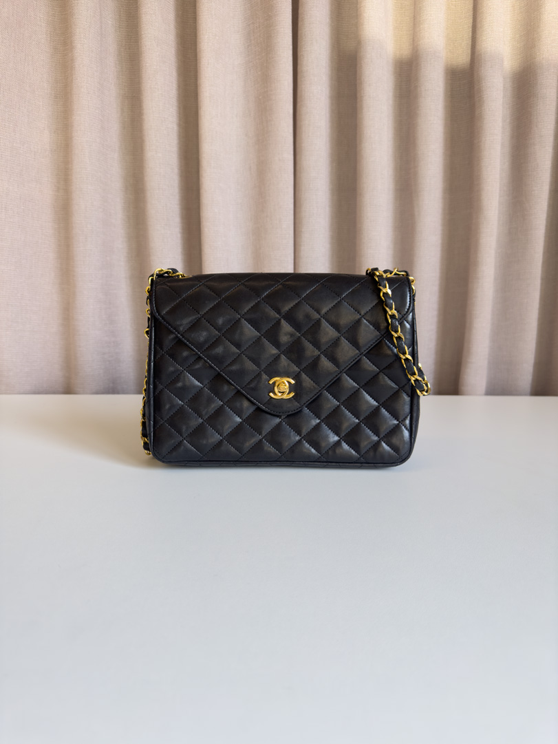 This pre-loved Chanel Single Flap Envelope Bag is a gorgeous vintage find crafted from soft and puffy black lambskin with 24k gold-plated hardware. The hardware still shines beautifully, the turnlock functions properly, and the interior is clean. The bag is in very good condition, with some light wear on the corners, and the serial sticker is no longer legible. It can be worn both over the shoulder and crossbody with a chain drop of 45 cm. Dimensions are 23 x 17 x 6 cm.