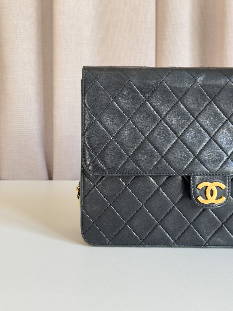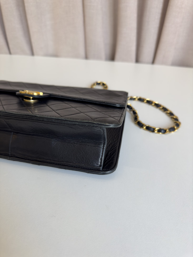 This vintage Chanel Single Flap Shoulder Bag is a true classic crafted from black lambskin leather with 24k gold plated hardware. It is in very good condition, showing only minimal signs of use such as light wear on the edges, which are barely visible. The hardware still shines beautifully, and the interior is clean, featuring a zippered pocket. The bag closes with a push lock and is worn over the shoulder with a comfortable 32 cm chain drop. Dimensions: 25 x 18 x 7 cm.