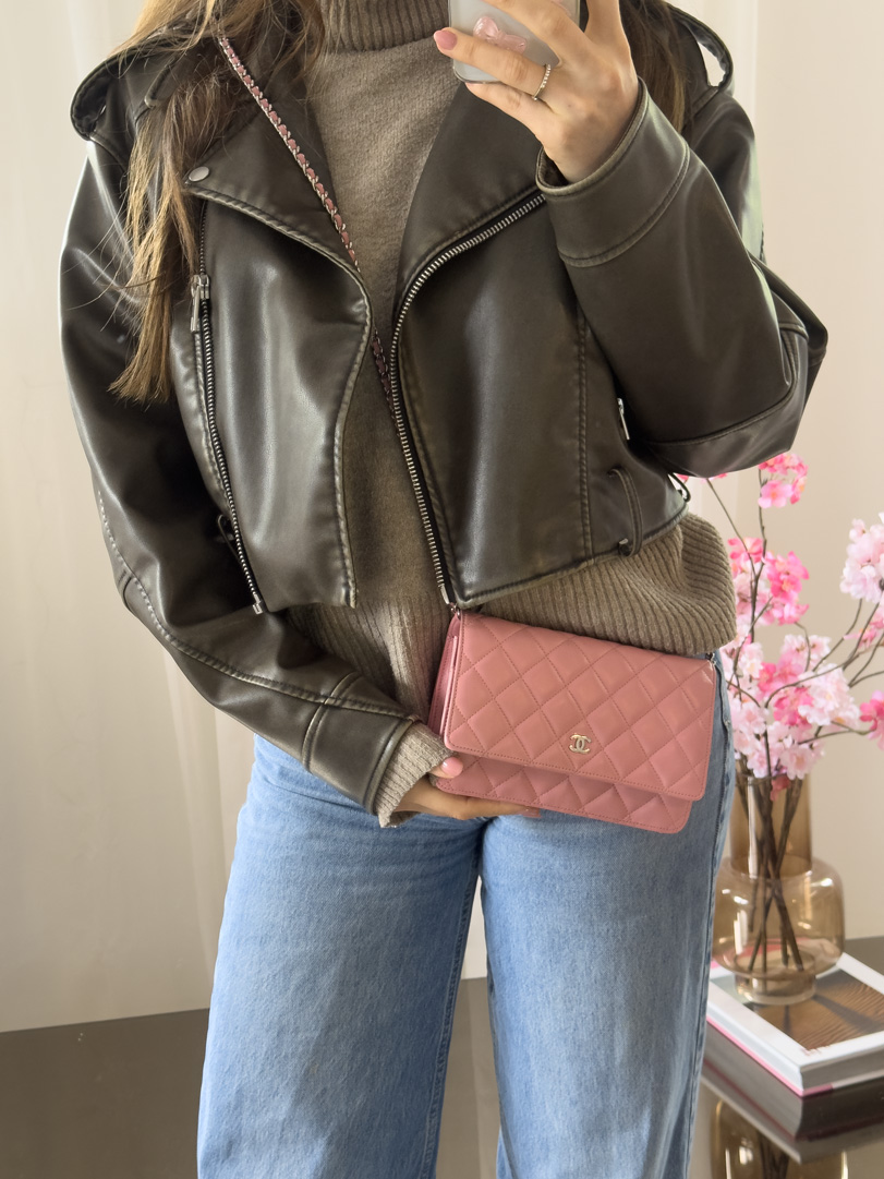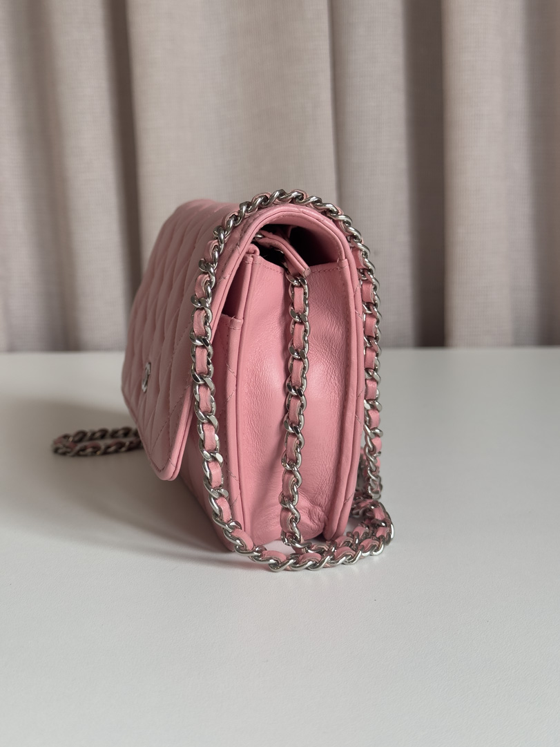 This Chanel Wallet On Chain in soft pink lambskin is a beautiful and feminine piece in very good condition. The buttery leather is complemented by silver-tone hardware, creating a refined yet playful look. The bag shows minimal signs of previous use, with only very light imperfections. The interior is clean and well-maintained. Its versatile design allows it to be worn crossbody or over the shoulder, making it ideal for both daytime outings and evening occasions. Series 16. Dimensions: 19 × 13 × 4 cm.