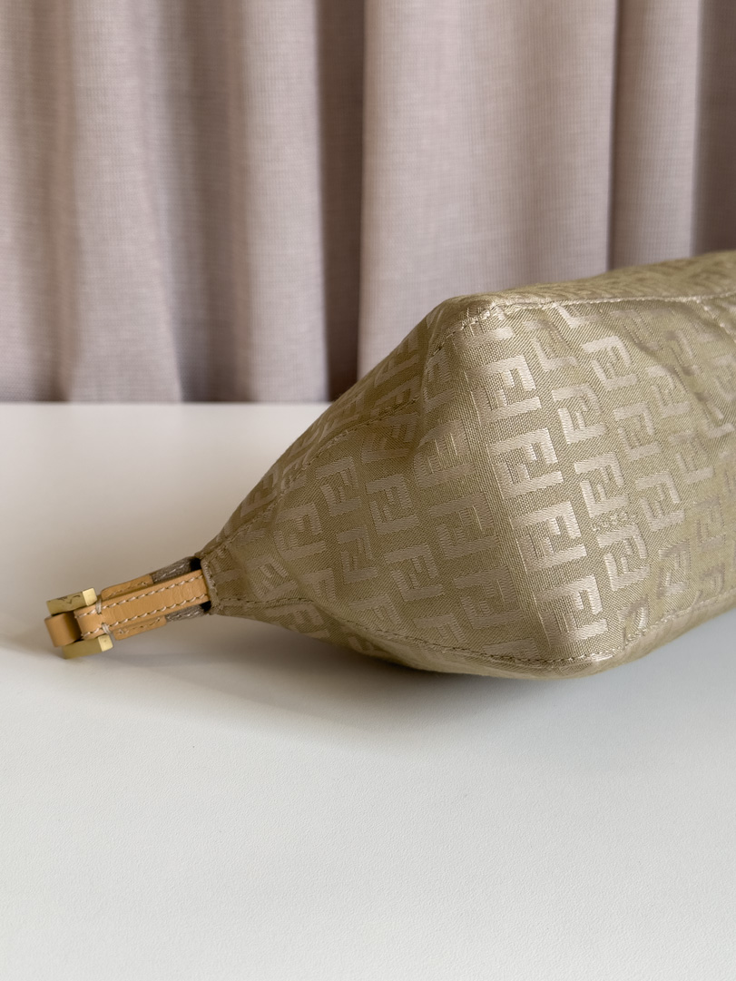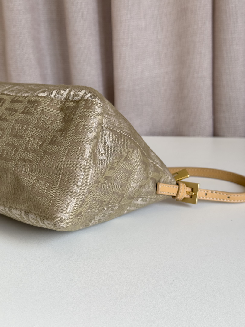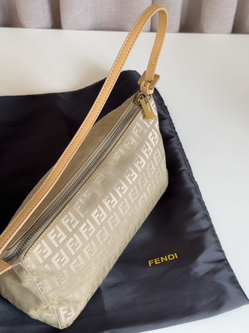 This pre-loved Fendi Zucca Shoulder Bag is a vintage shoulder bag in excellent condition, showing little to no signs of use. It features a light khaki green and beige color combination with gold-tone hardware. The zipper functions perfectly and the interior is clean. A beautiful piece in superb condition. This bag comes with a dustbag. Dimensions: 25 x 15 x 9 cm.