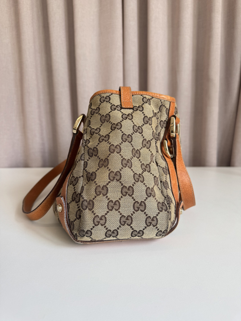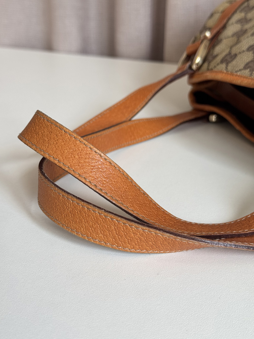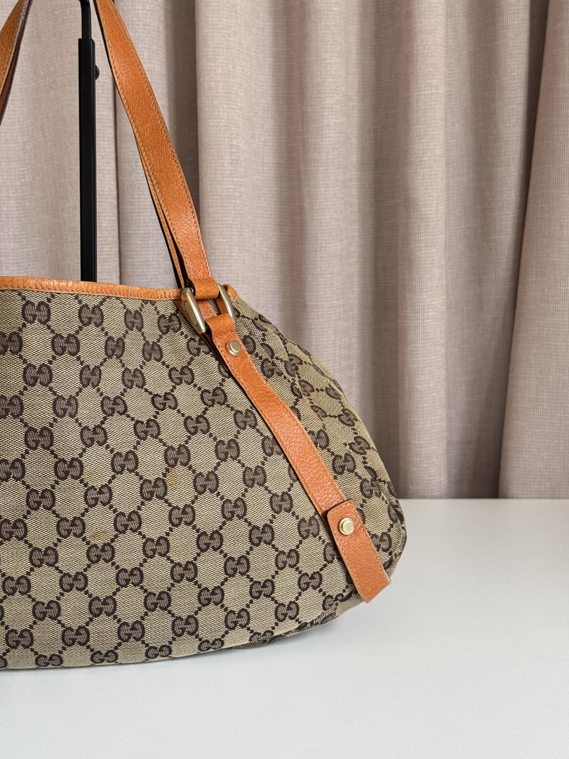 This vintage Gucci Abbey Bag is a spacious shoulder bag made from GG canvas with orange leather and champagne-tone hardware. It is in very good condition, with a few marks on the canvas and some wear on the leather. The interior is clean and includes an extra zippered pocket. The serial number is 130736002122. Dimensions: 41 x 25 x 10 cm.