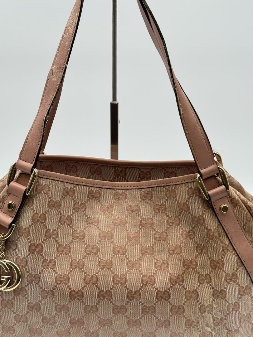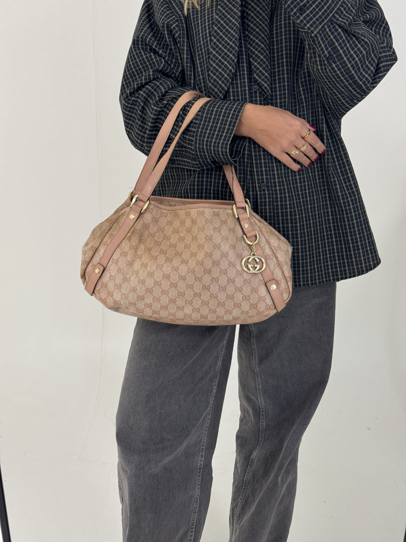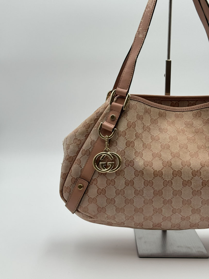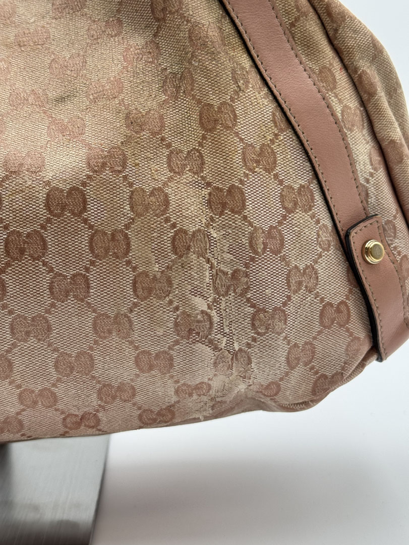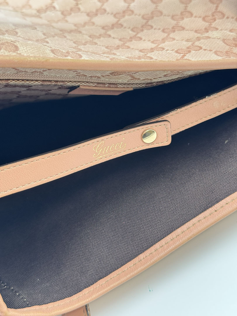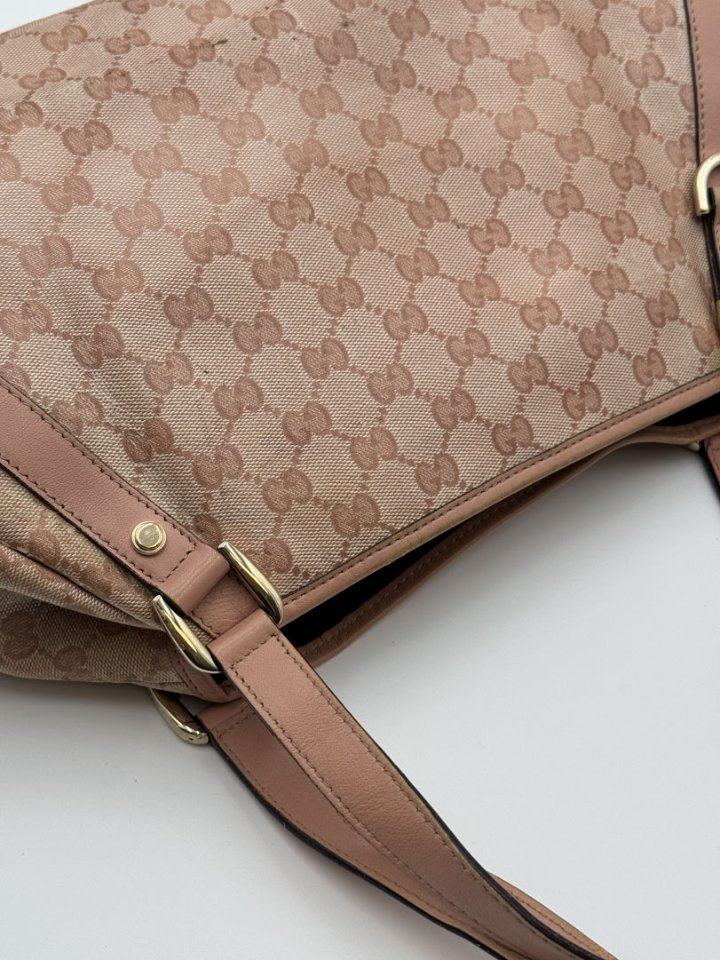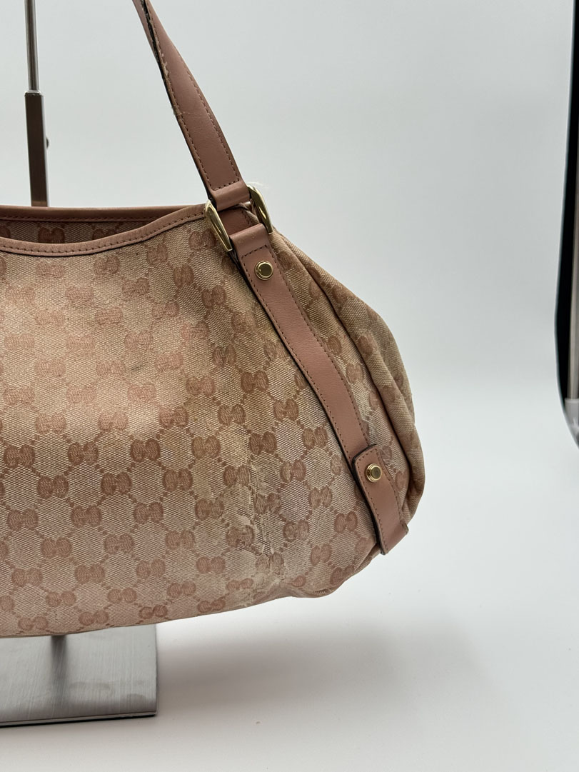 This vintage Gucci Abbey Pink is a shoulder bag crafted from pink GG Supreme canvas with champagne-tone hardware. It is in 'worn with love' condition, with signs of use on the exterior and slight discoloration that may lift slightly. The hardware is in good condition. The interior is clean with an extra pocket and a few small stains. Dimensions: 34 x 23 x 9 cm. The serial number is 130736 002122.