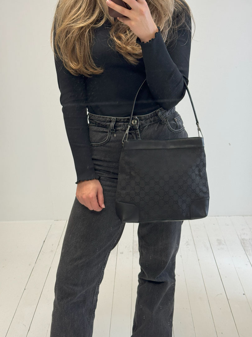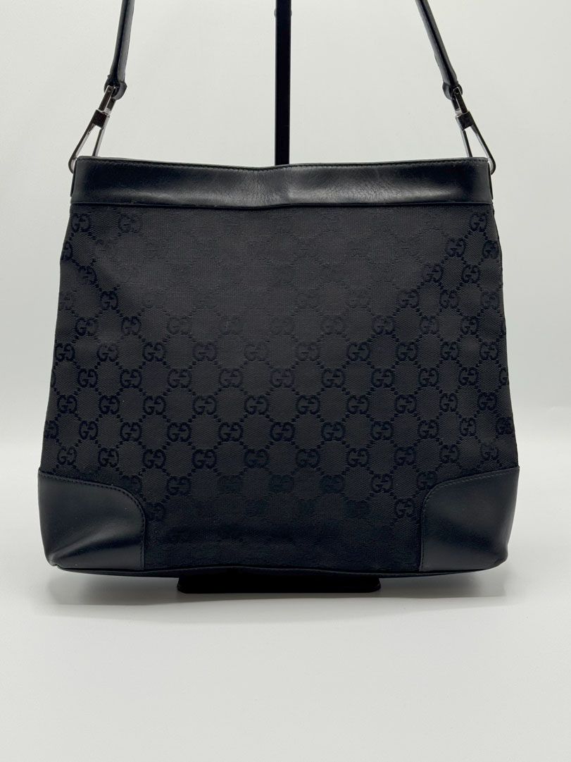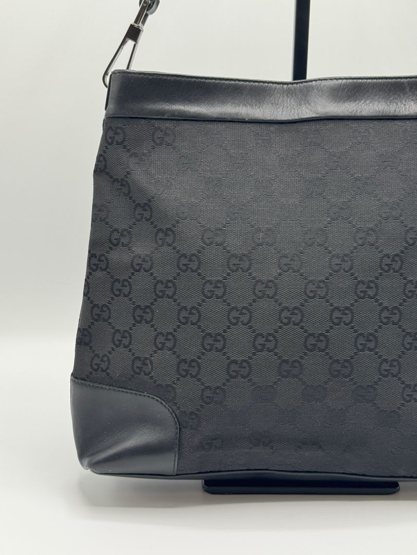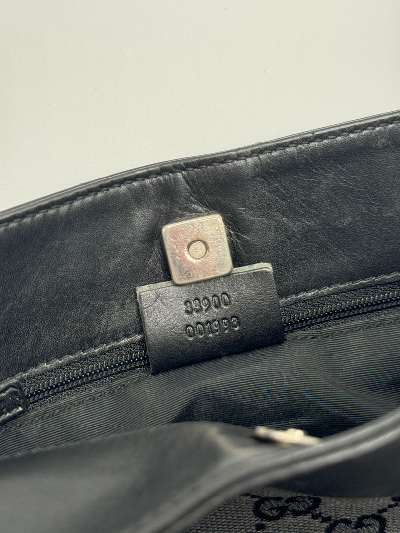 This vintage Gucci Black GG Canvas Shoulder Bag is a shoulder bag crafted from black GG canvas with silver-tone hardware. It is in very good condition, showing minimal imperfections but overall still in a nice state. The interior is clean with an additional pocket. The serial number is 33900001998. Dimensions: 27.5 x 26 x 5.5 cm.