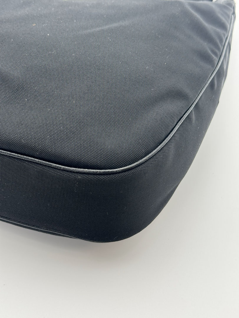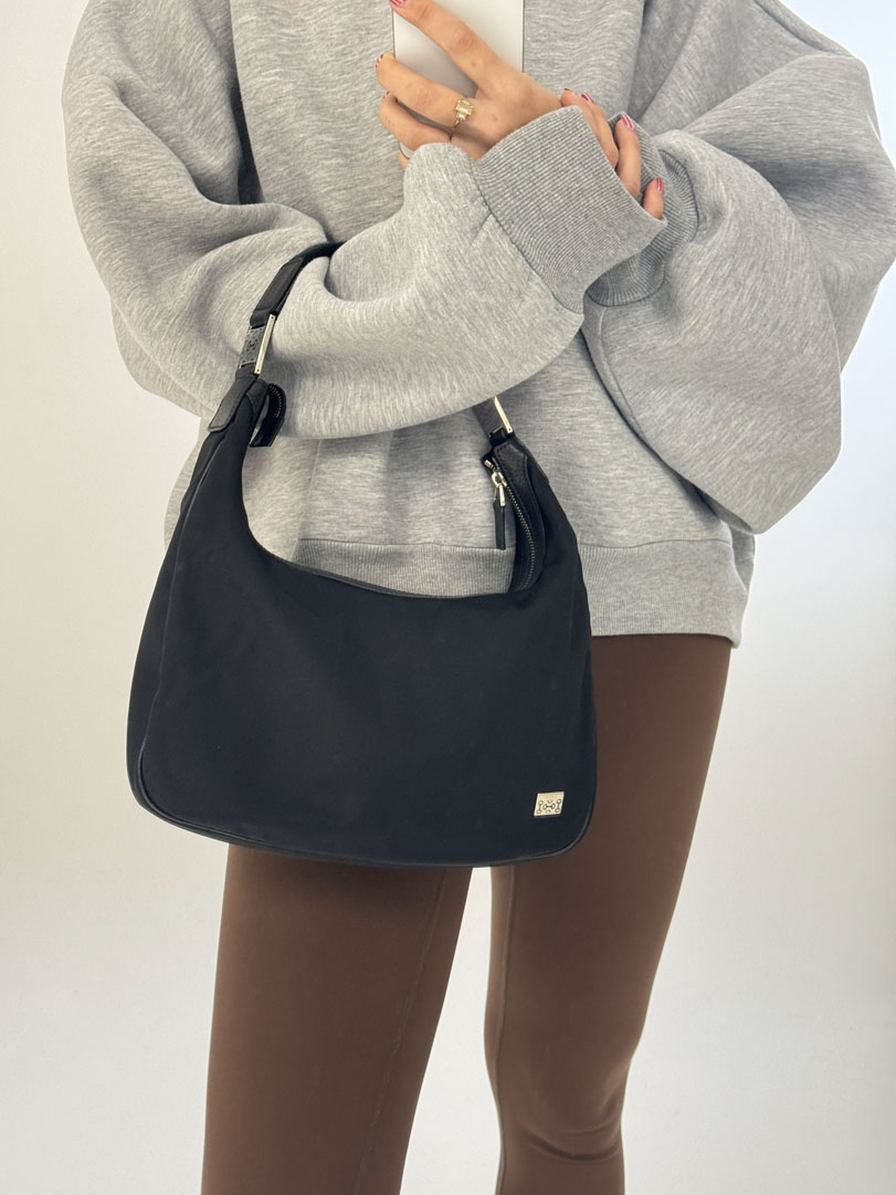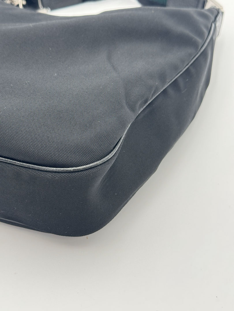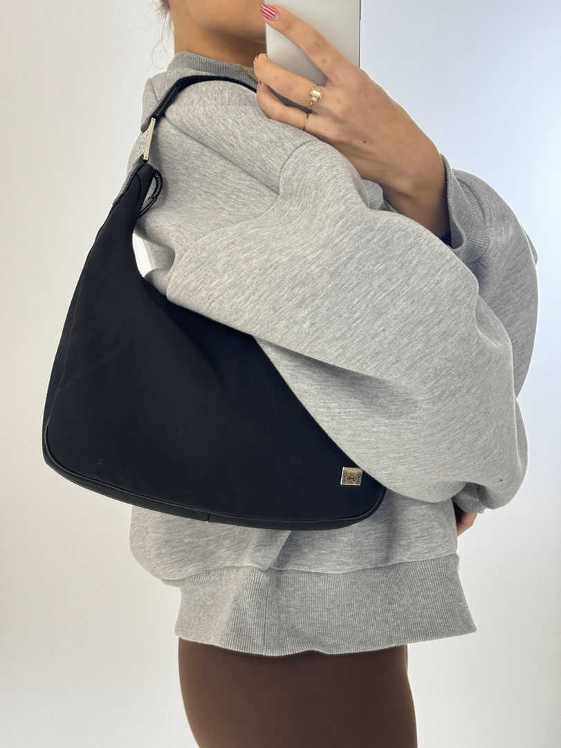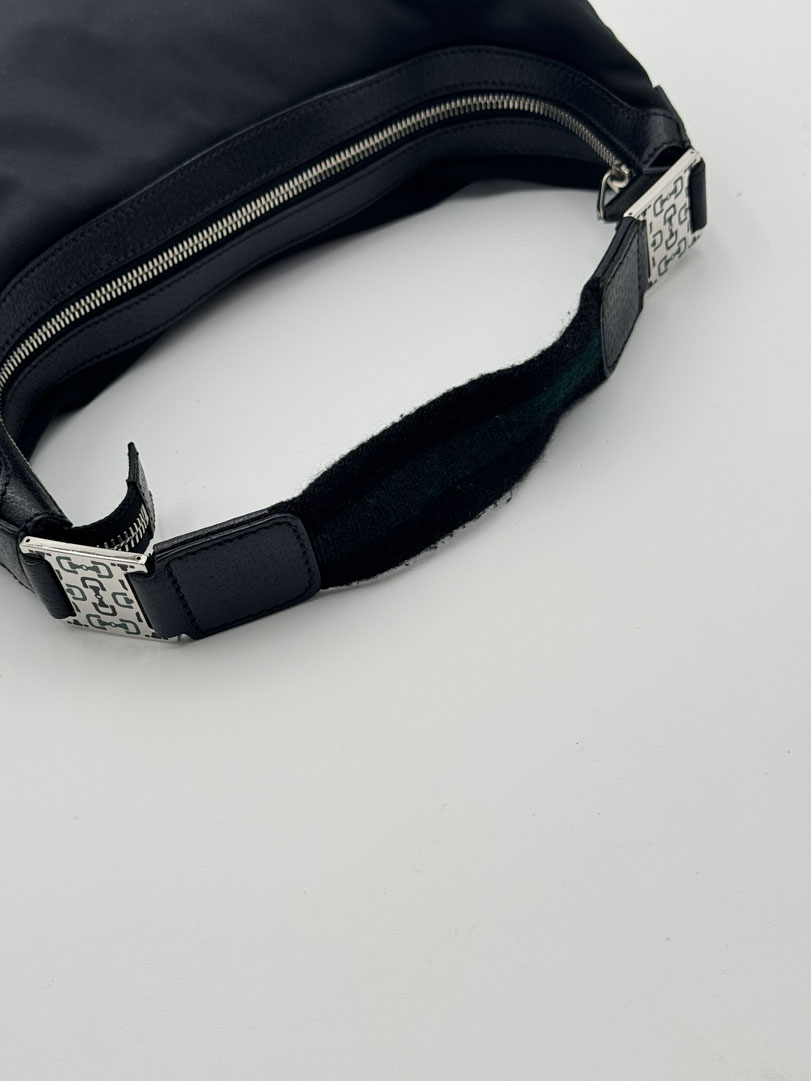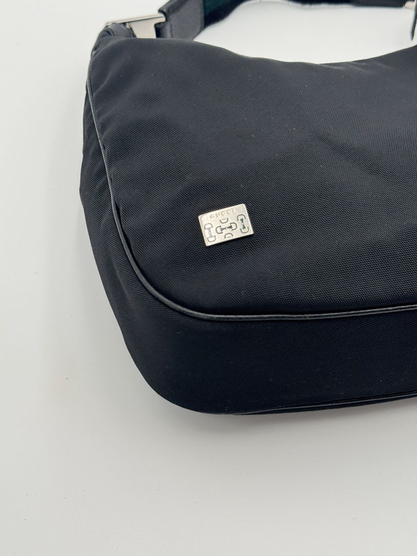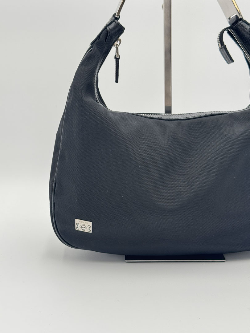 This vintage Gucci Black Hobo Bag is a shoulder bag made from black nylon with silver-tone hardware. The item is in very good condition, showing some user signs such as fraying on the strap. The interior is clean and features an extra pocket. The serial number is 145757 002058, and the dimensions are 30 x 19 x 6.5 cm.