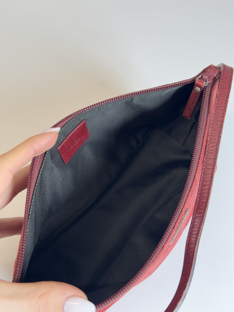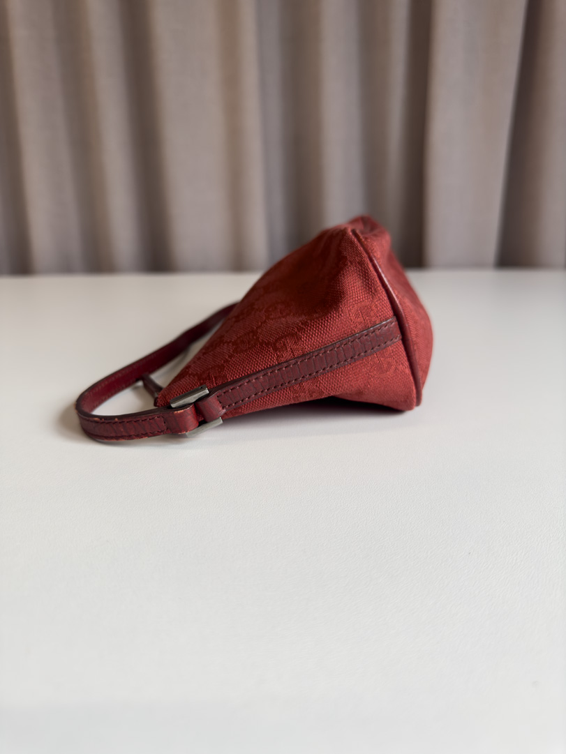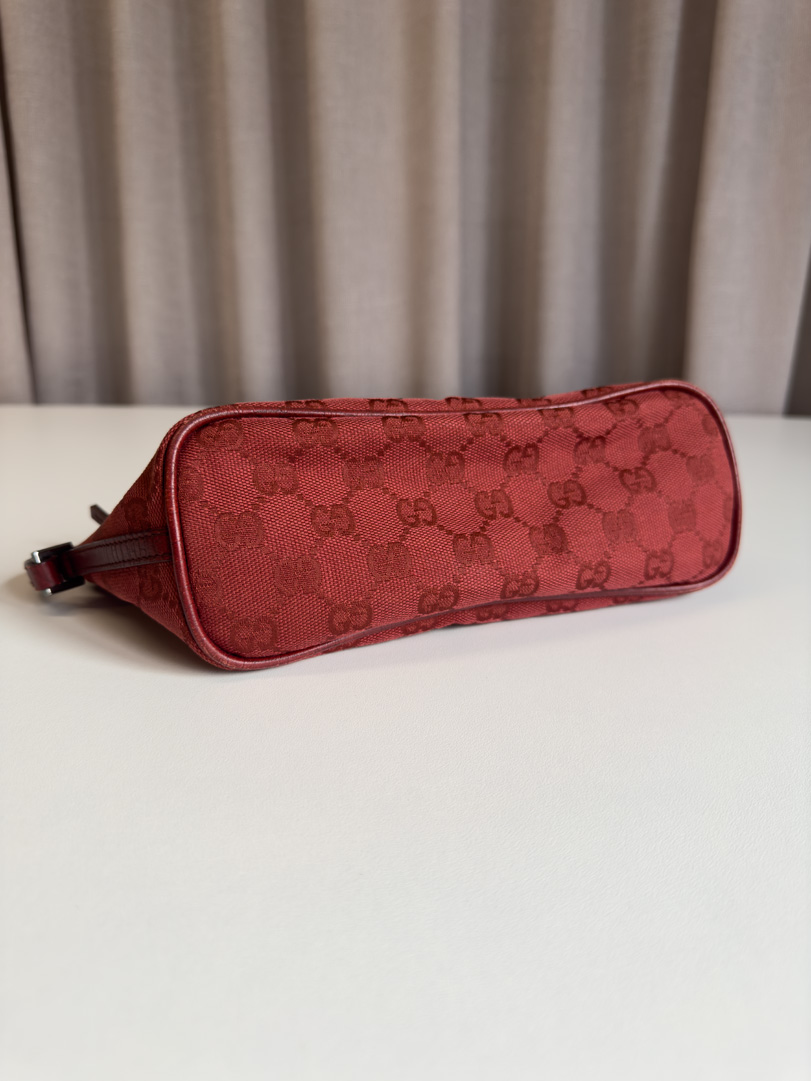 This preloved Gucci Boat Bag in red GG canvas is in very good vintage condition. It shows light signs of wear, such as small imperfections on the leather. Designed to be carried by hand, it may not fit comfortably over the arm. Dimensions: 27 x 11 x 10 cm.