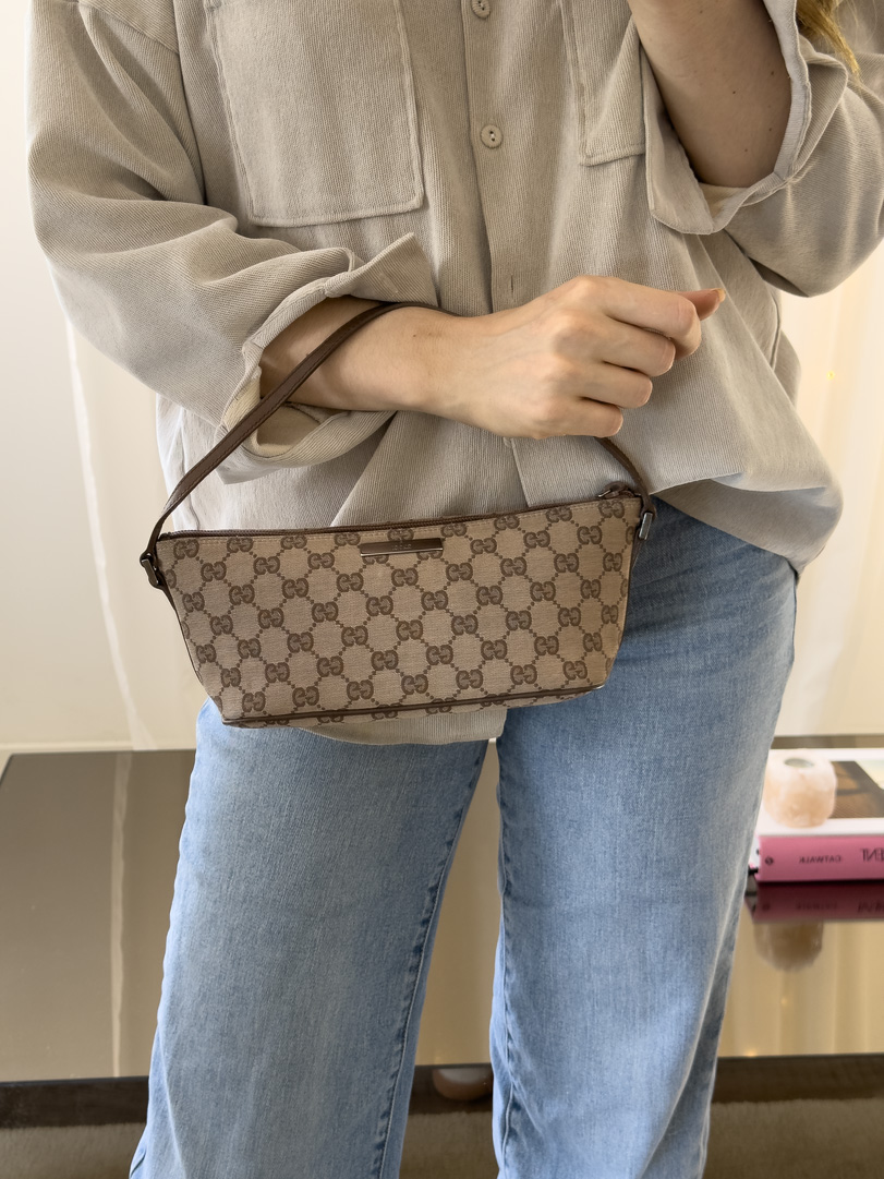 This vintage Gucci Boat Bag is made from brown GG canvas with brown leather and silver-tone hardware. It is in very good condition, missing the zipper pull but otherwise in near-excellent shape. The zipper still functions well, and a charm or pull could be added. The interior is completely clean. Note: this is a handbag and may not fit over the shoulder. The serial number is 3911032123. Dimensions: 27 x 10 x 7.5 cm.