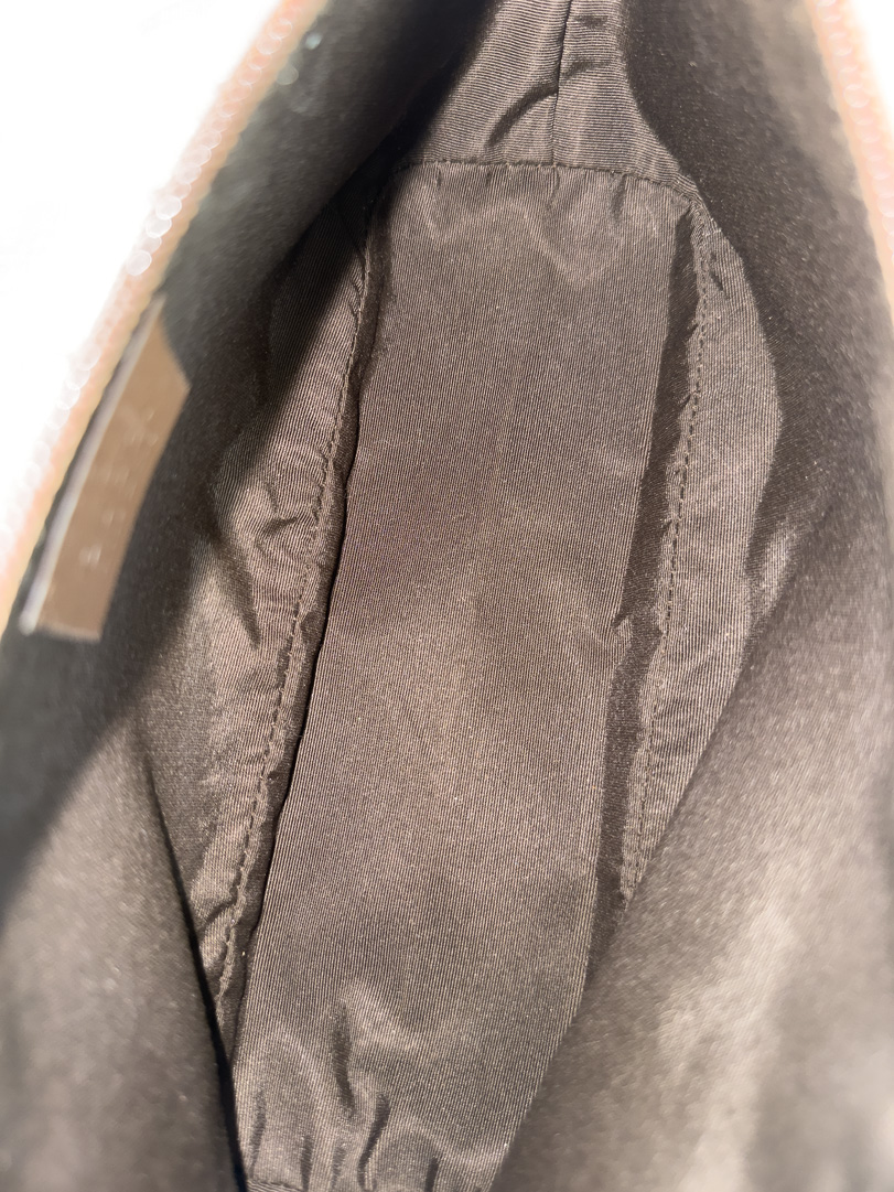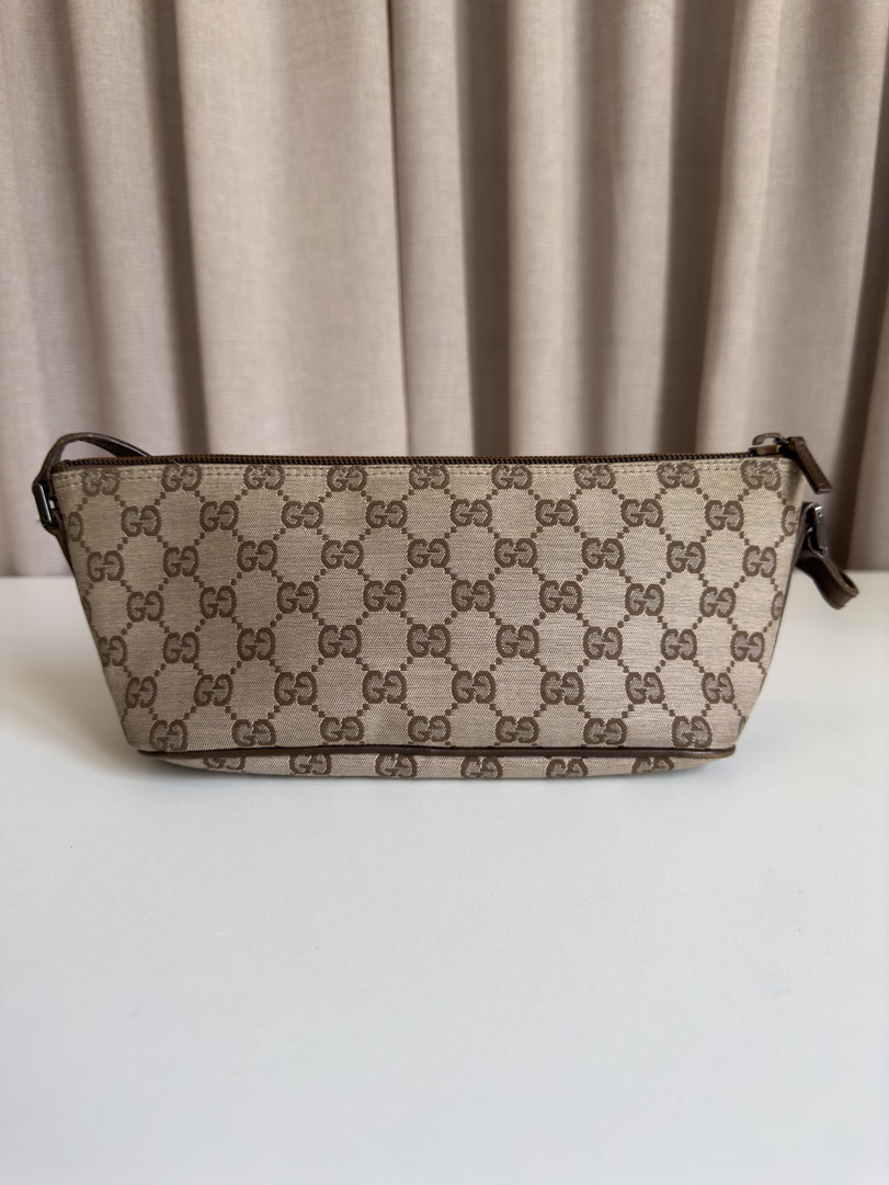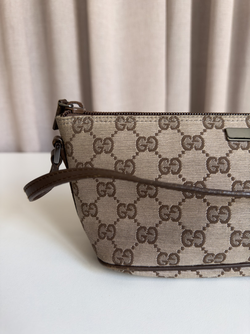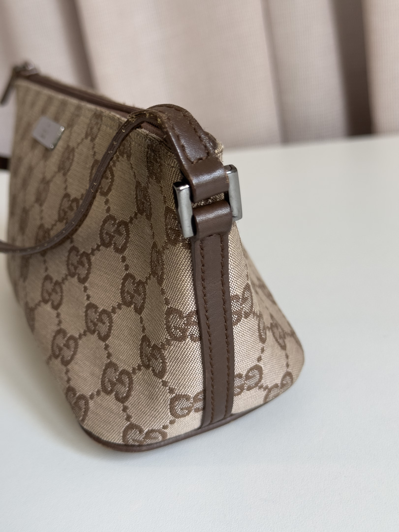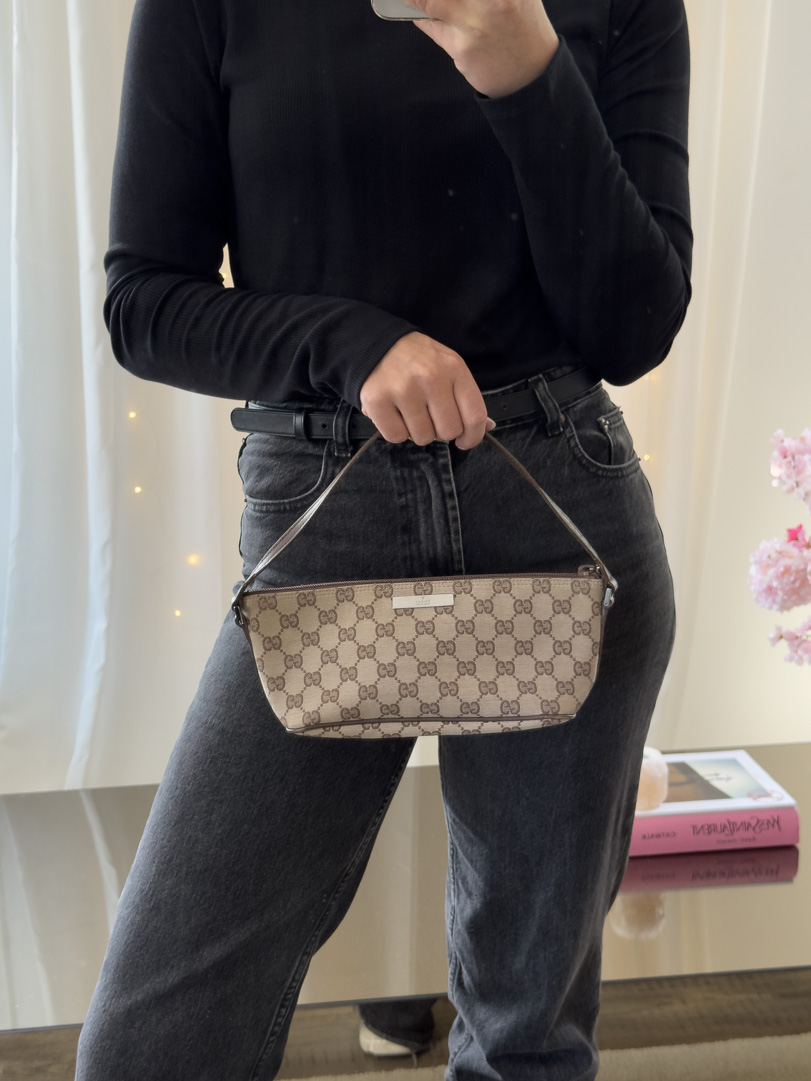 This vintage Gucci Boat Bag is a compact handbag crafted from brown GG canvas with brown leather and silver-tone hardware. It is in very good condition, with some wear on the corners and leather. The hardware still shines nicely, the interior is clean, and the zipper works smoothly. Please note: due to the short handles, it may not fit over the shoulder. The serial number is 3911032123. Dimensions: 27 x 10 x 8 cm.