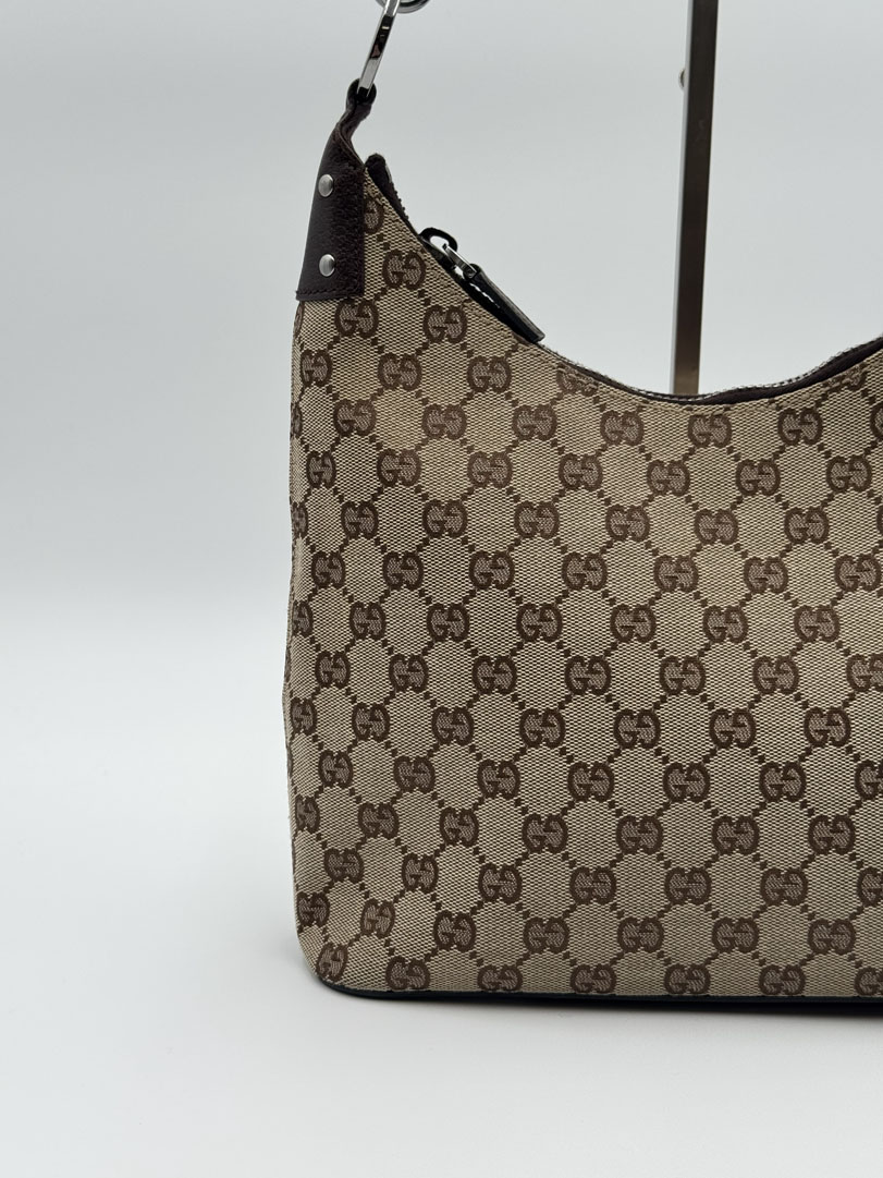 This vintage Gucci Canvas Lock Bag is a shoulder bag crafted from brown GG Canvas with silver-tone hardware. It is in very good condition, showing little to no imperfections. The hardware retains its shine, the zipper works smoothly, and the interior is clean with an extra pocket. Dimensions: 28 x 20 x 10 cm. The serial number is 11500302026.