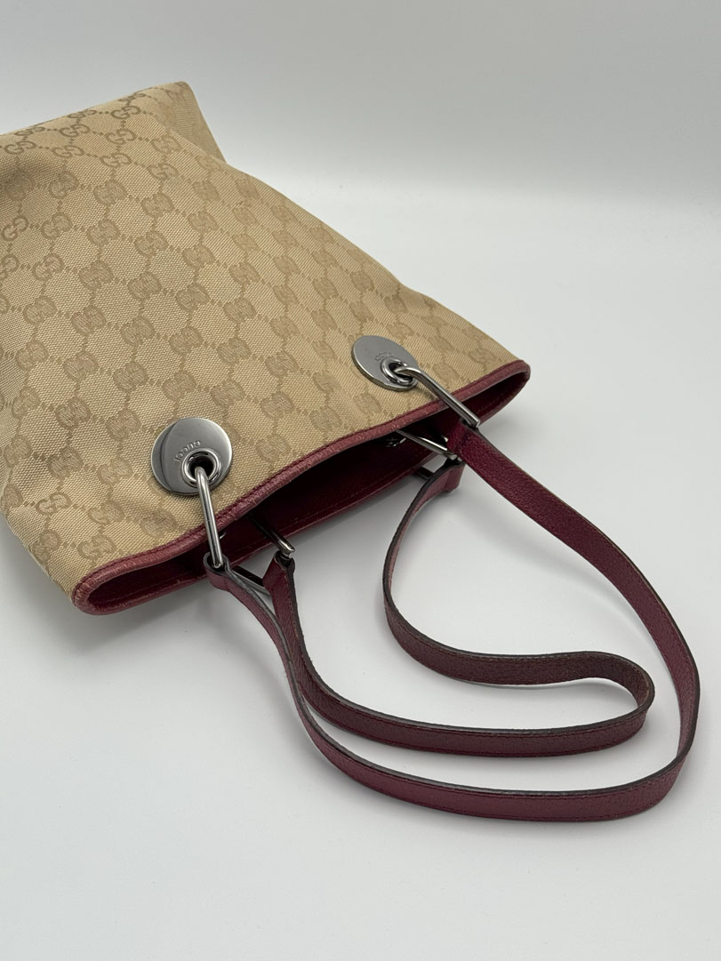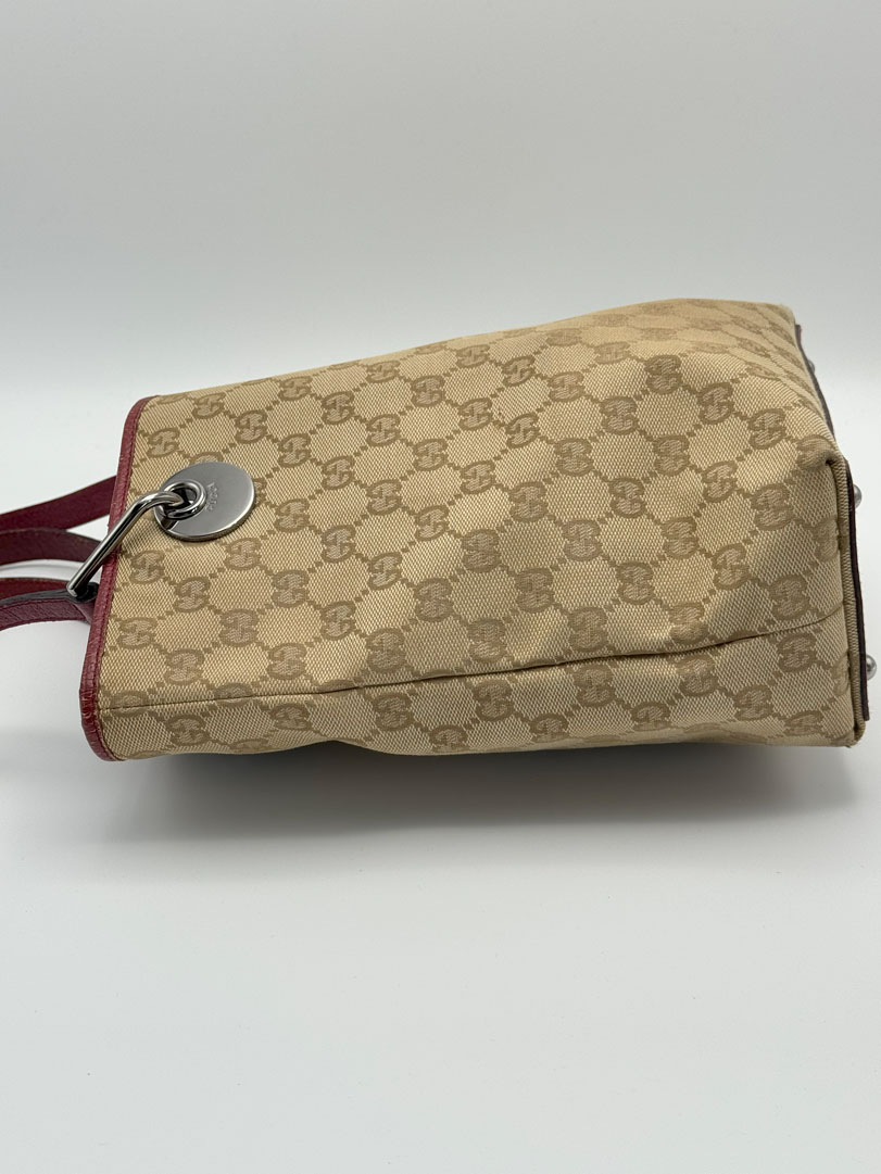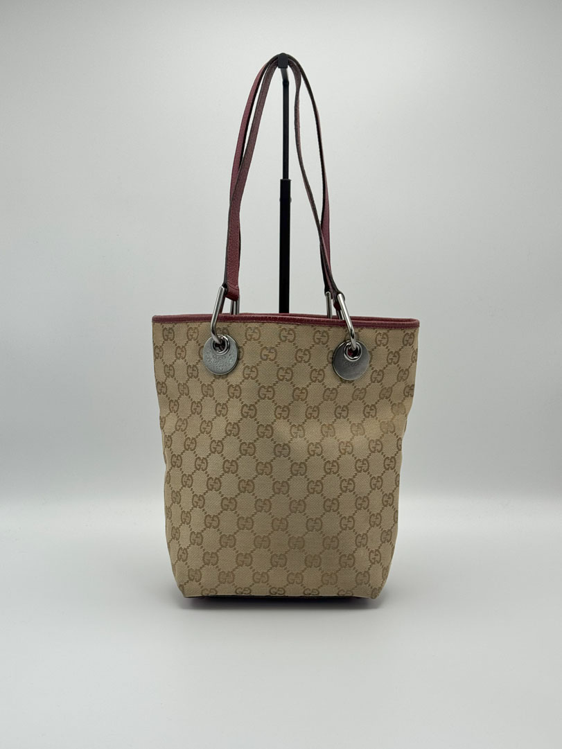 This vintage Gucci Canvas Mini Tote is a compact shoulder bag made from brown GG canvas with dark pink leather and silver-tone hardware. It’s in very good condition, with light wear on the corners and leather. The interior is clean and features a small zipped pocket for added practicality. A stylish and easy-to-carry piece. Serial number: 1208403444. Dimensions: 17 x 25 x 9 cm.