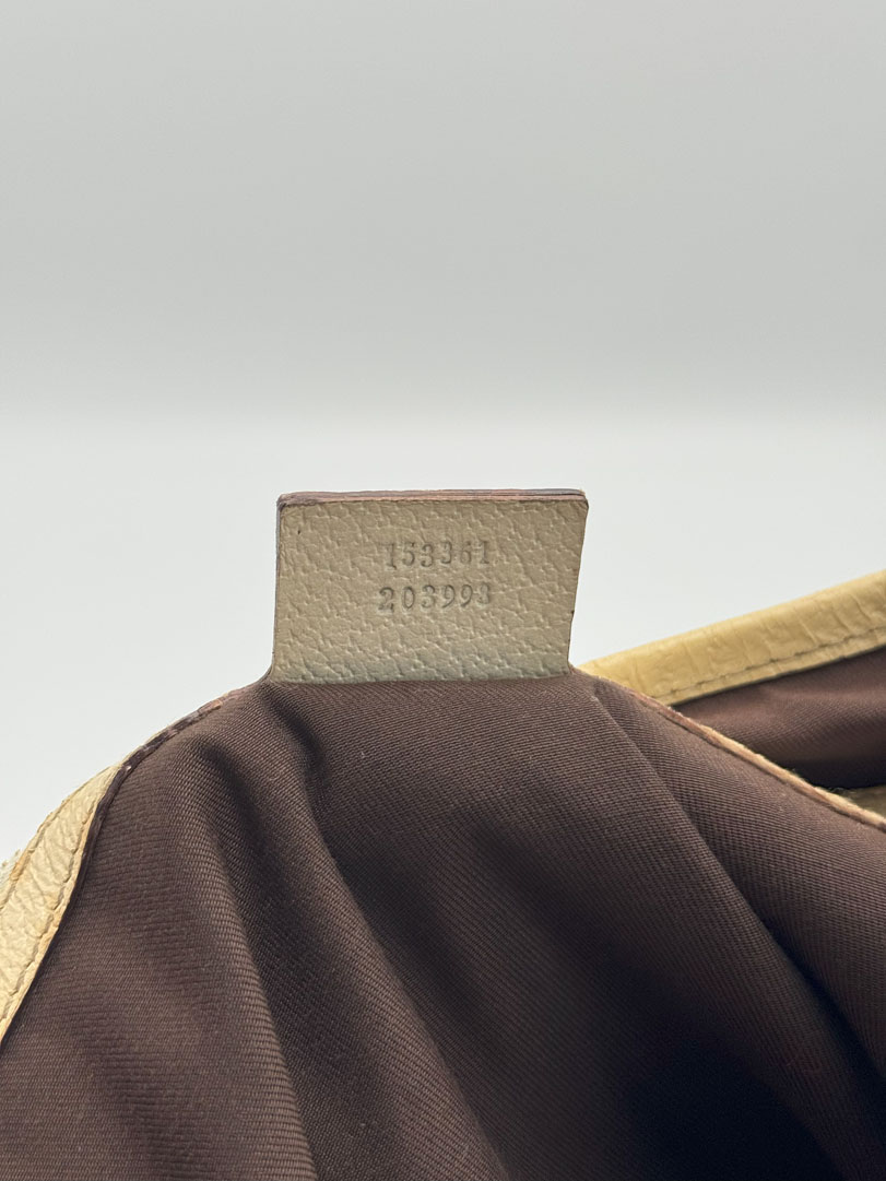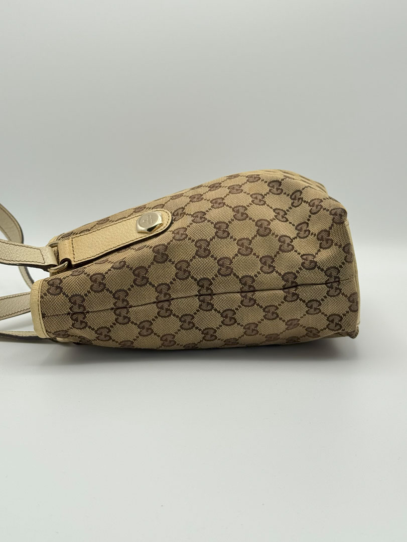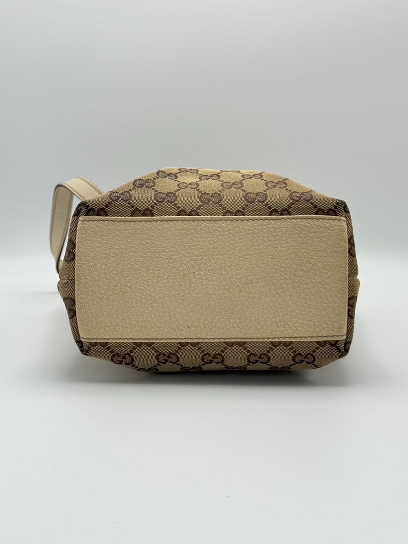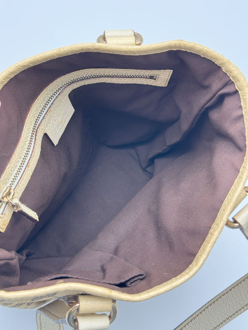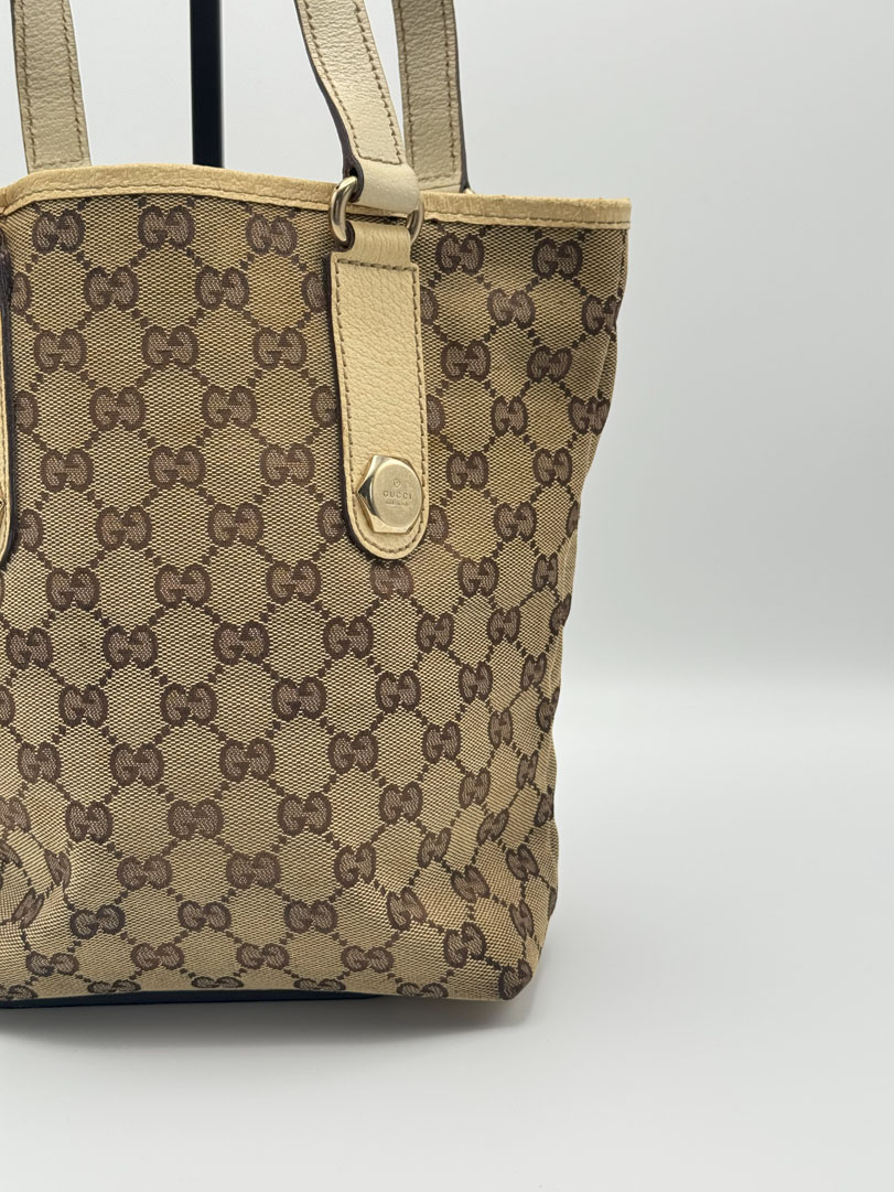 This vintage Gucci Canvas Mini Tote is a charming small tote made from light brown GG canvas with champagne-tone hardware. It is in very good condition, with some discoloration on the leather but overall still in beautiful shape. The canvas is strong and damage-free, and the interior is clean with an additional zippered pocket. The serial number is 153361203998. Dimensions: 24 x 17 x 10 cm.