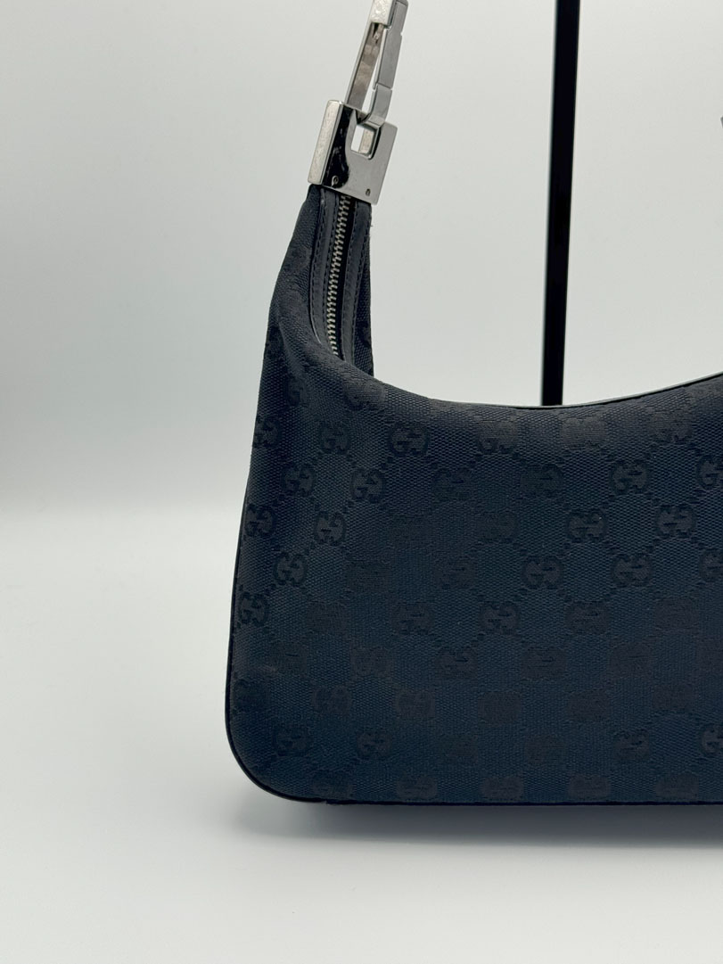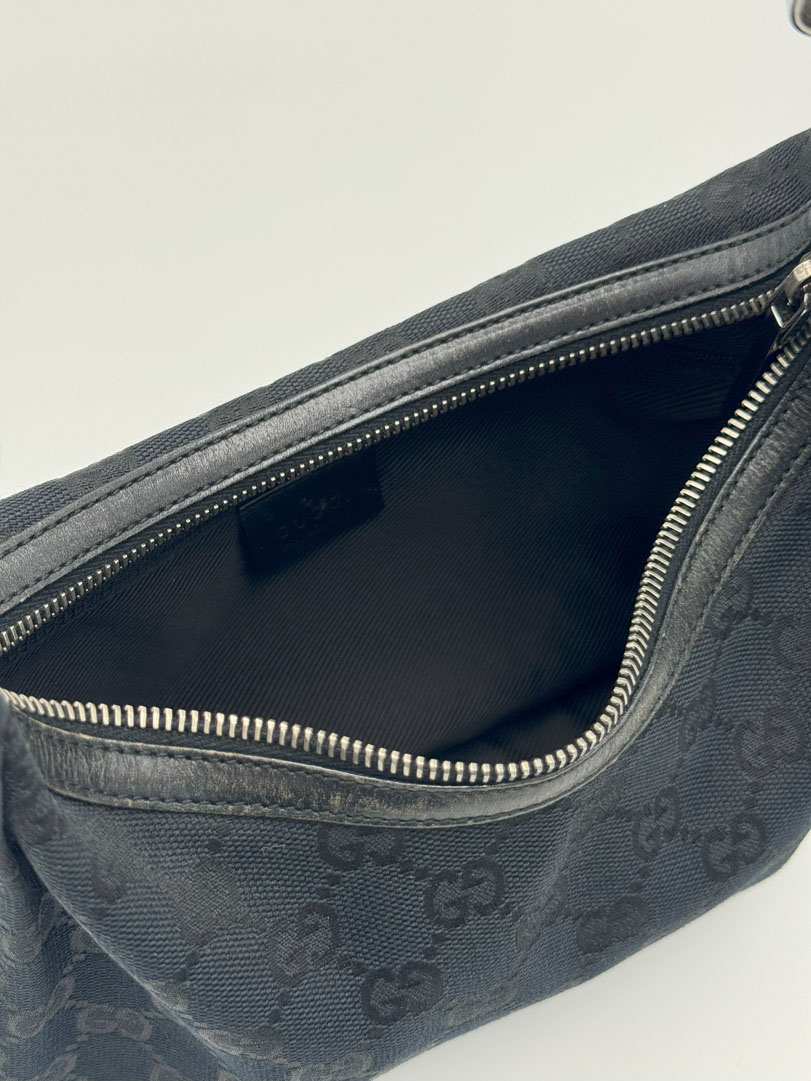 This vintage Gucci Canvas Shoulder Bag is a shoulder bag crafted from black GG canvas with leather details and silver-tone hardware. It is in very good condition with light imperfections; the zipper works well. The interior is clean with an extra zippered pocket. Dimensions: 26 x 16 x 5 cm. The serial number is 13812002122.