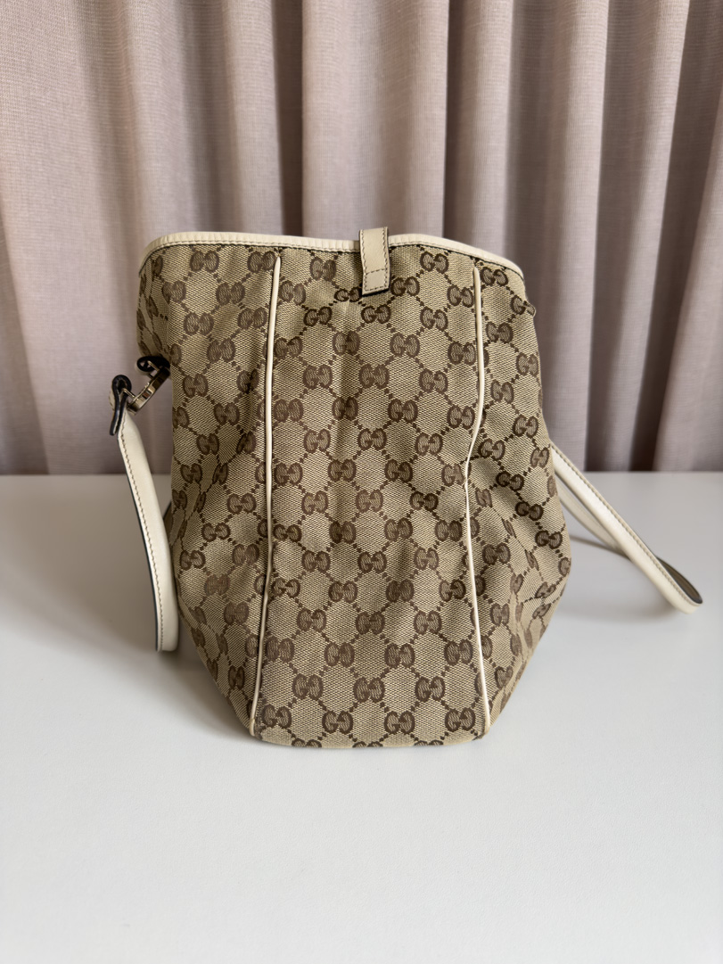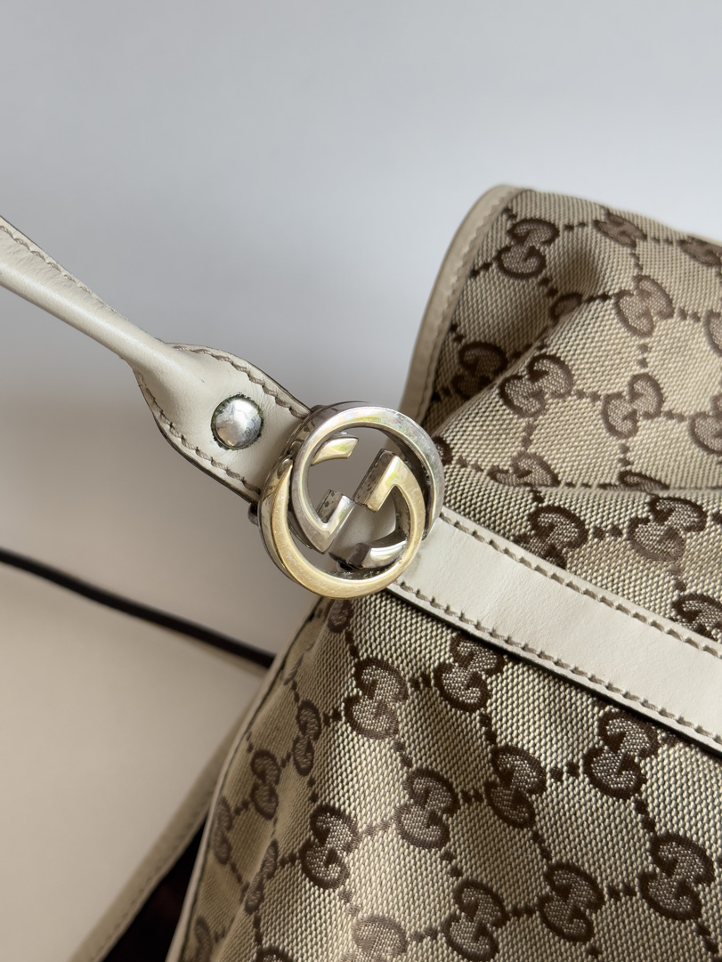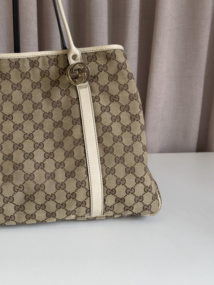 This pre-loved Gucci Canvas Tote is a vintage shoulder bag made from light brown GG canvas with white leather and a mix of silver and gold-tone hardware. It is in very good condition, with some corner wear. A large and practical tote, ideal for work or daily use. The serial number is 232956002122. Dimensions: 44 x 26 x 12 cm.