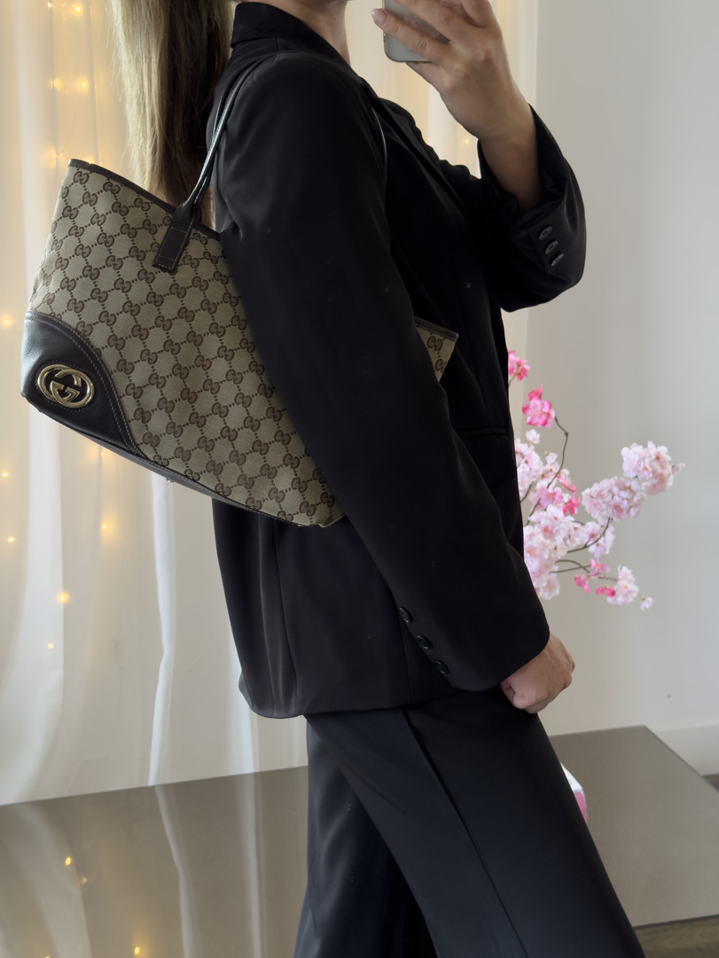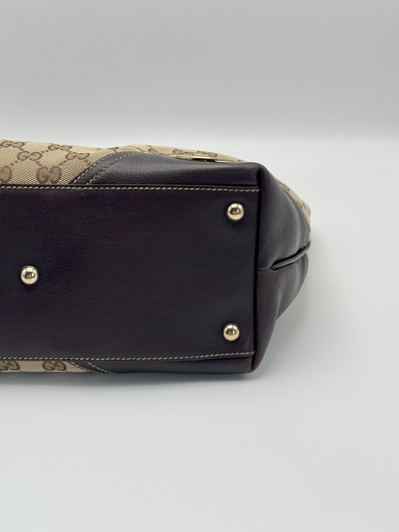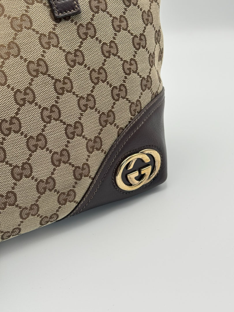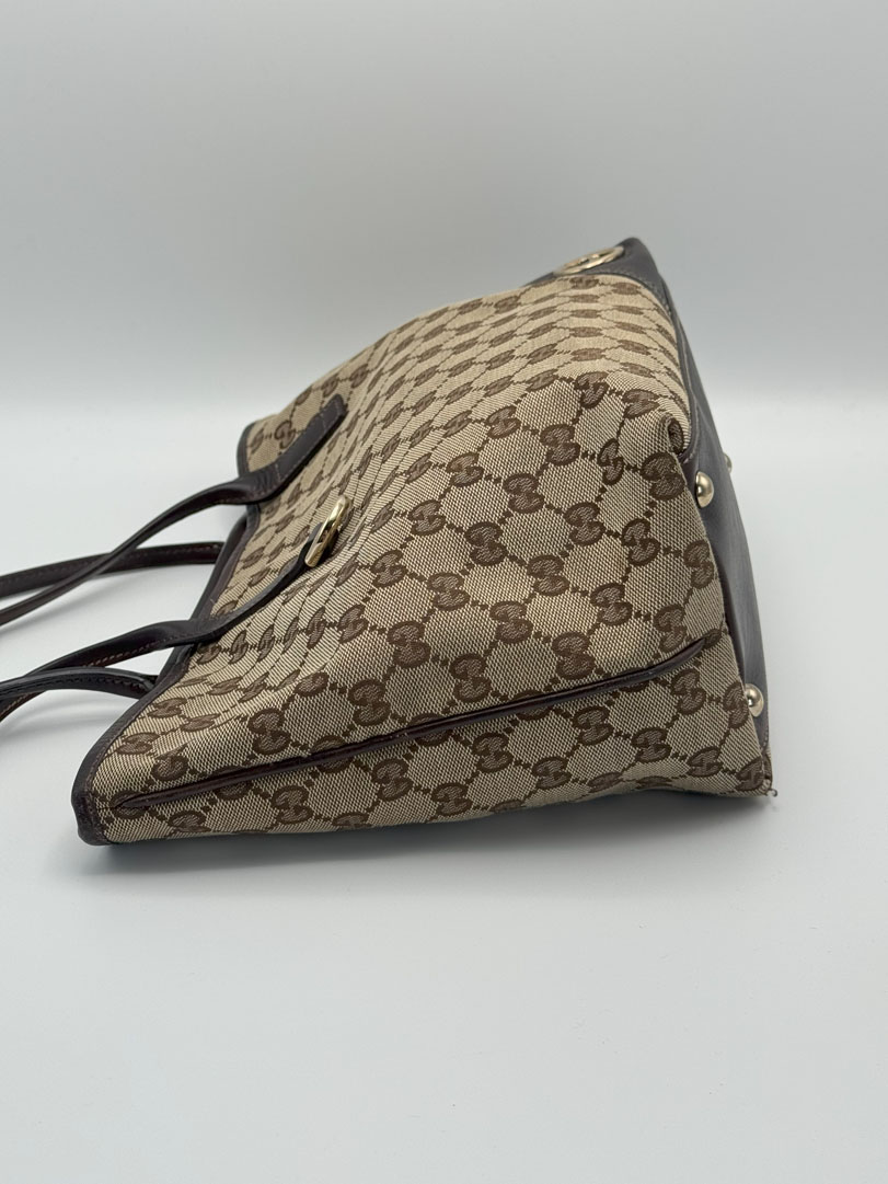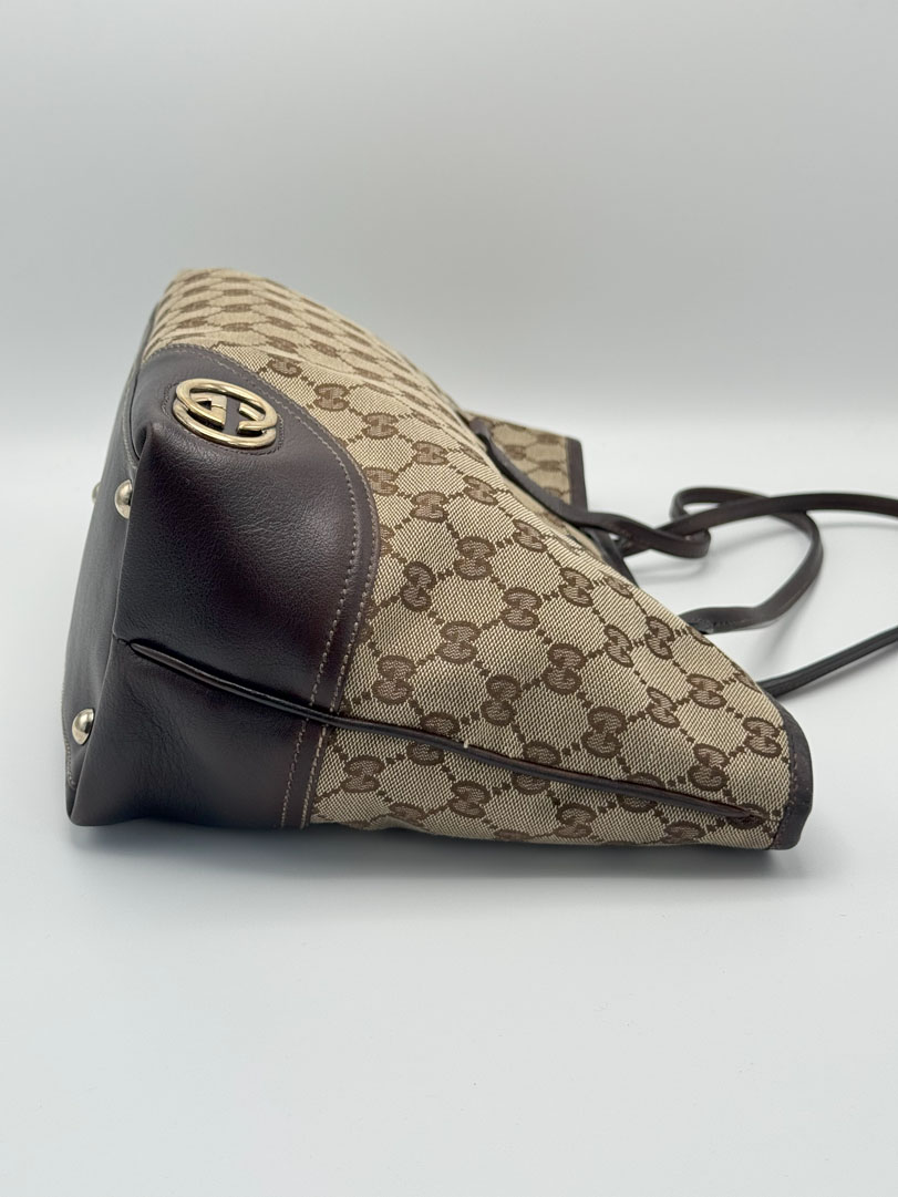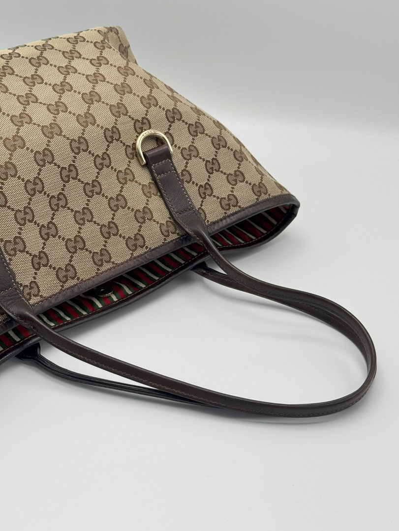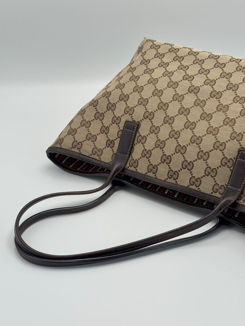 This vintage Gucci Canvas Tote is a small tote bag crafted from light brown GG canvas with dark brown leather and champagne-tone hardware. It is in excellent condition, with little to no signs of use and only minimal imperfections on the leather. The interior is spotless and features a zippered pocket. Comes with a dustbag. The serial number is 169946493075. Dimensions: 28 x 23 x 11 cm.
