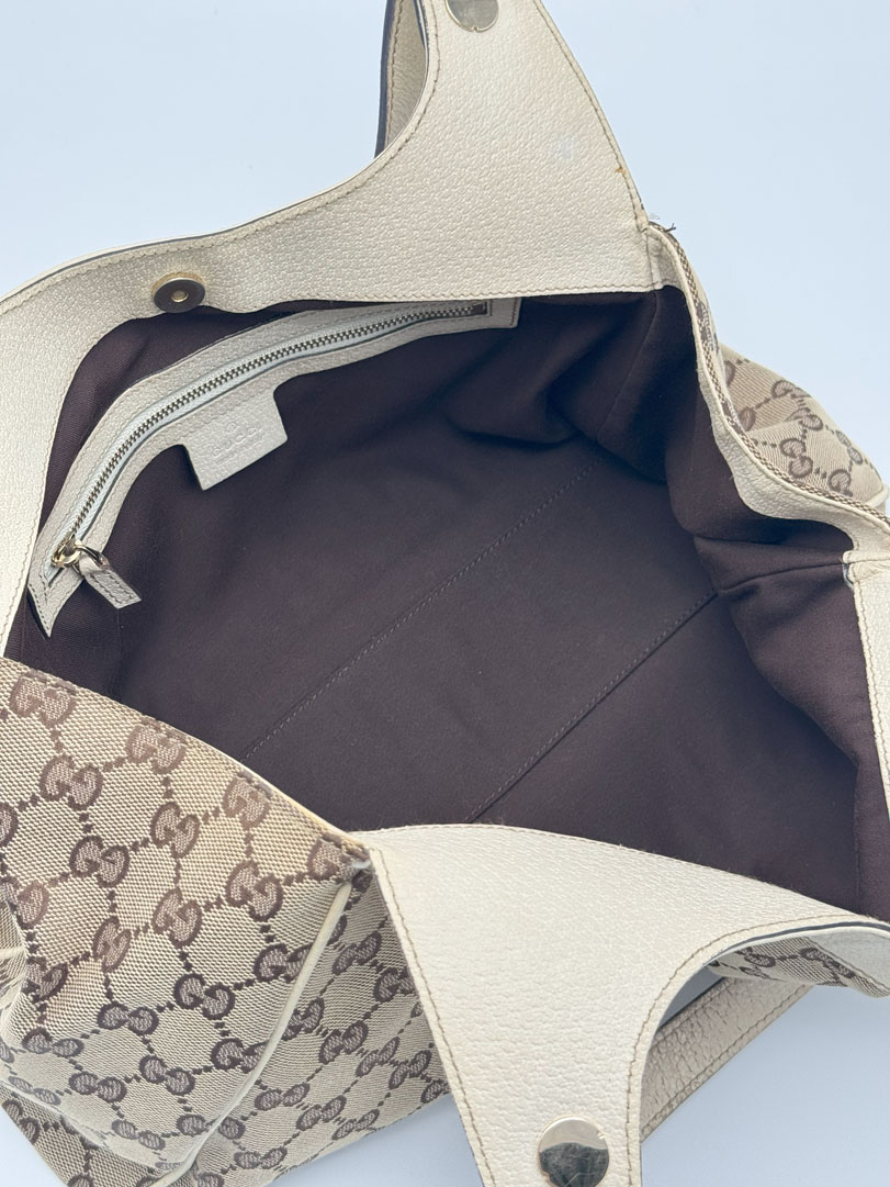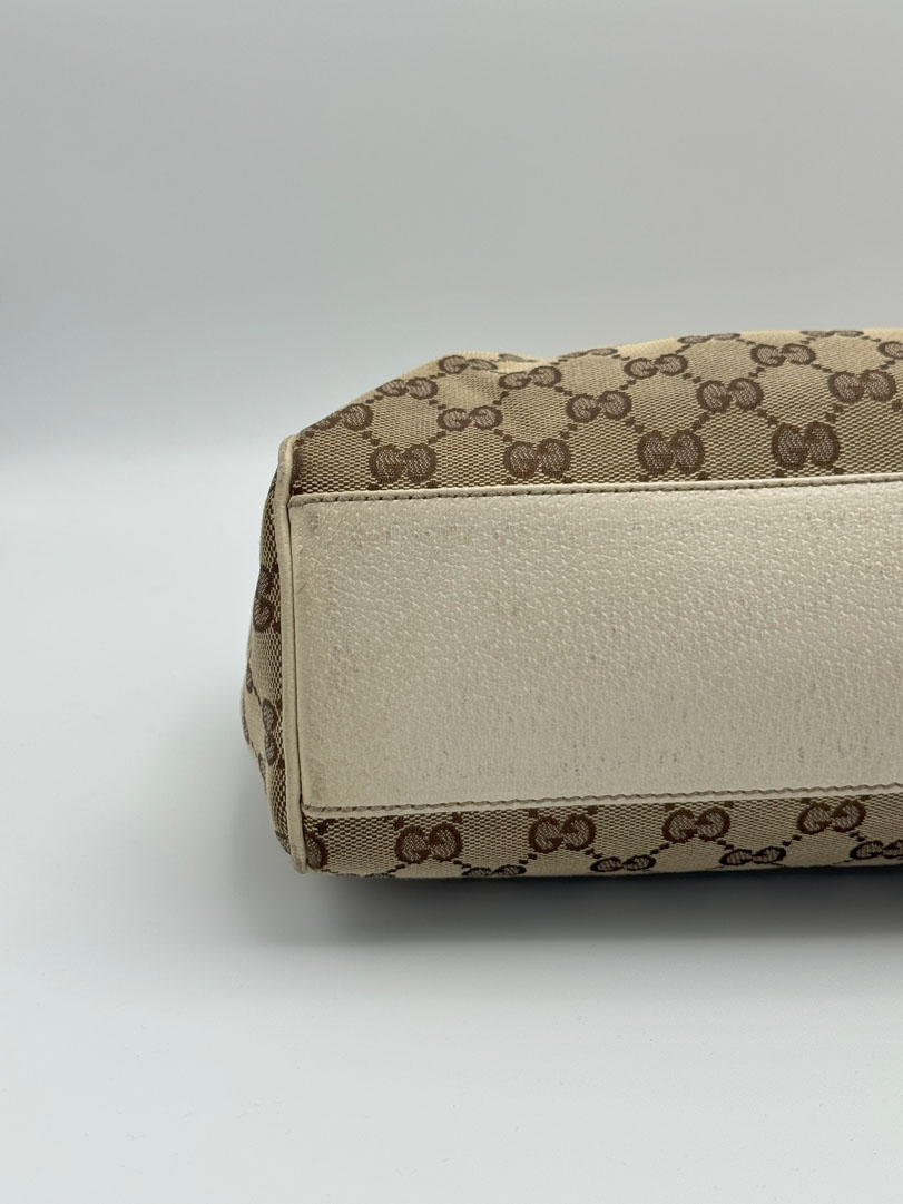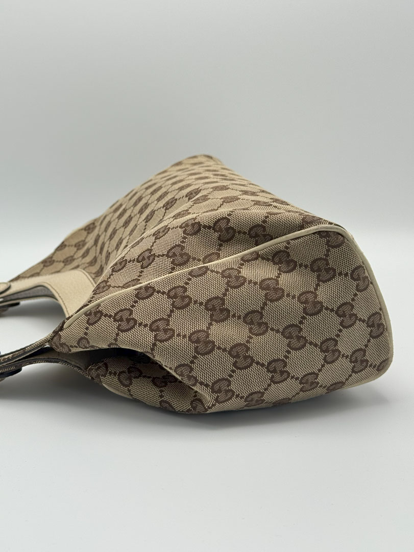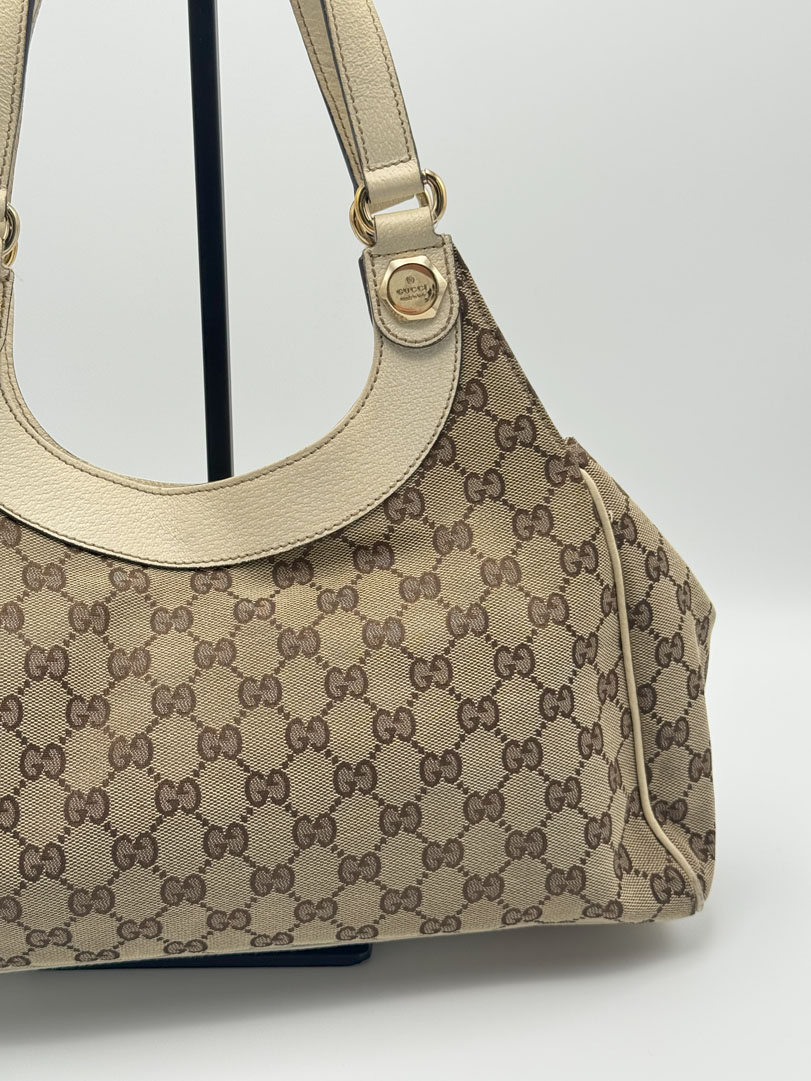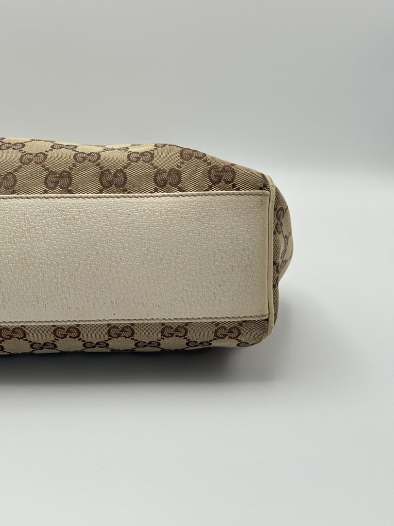 This vintage Gucci Charmy is a brown shoulder bag crafted from GG canvas with light leather and champagne-tone hardware. It is in very good condition, with wear on the corners but overall still in great shape. The bag closes with a magnetic snap, and the interior is clean with an additional zippered pocket. It comes with a dustbag. The serial number is 1549823444. Dimensions: 35 x 21 x 7 cm.