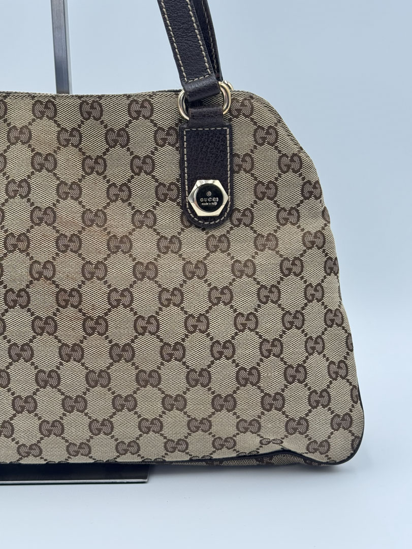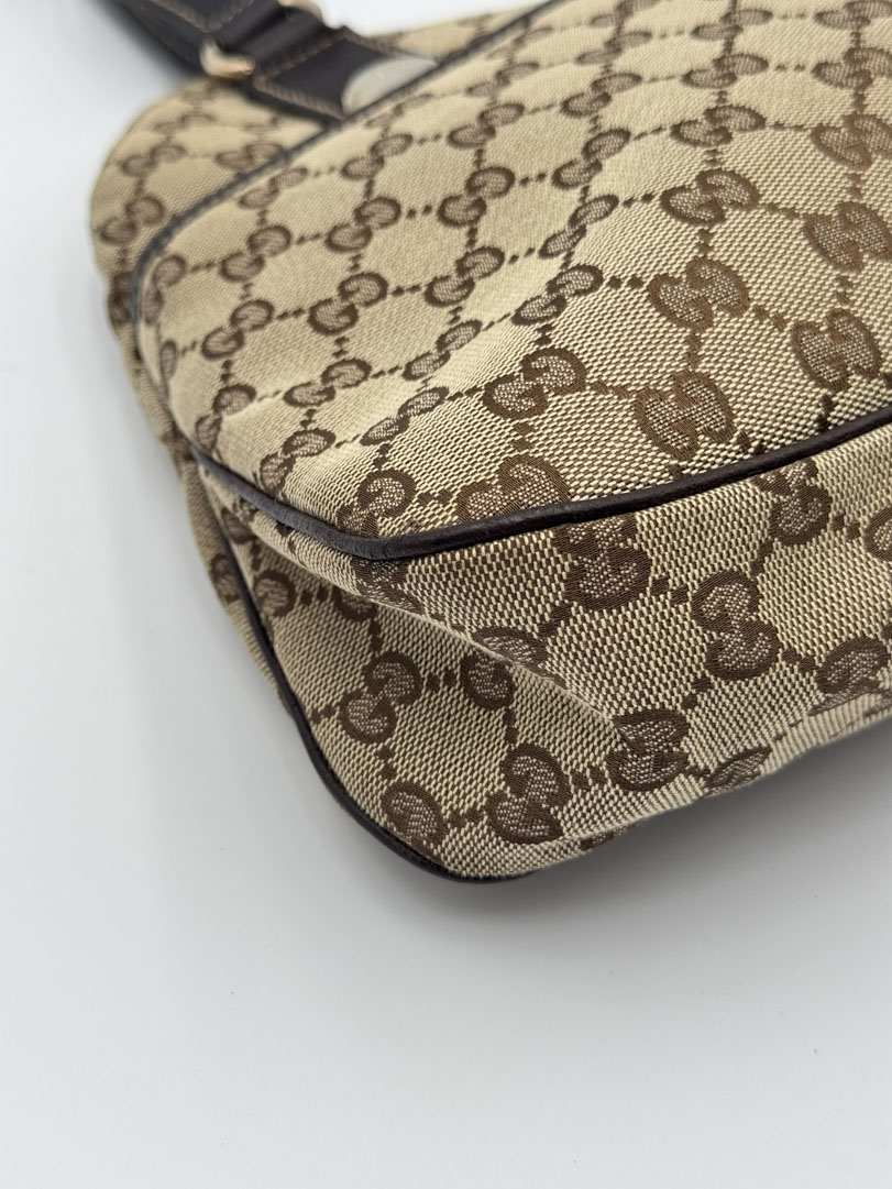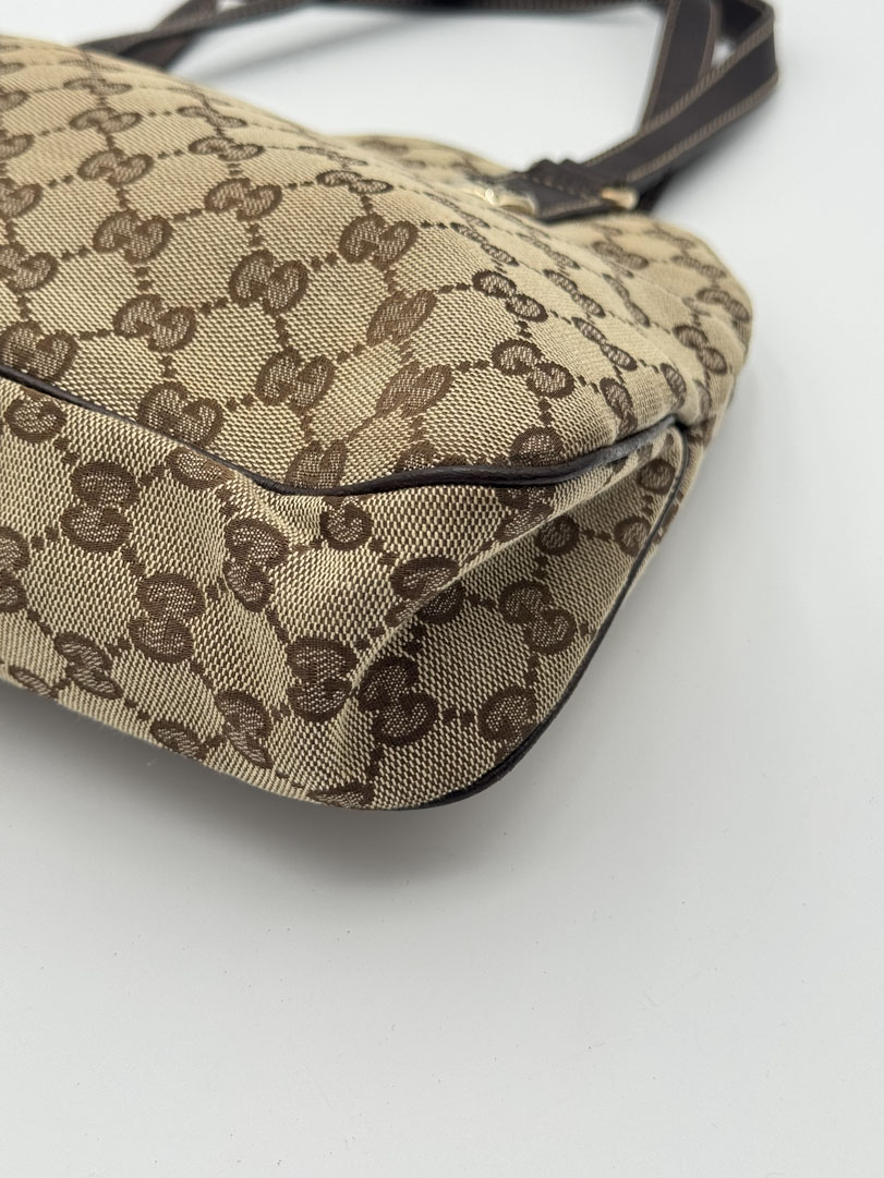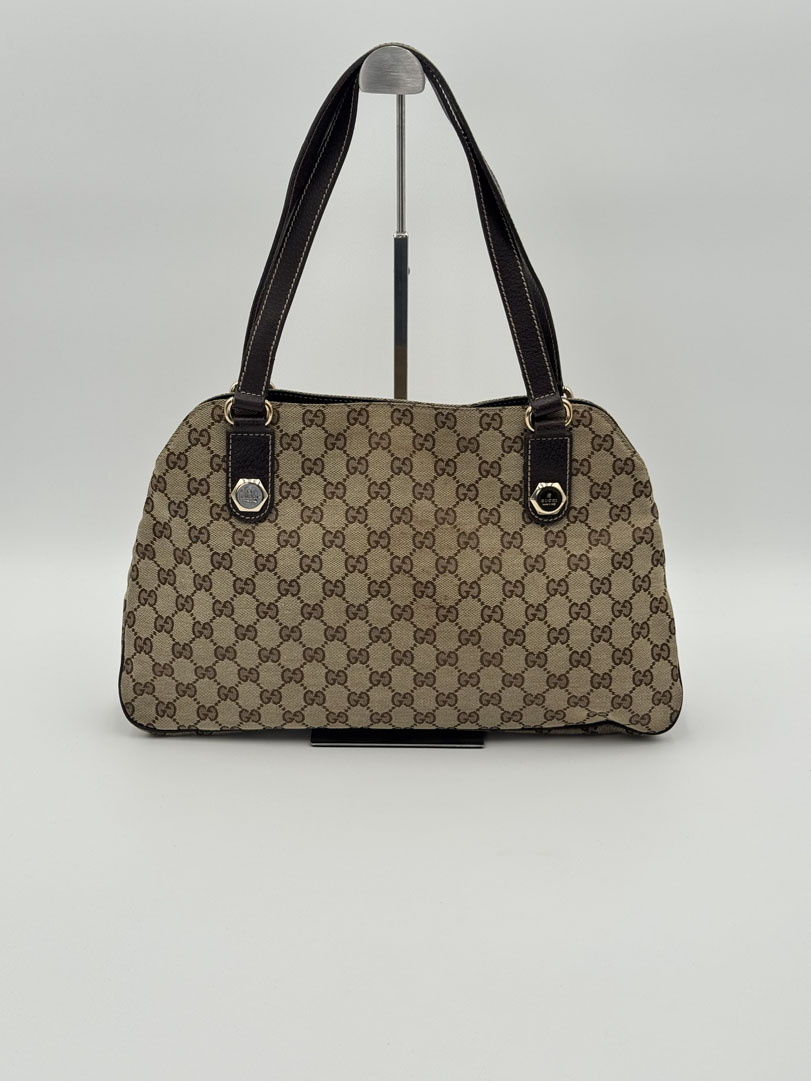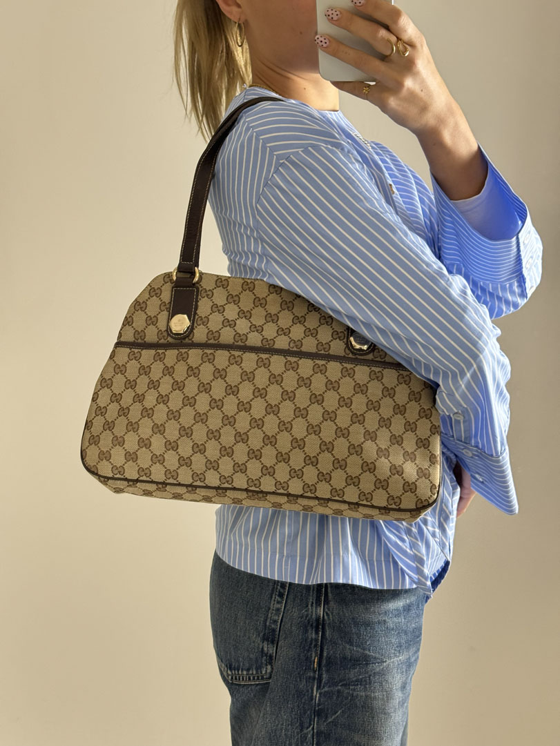 This vintage Gucci Charmy Shoulder Bag is a shoulder bag made from brown GG canvas with champagne-tone hardware. The item is in very good condition, showing some user signs such as wear on the corners. The interior is clean with an extra pocket. The bag fits comfortably over the shoulder. It comes with a dustbag. The serial number is 163288 3444, and the dimensions are 28 x 24 x 6 cm.