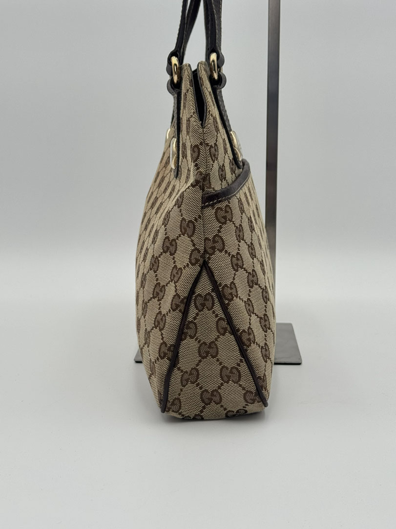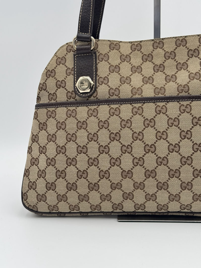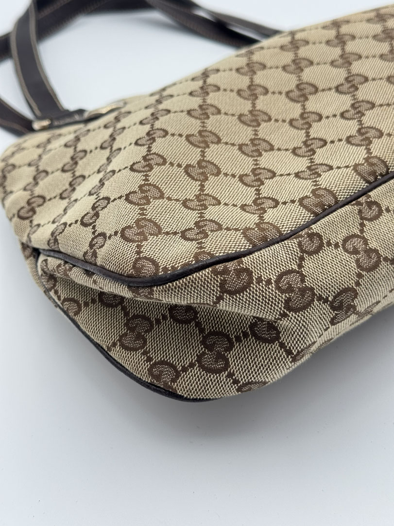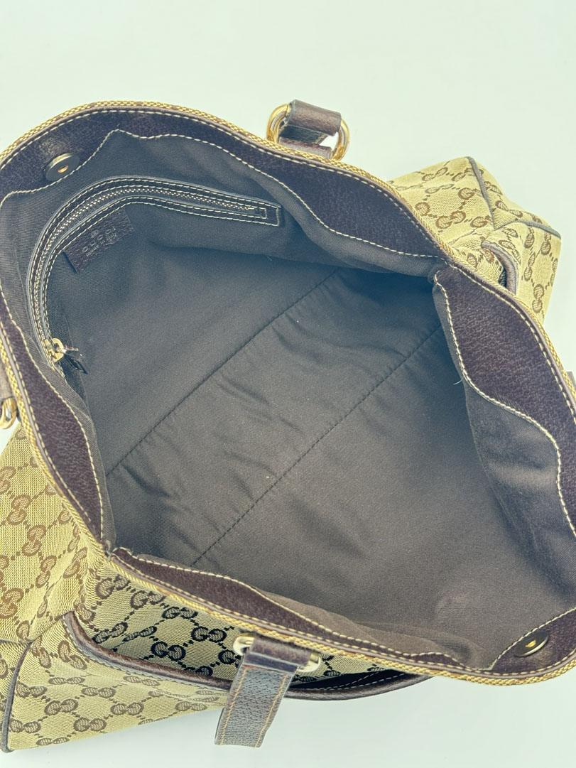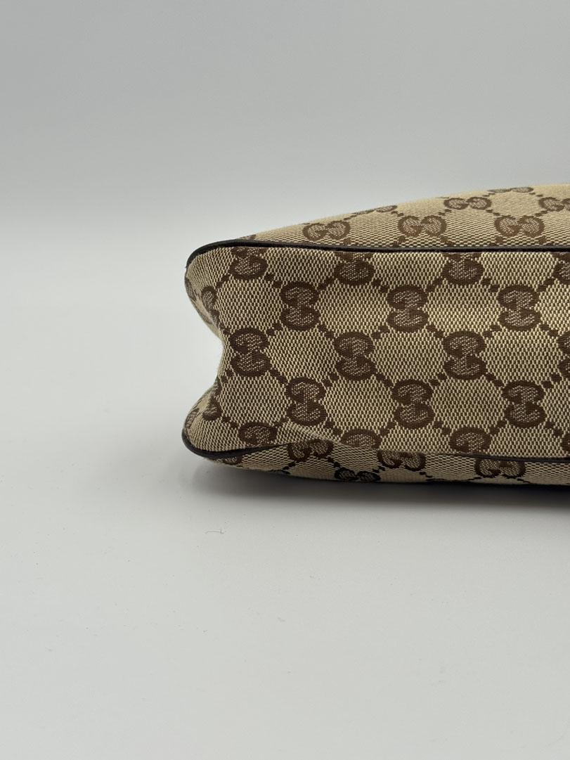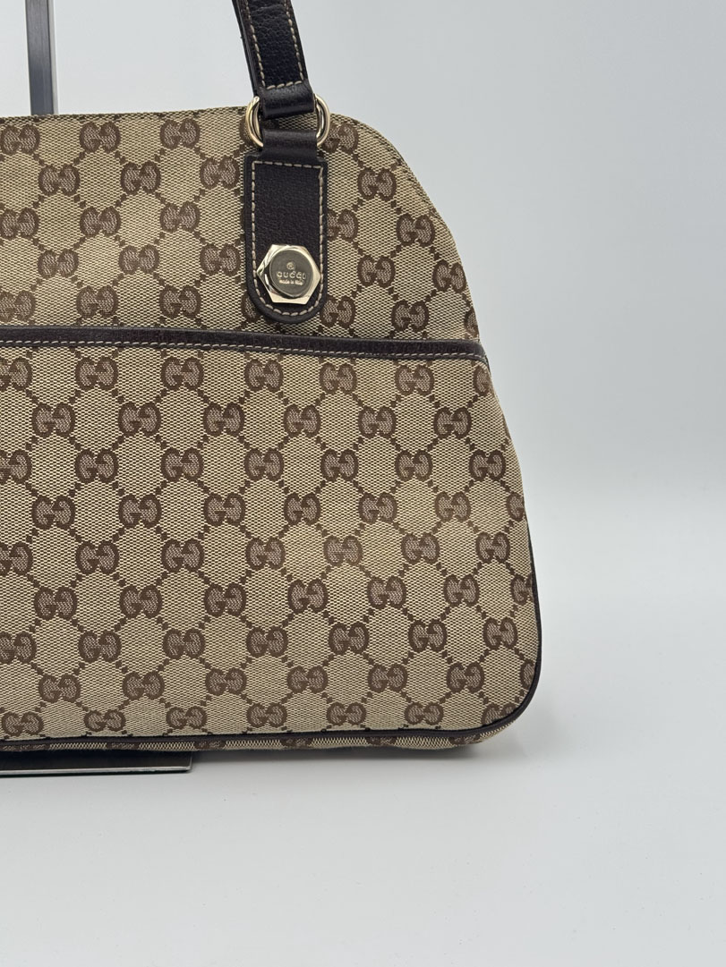 This vintage Gucci Charmy Shoulder Bag is a shoulder bag made from brown GG canvas with champagne-tone hardware. The item is in very good condition, showing some user signs such as wear on the corners. The interior is clean with an extra pocket. The bag fits comfortably over the shoulder. It comes with a dustbag. The serial number is 163288 3444, and the dimensions are 28 x 24 x 6 cm.