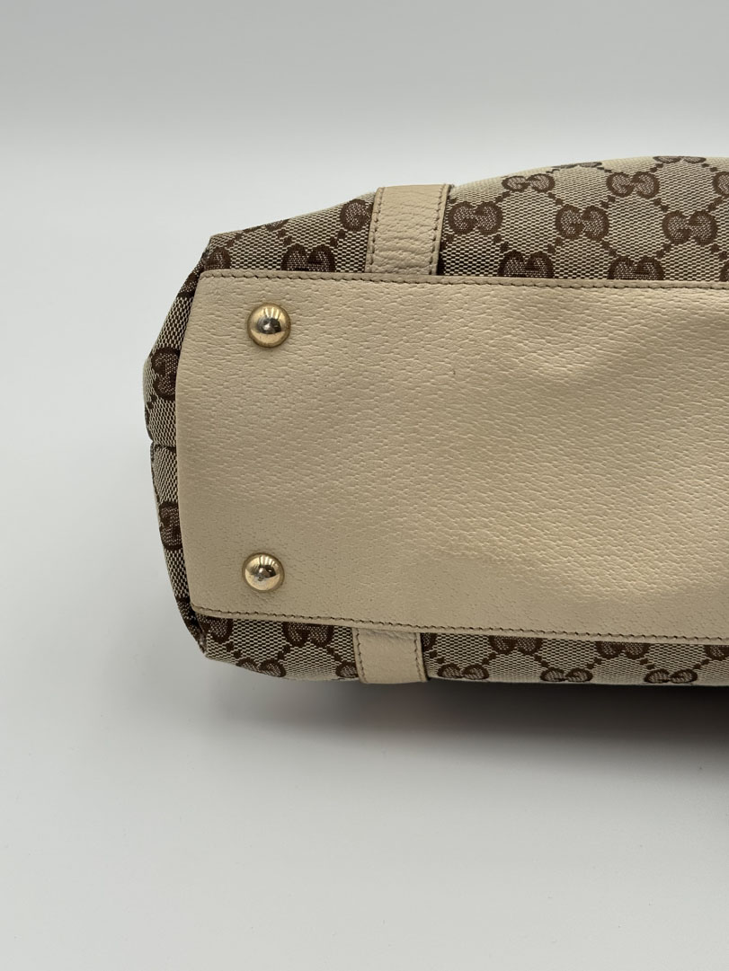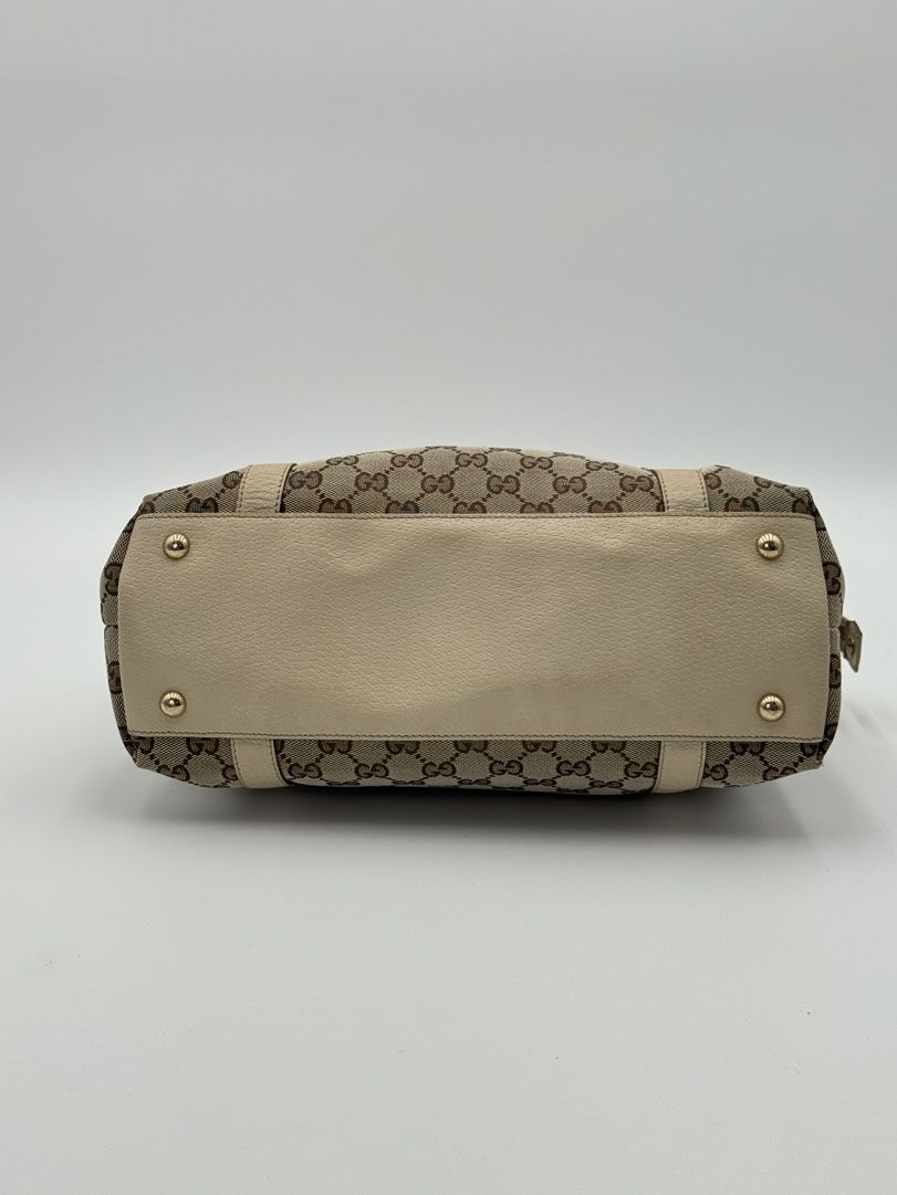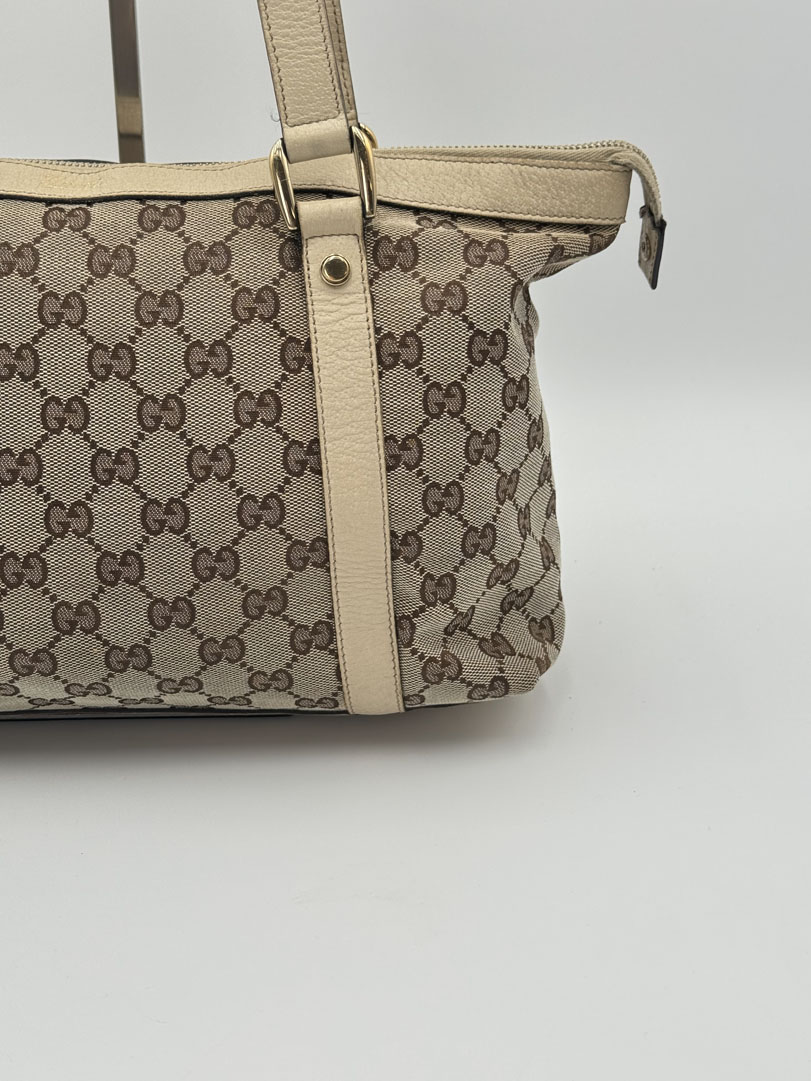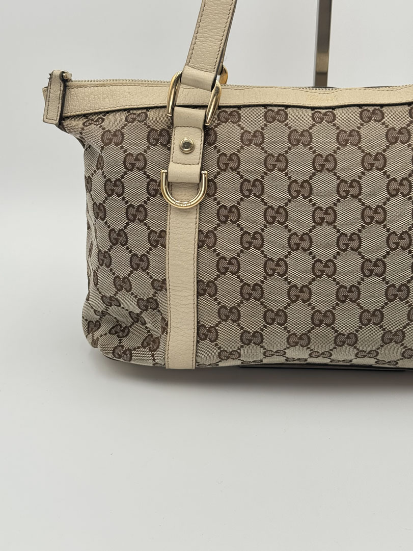 This vintage Gucci D-Ring Abbey Shoulder Bag is a shoulder bag made from white GG canvas with champagne-tone hardware. The item is in very good condition, showing some user signs such as discoloration of the white leather. The interior is clean and features an extra pocket, and the zipper functions properly. The serial number is 141470 204991, and the dimensions are 38 x 22 x 10 cm.
