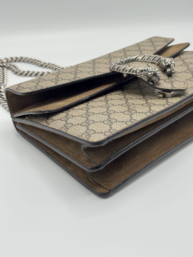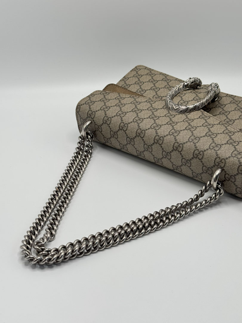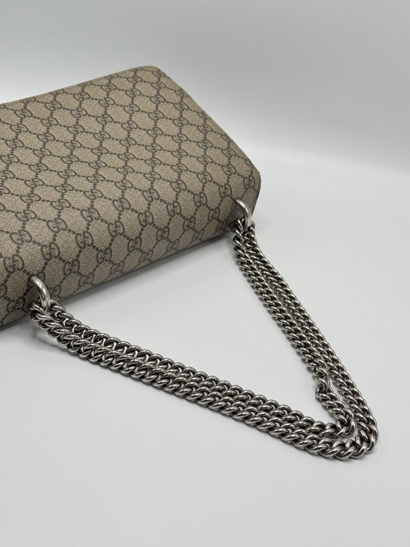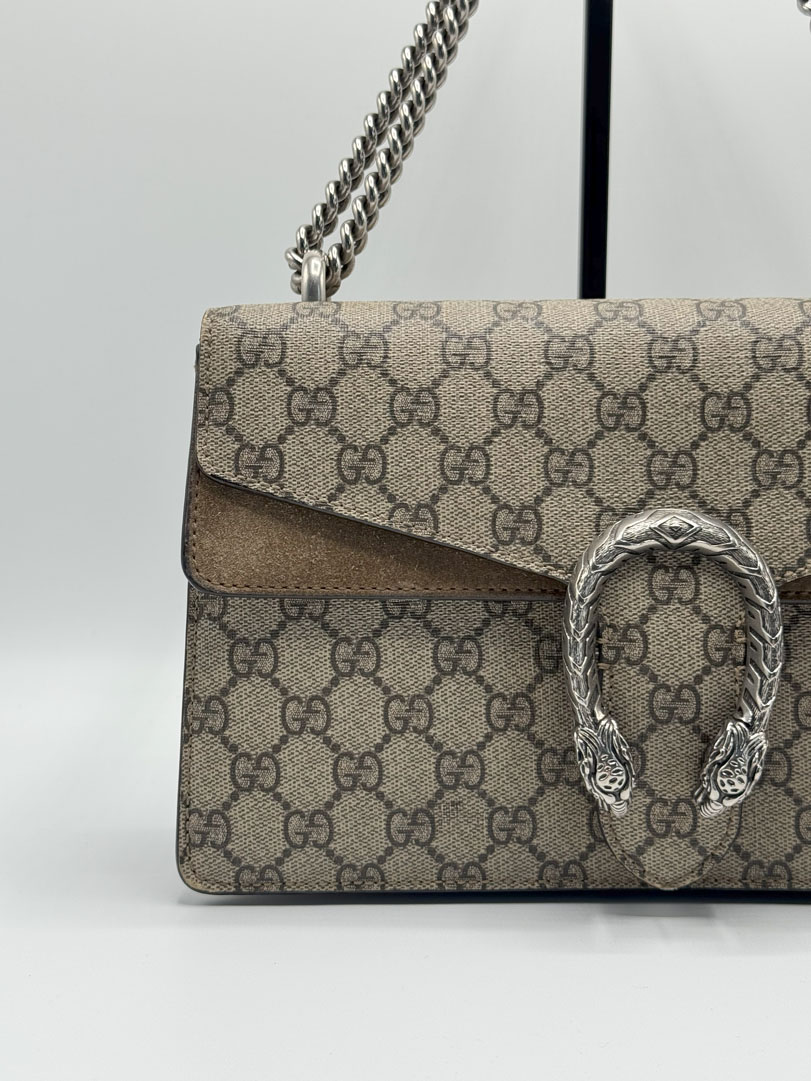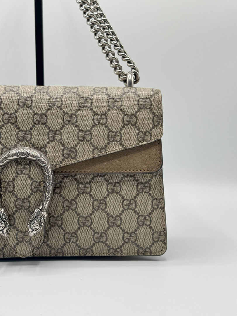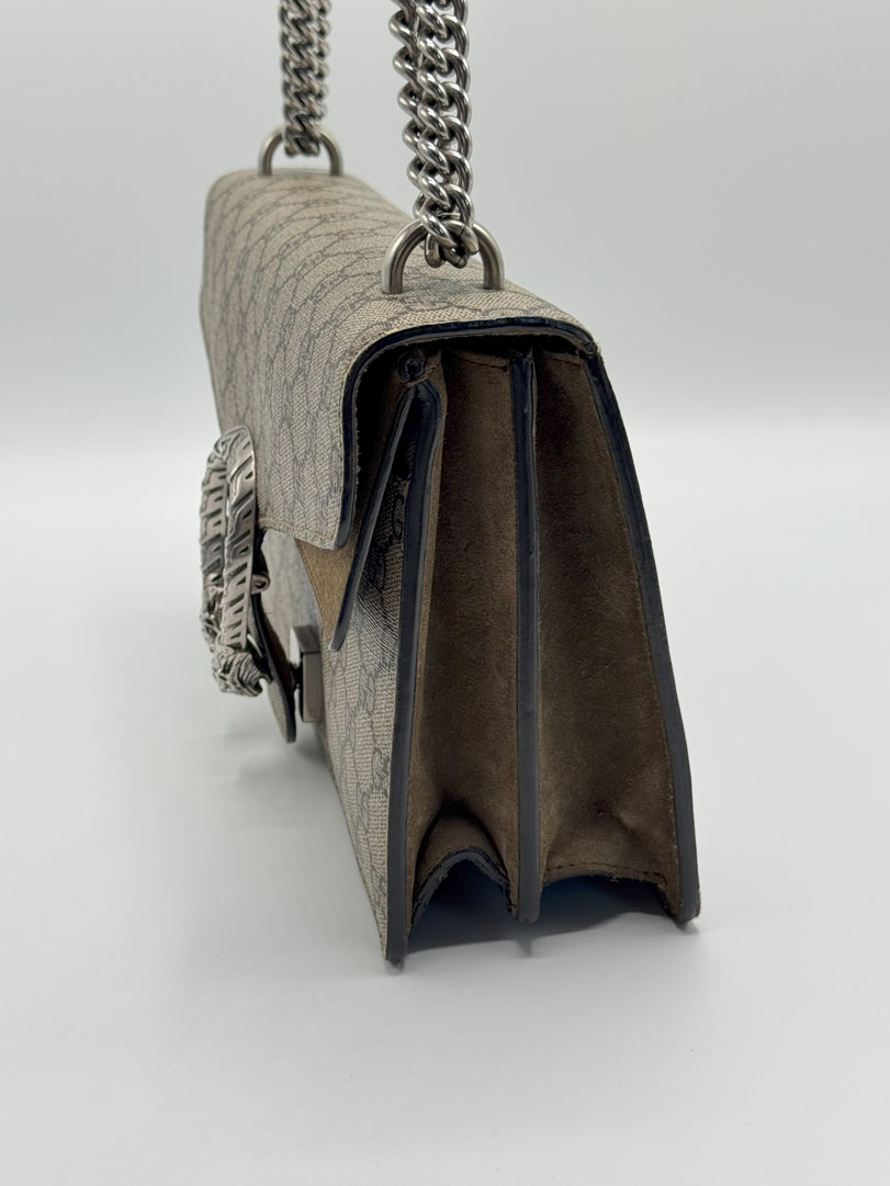 This preloved Gucci Dionysus Bag is a crossbody bag crafted from grey Supreme canvas with silver-tone hardware. It is in very good condition, clean with an additional pocket and showing few imperfections. Overall, it remains in a fantastic state. It comes with a dustbag, box, and receipt. The serial number is 400249520981. Made in 2017. Dimensions: 28 x 17 x 10 cm.
