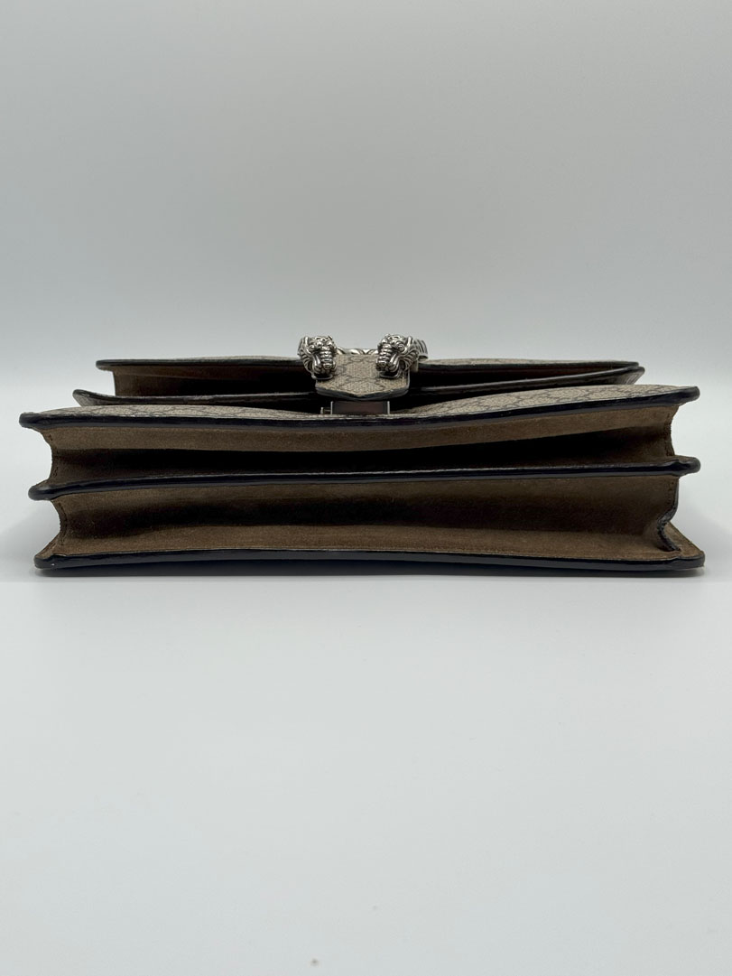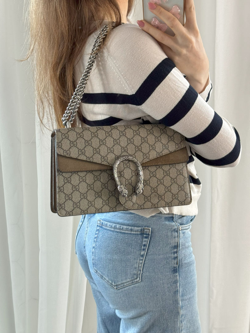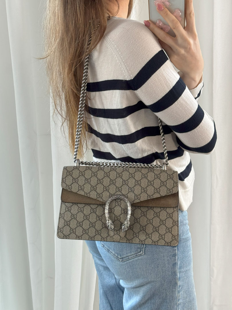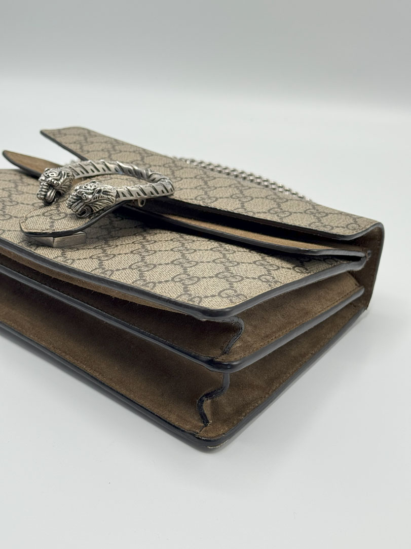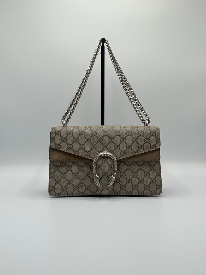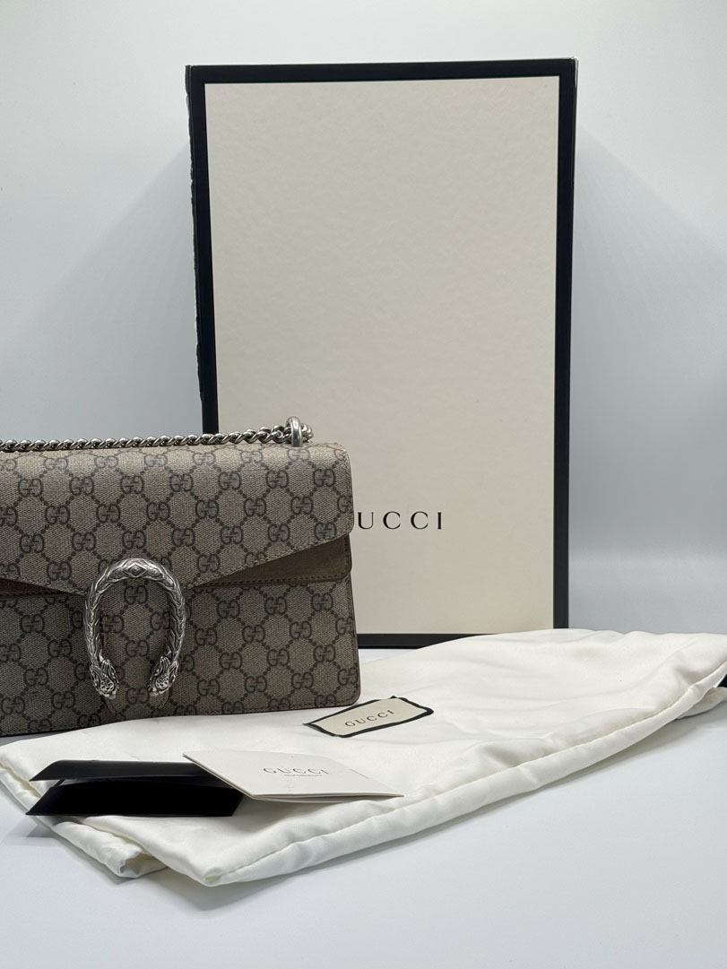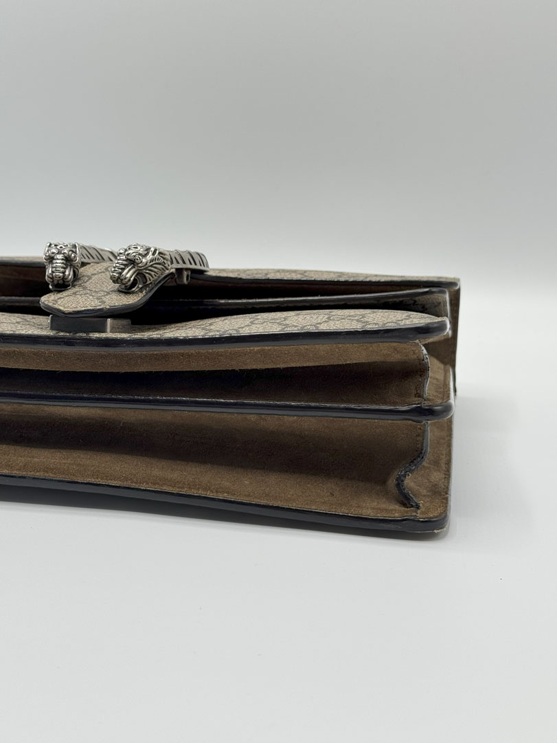 This preloved Gucci Dionysus Bag is a crossbody bag crafted from grey Supreme canvas with silver-tone hardware. It is in very good condition, clean with an additional pocket and showing few imperfections. Overall, it remains in a fantastic state. It comes with a dustbag, box, and receipt. The serial number is 400249520981. Made in 2017. Dimensions: 28 x 17 x 10 cm.