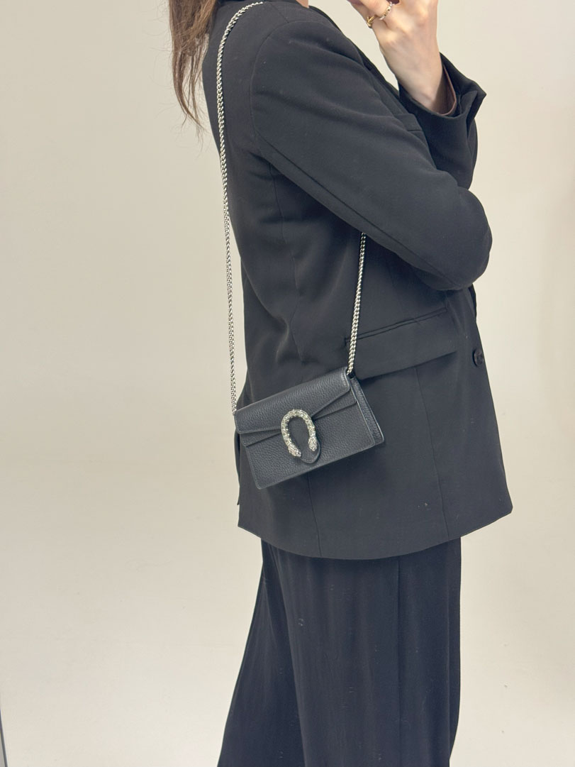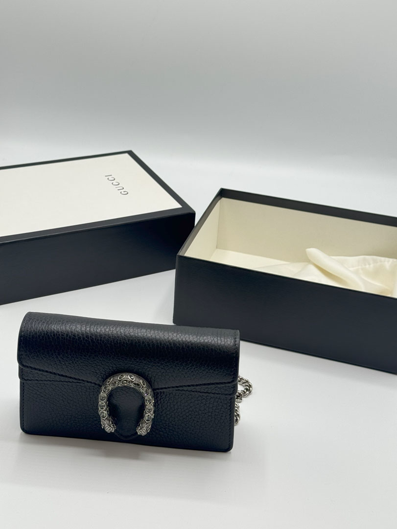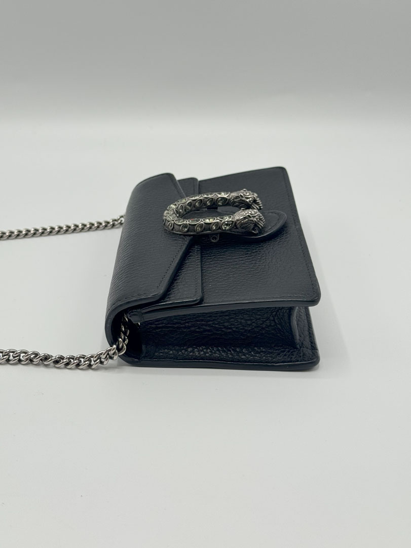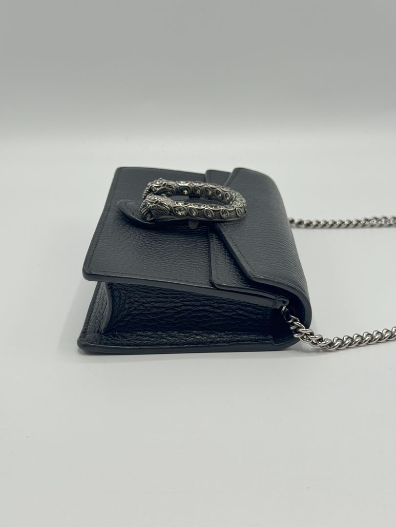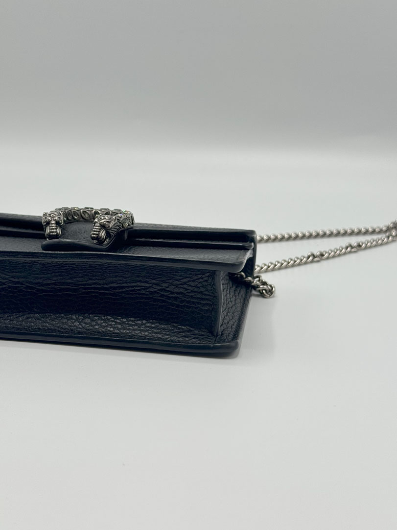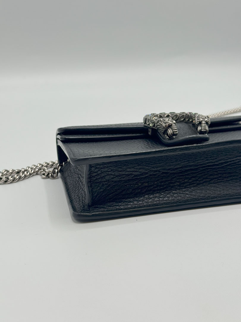This preloved Gucci Dionysus Mini Black is a crossbody bag crafted from black leather with silver-tone hardware. It is in excellent condition, with a clean interior showing a small stain. The bag is compact, likely too small for most phones, and comes with a dustbag and box. The serial number is 4764322184. Dimensions: 16.5 x 10 x 4 cm.