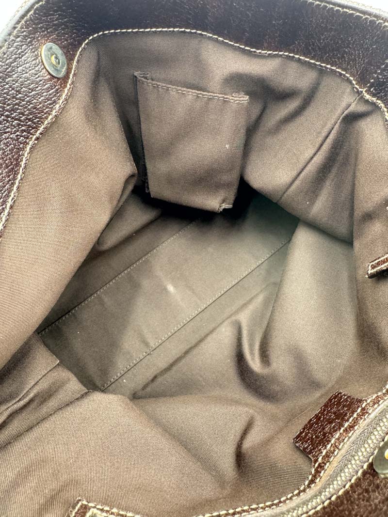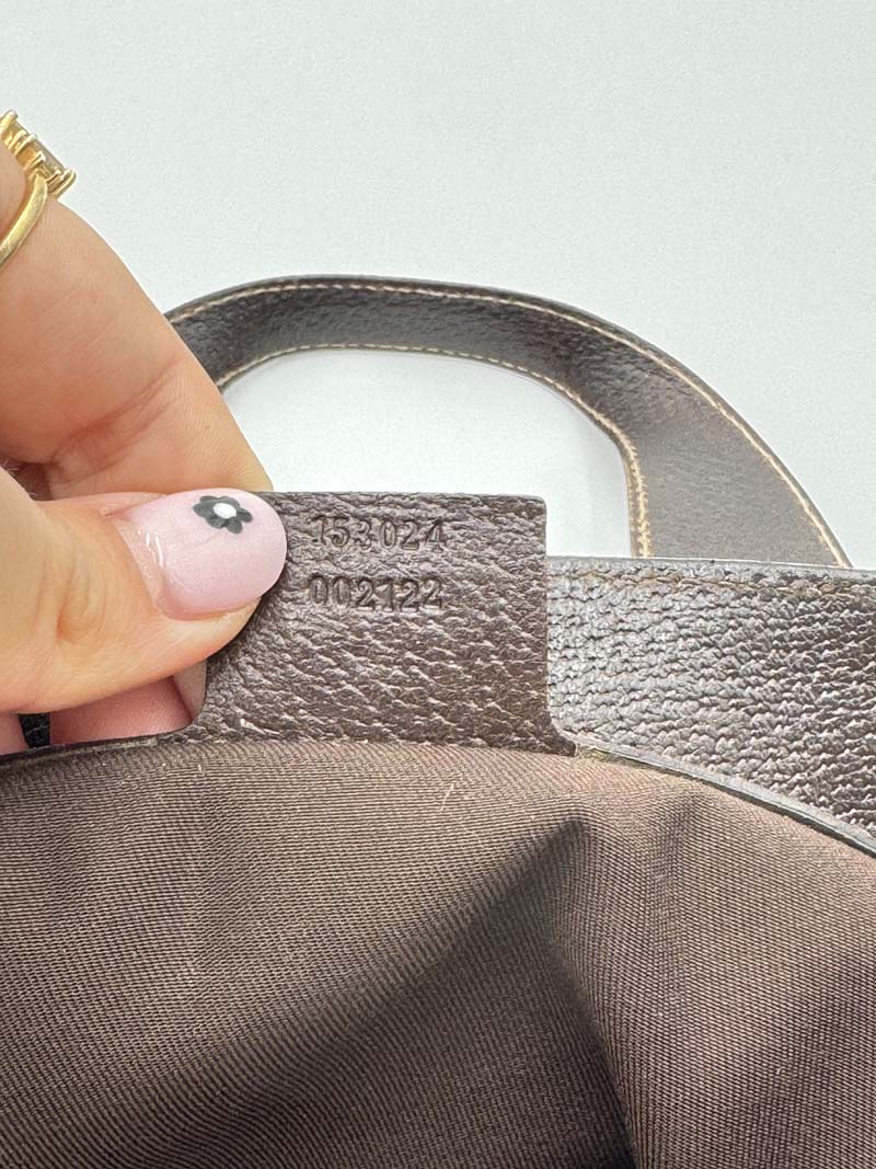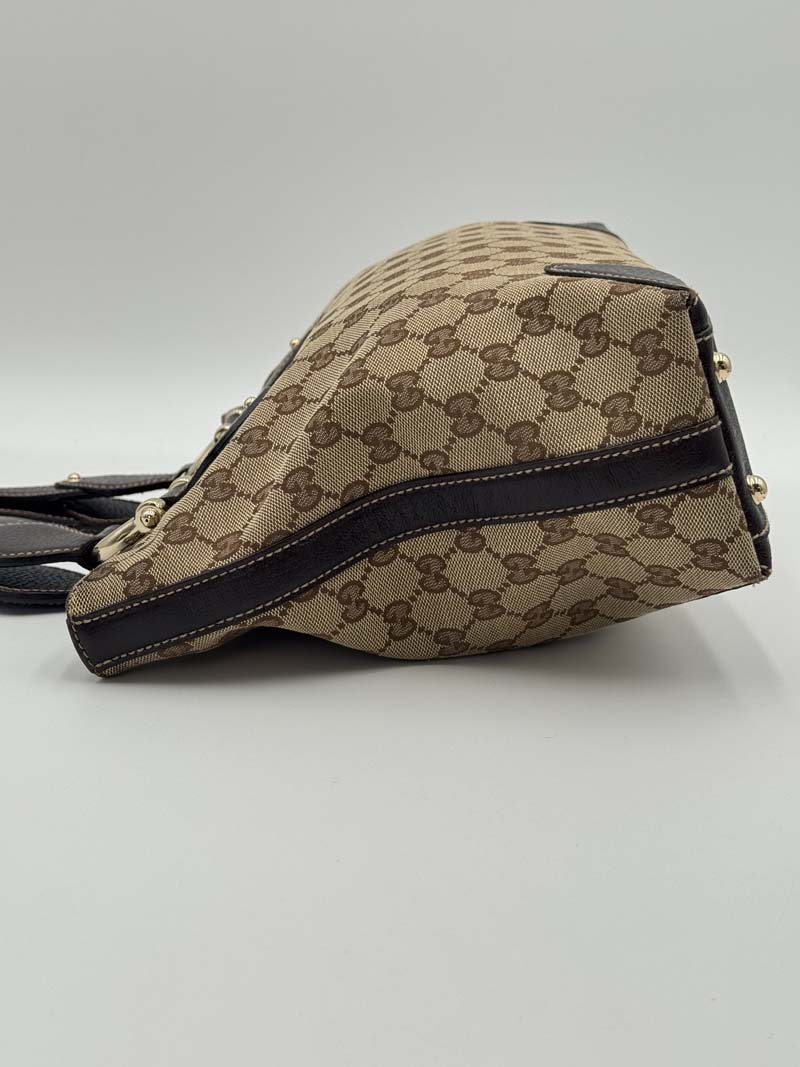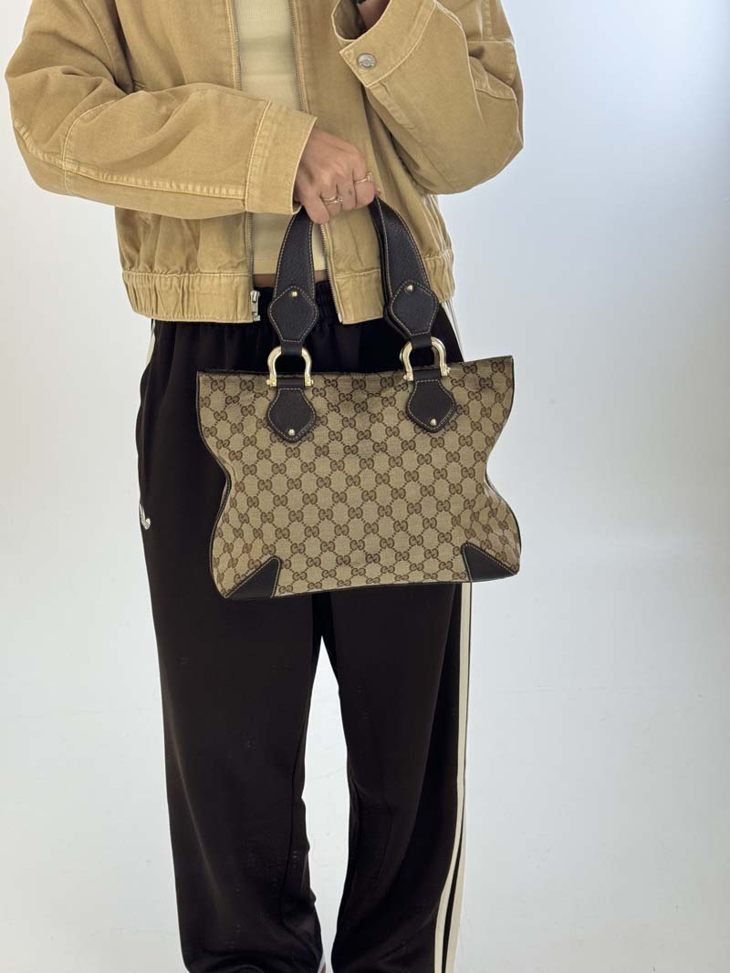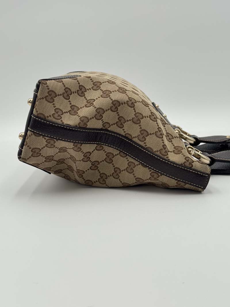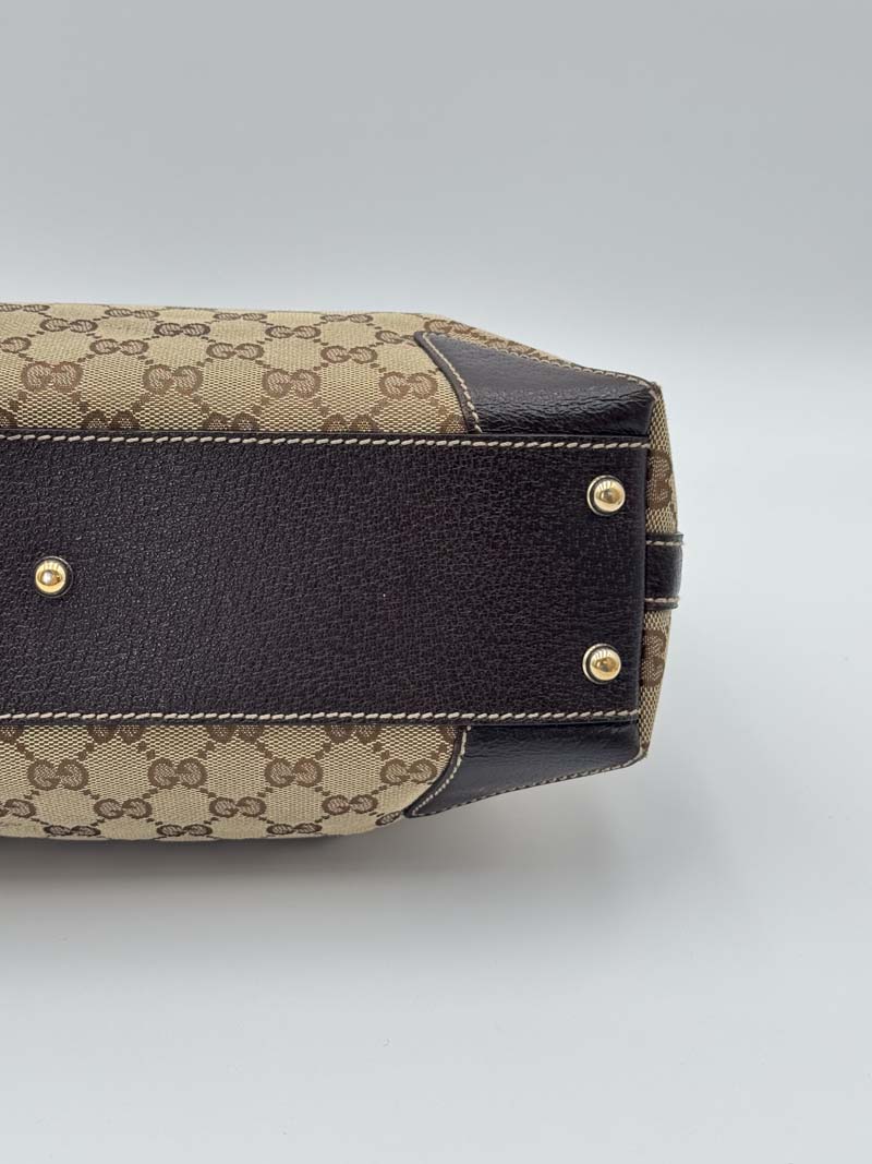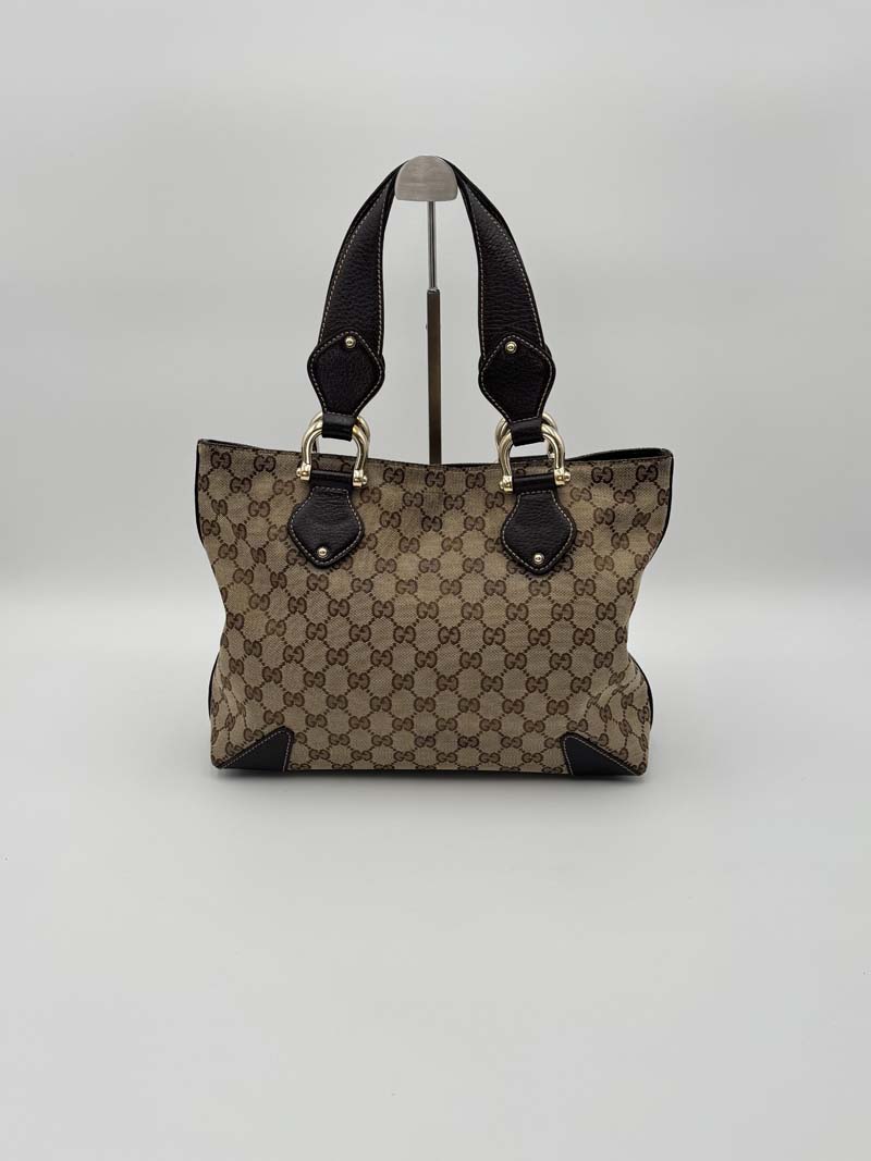This vintage Gucci GG Canvas Horsebit Tote is a shoulder bag made from brown GG canvas with champagne hardware. The item shows some user signs but is still in a very good condition, with light signs of use such as wear on the corners and small scratches on the hardware. The interior is clean and features an extra clean pocket, and the bag has a magnetic button closure. Dimensions: 35 x 25 x 8 cm. The serial number is 153024 002122.