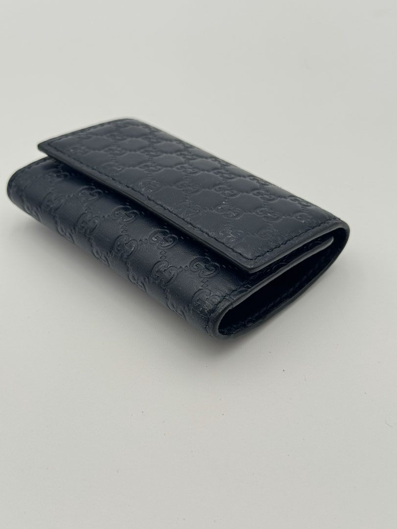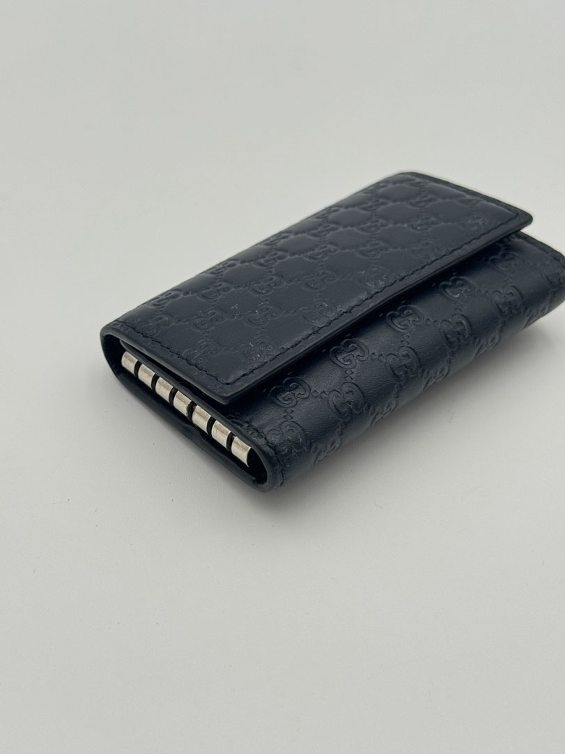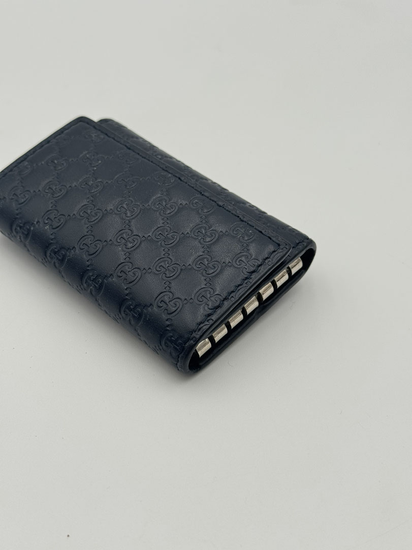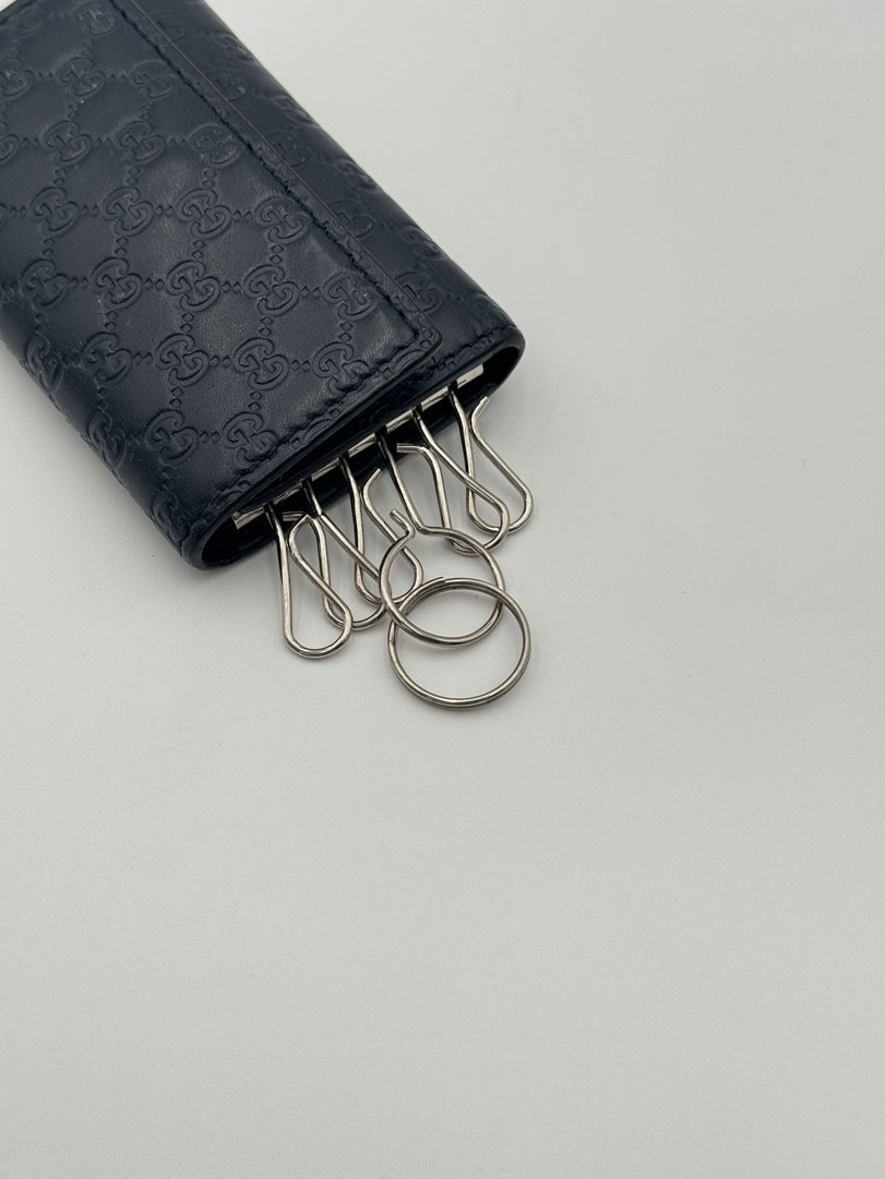 This vintage Gucci GG Canvas Key Case is made from navy GG canvas with silver-tone hardware. The item is in very good condition, showing minimal signs of use such as slight wear on the corners. It features six key rings and one interior pocket. The dimensions are 9 x 6 cm.