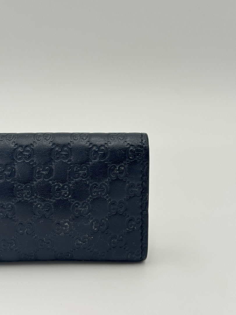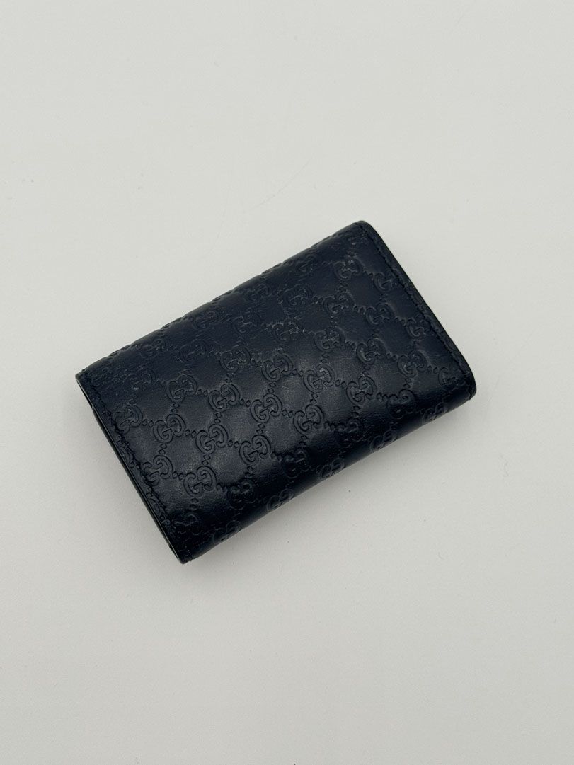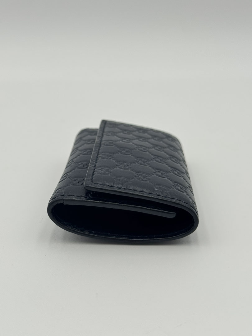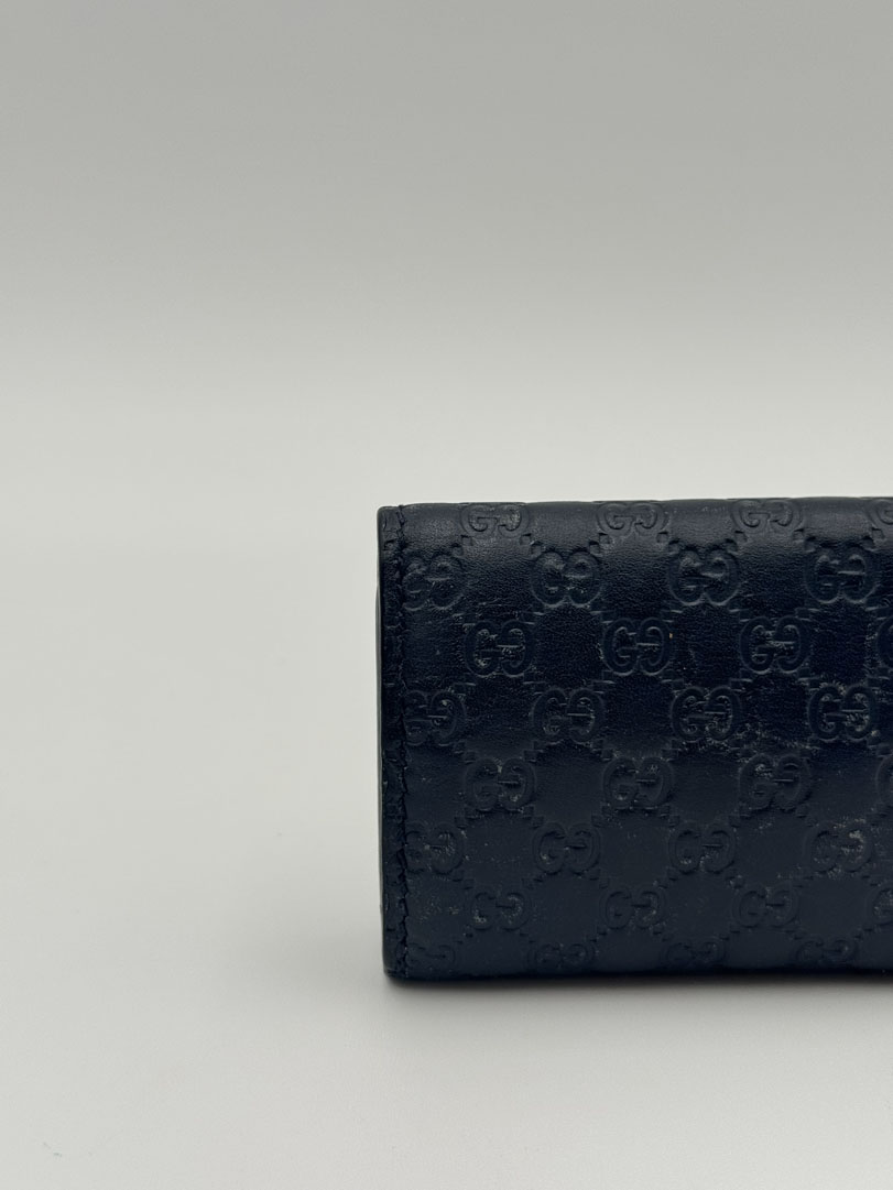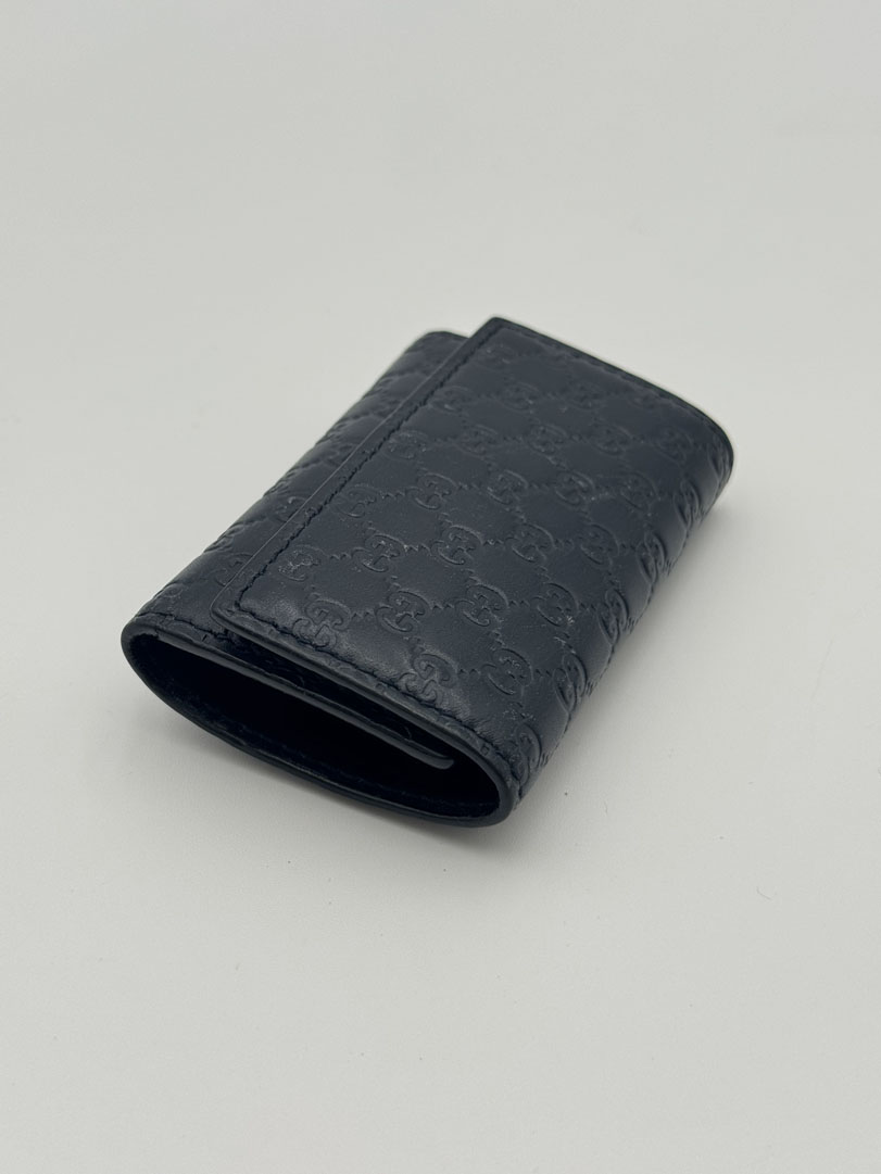 This vintage Gucci GG Canvas Key Case is made from navy GG canvas with silver-tone hardware. The item is in very good condition, showing minimal signs of use such as slight wear on the corners. It features six key rings and one interior pocket. The dimensions are 9 x 6 cm.