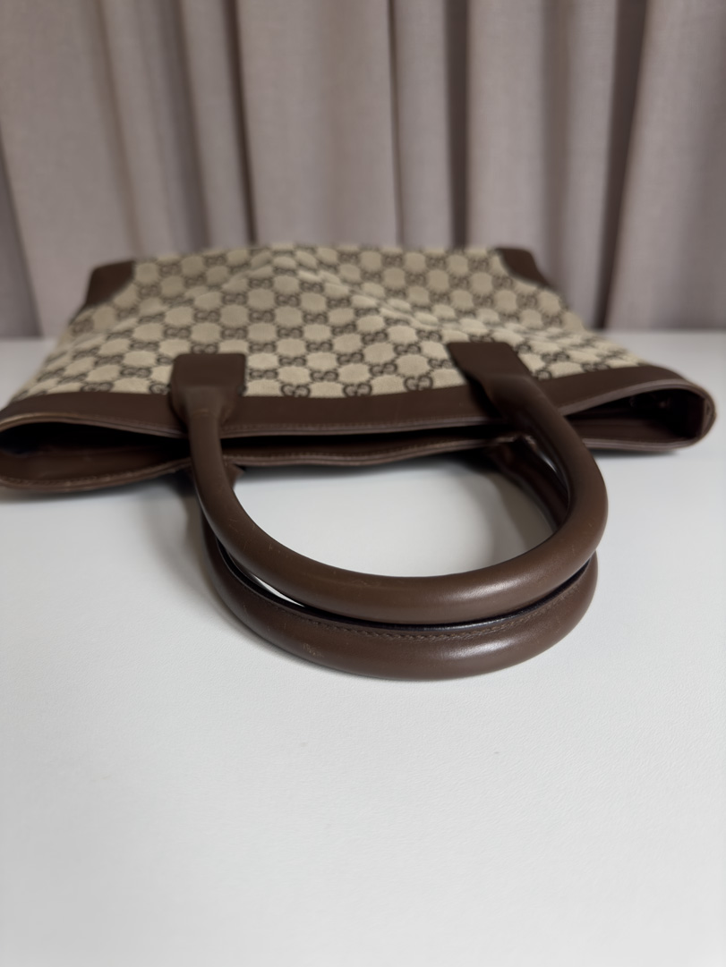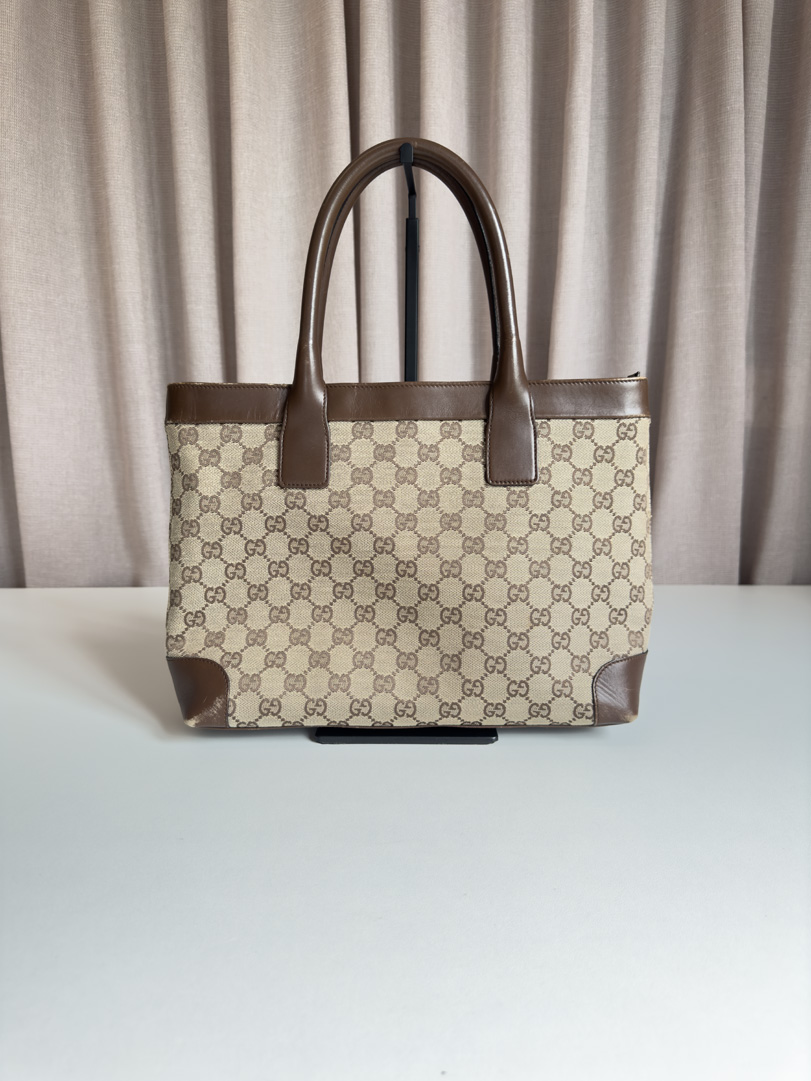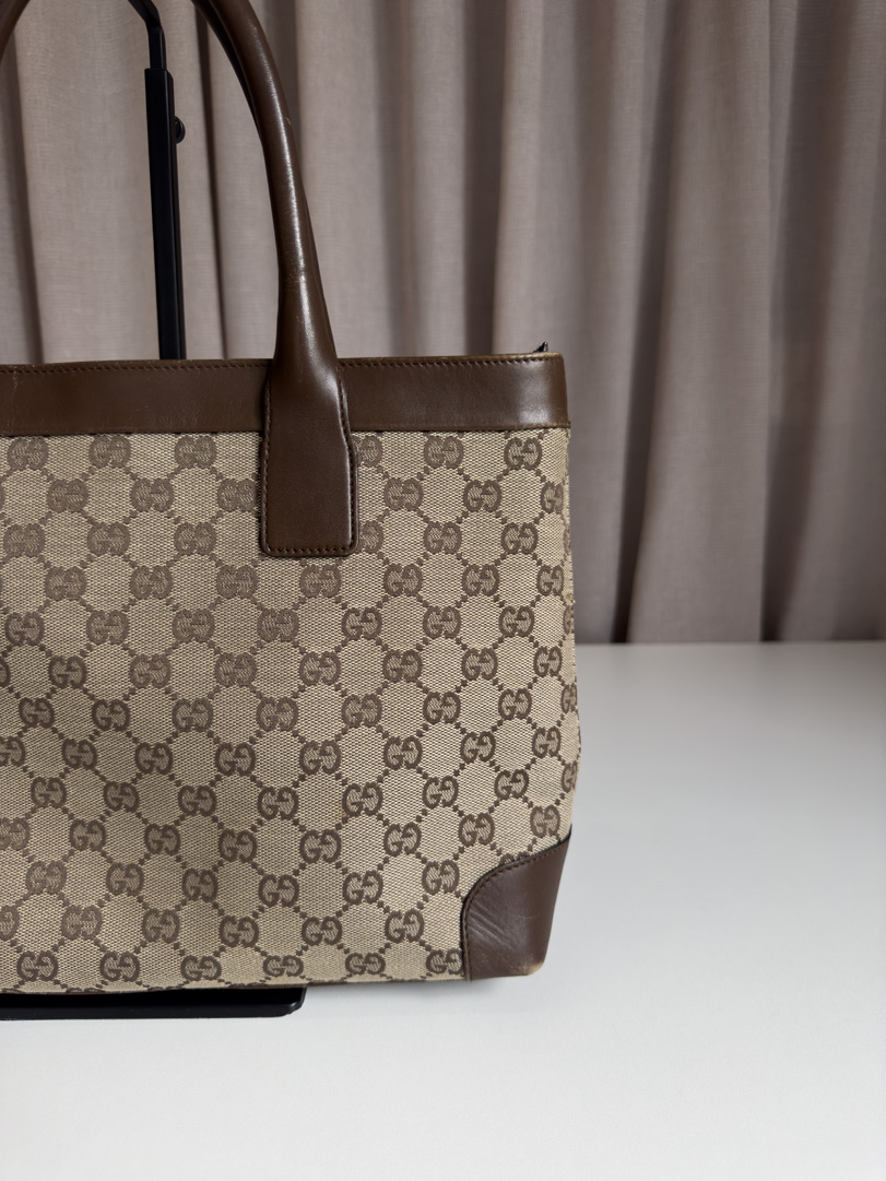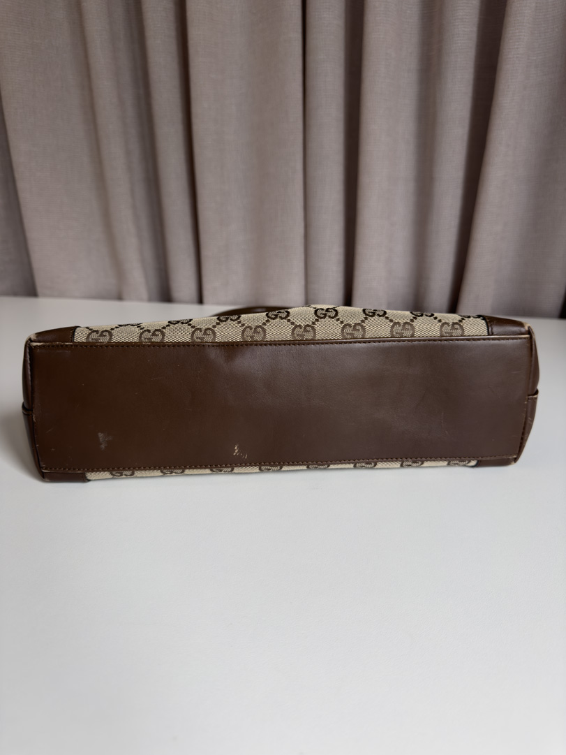 This vintage Gucci GG Canvas Shoulder Bag is crafted from brown GG canvas with brown leather and silver-tone hardware. It’s in good condition, with visible wear on the corners but overall still in nice shape. The bag closes with a zipper and has a clean interior, including a small zipped pocket inside. Serial number: 211191705. Dimensions: 30 x 24 x 9 cm.